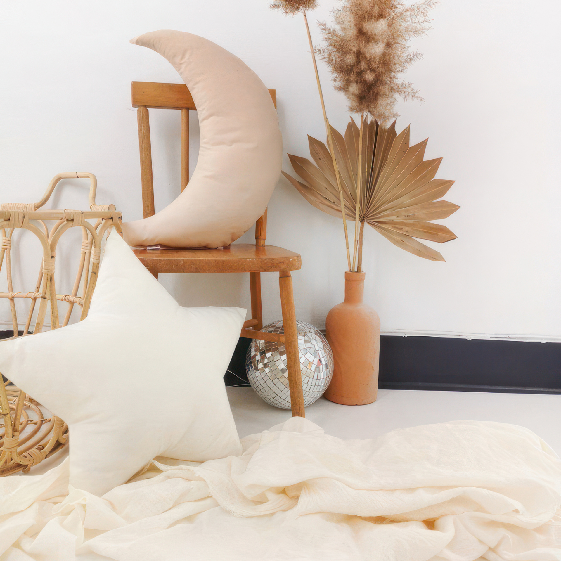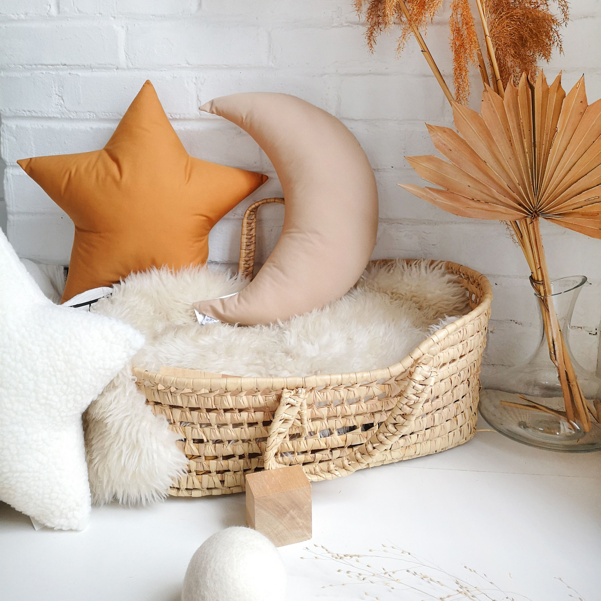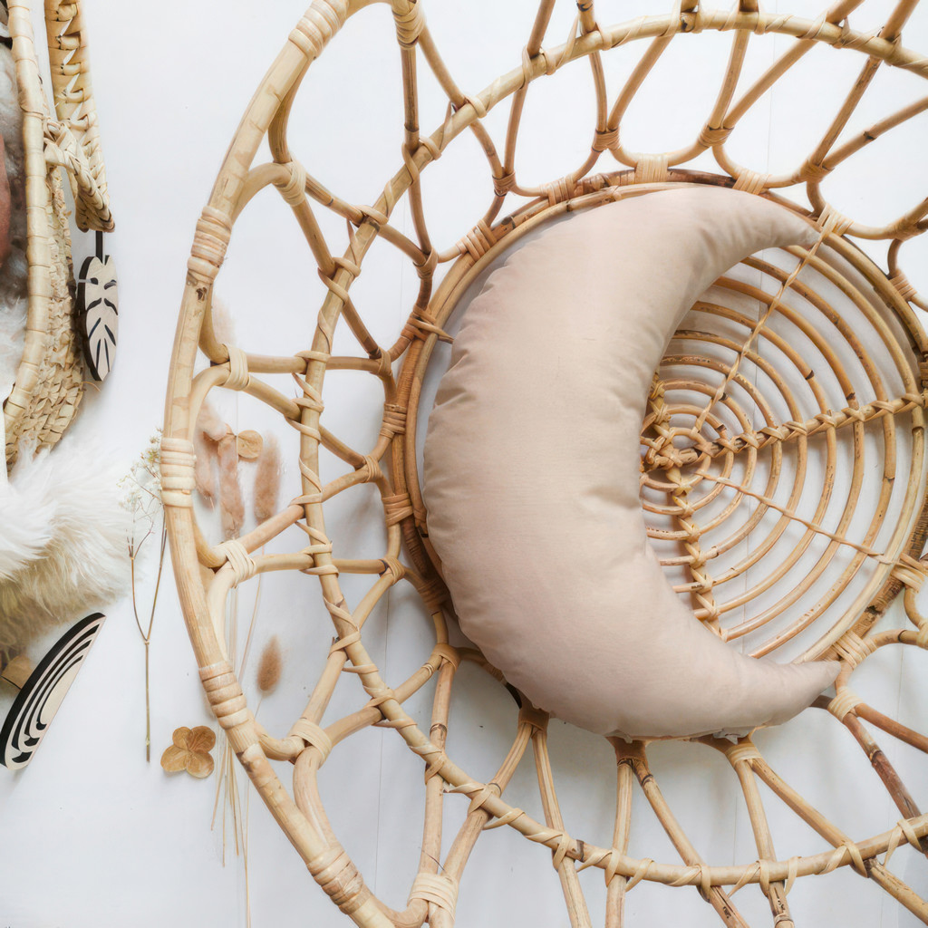 Tiny decorative pillows in the shape of a moon.