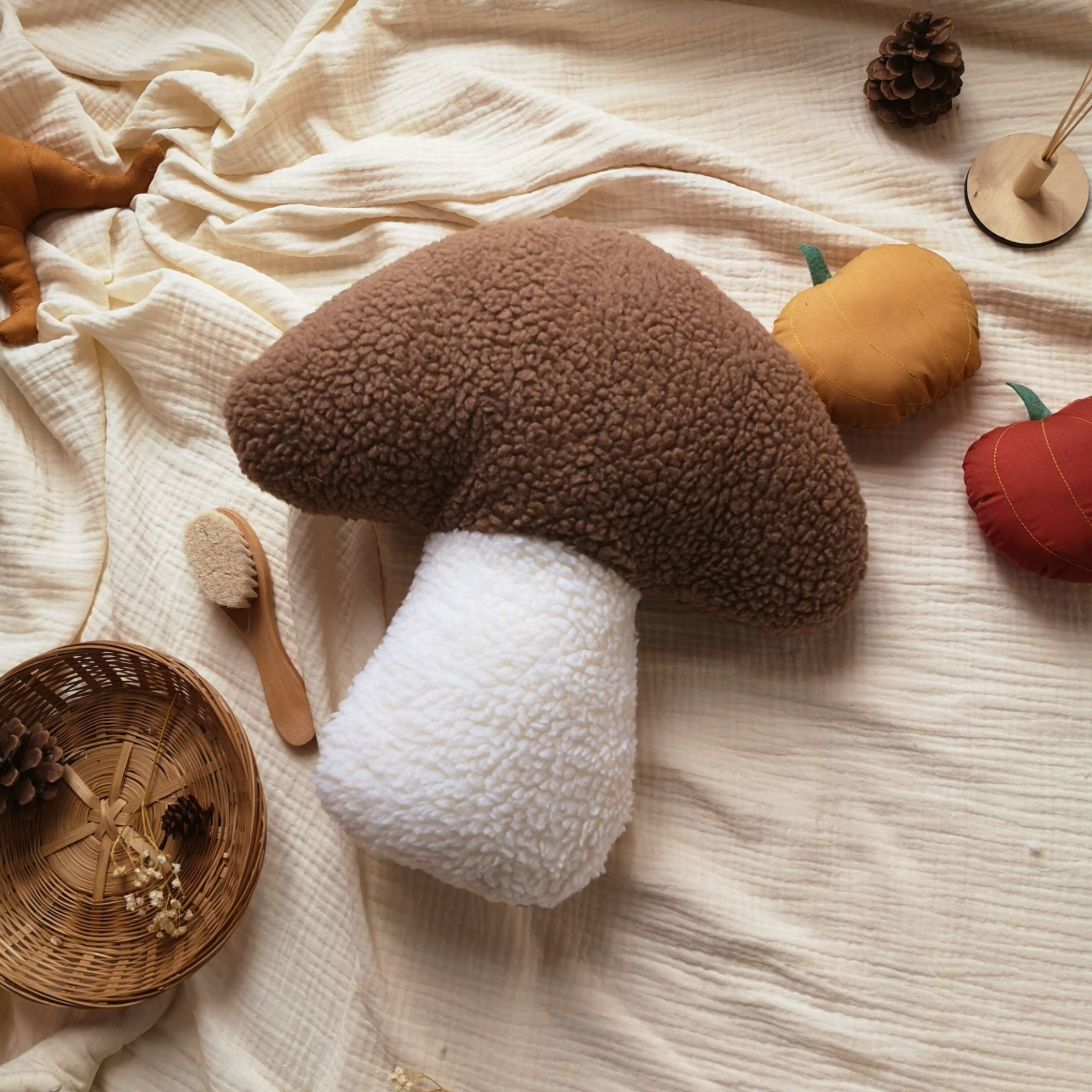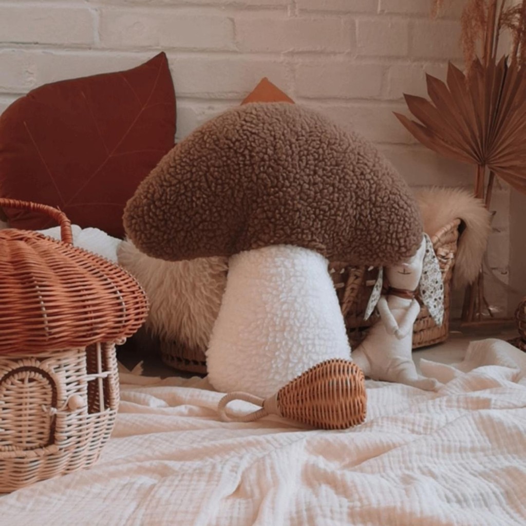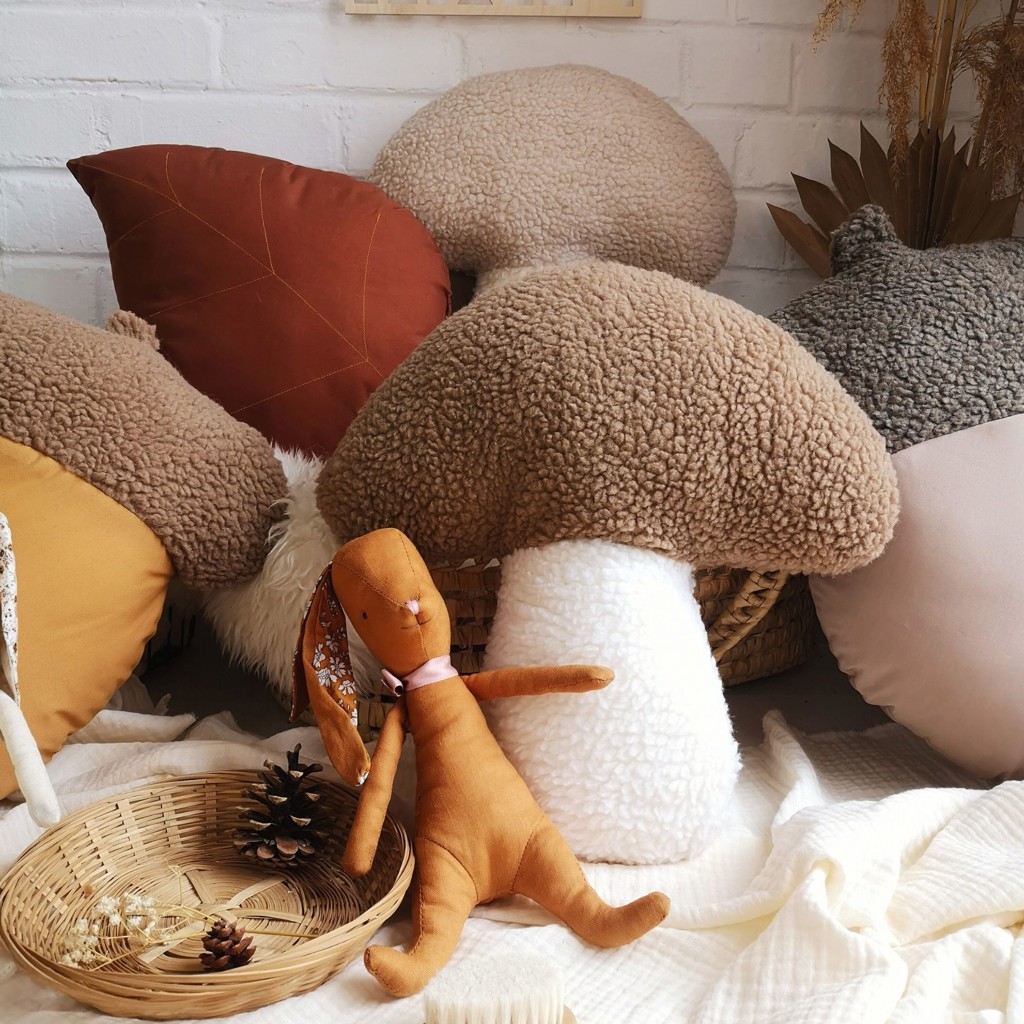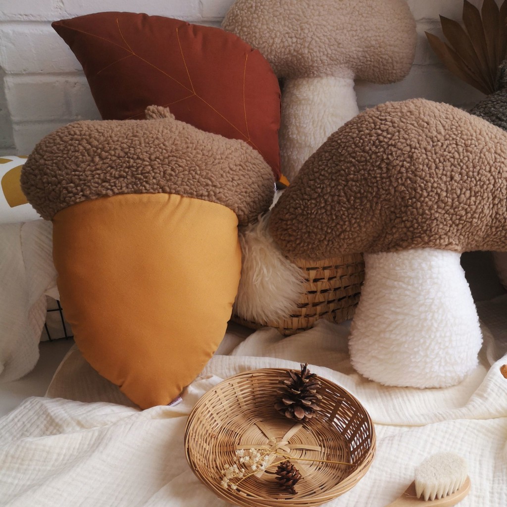 Plush mushroom cushion inspired by shiitakes. The perfect cushion for autumn decoration.