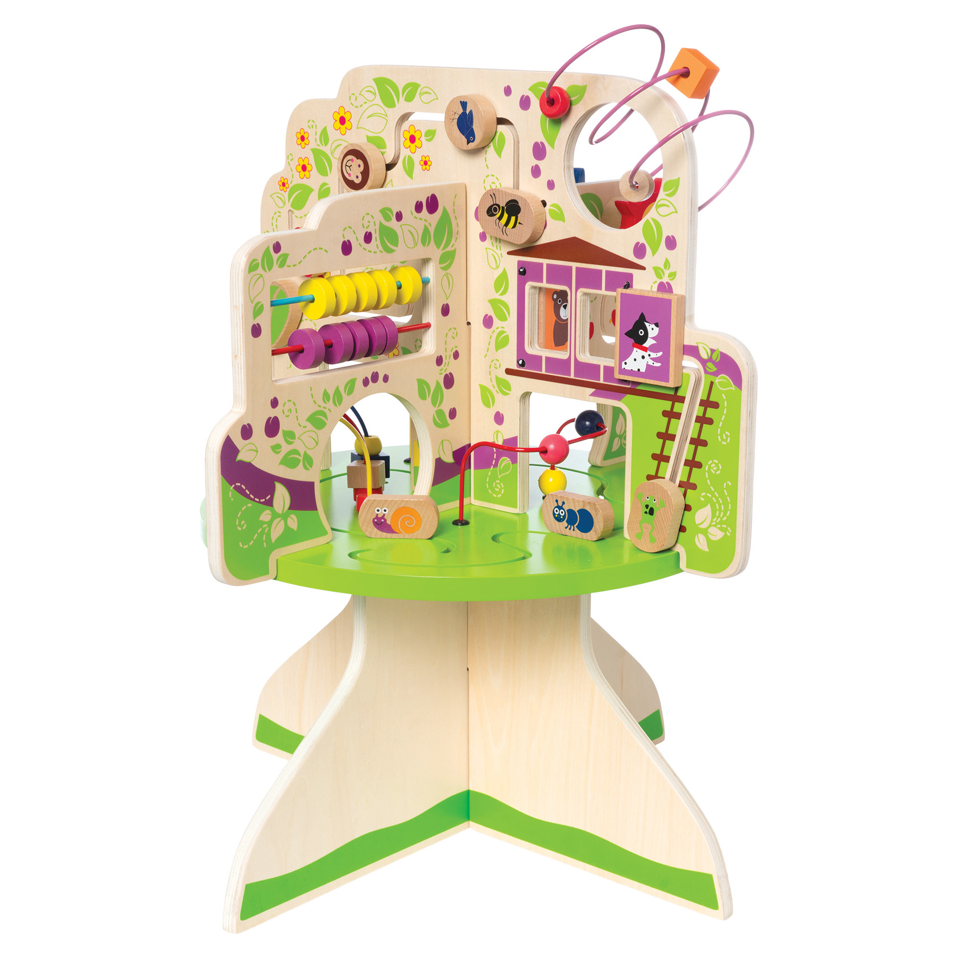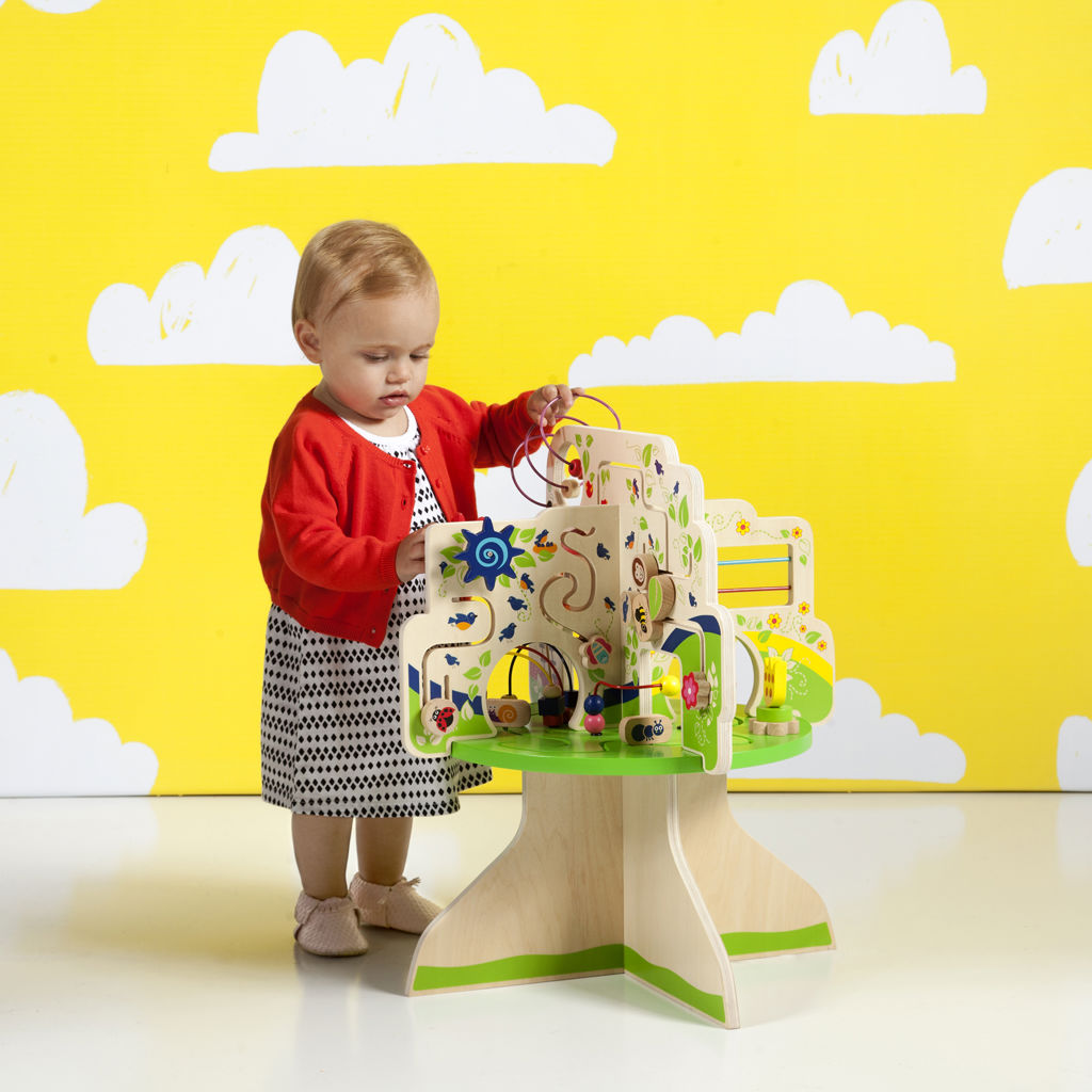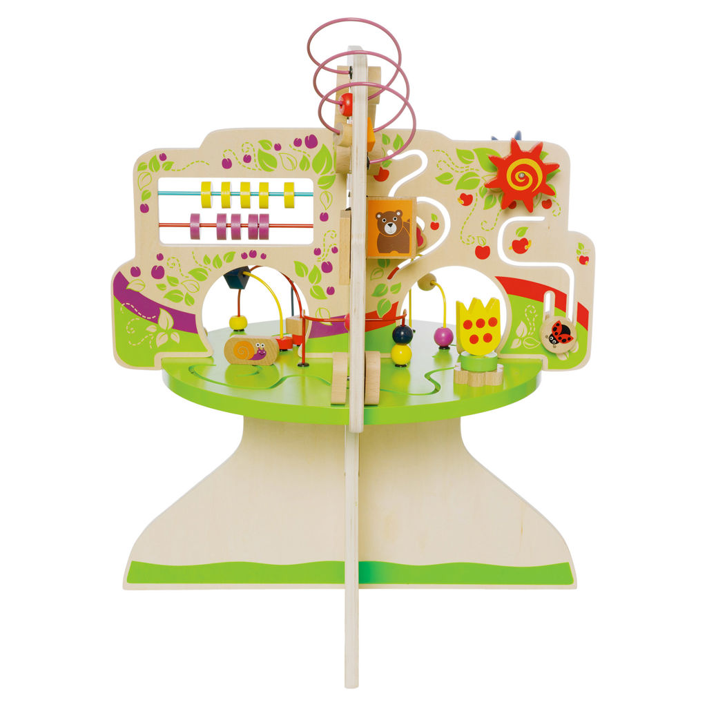 This wood activity center is packed full of exciting features! Includes 4 quadrants in the shape of a tree with a variety of activities for baby : 6 tracks with animal-themed gliders, spinners, colorful bead runs and clacking bead abacus.