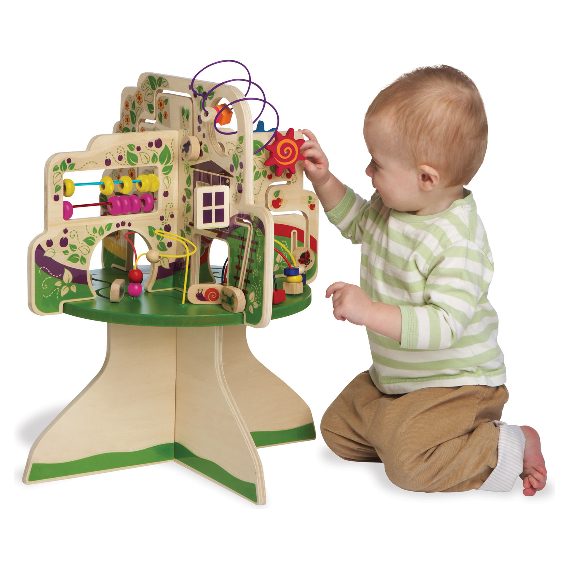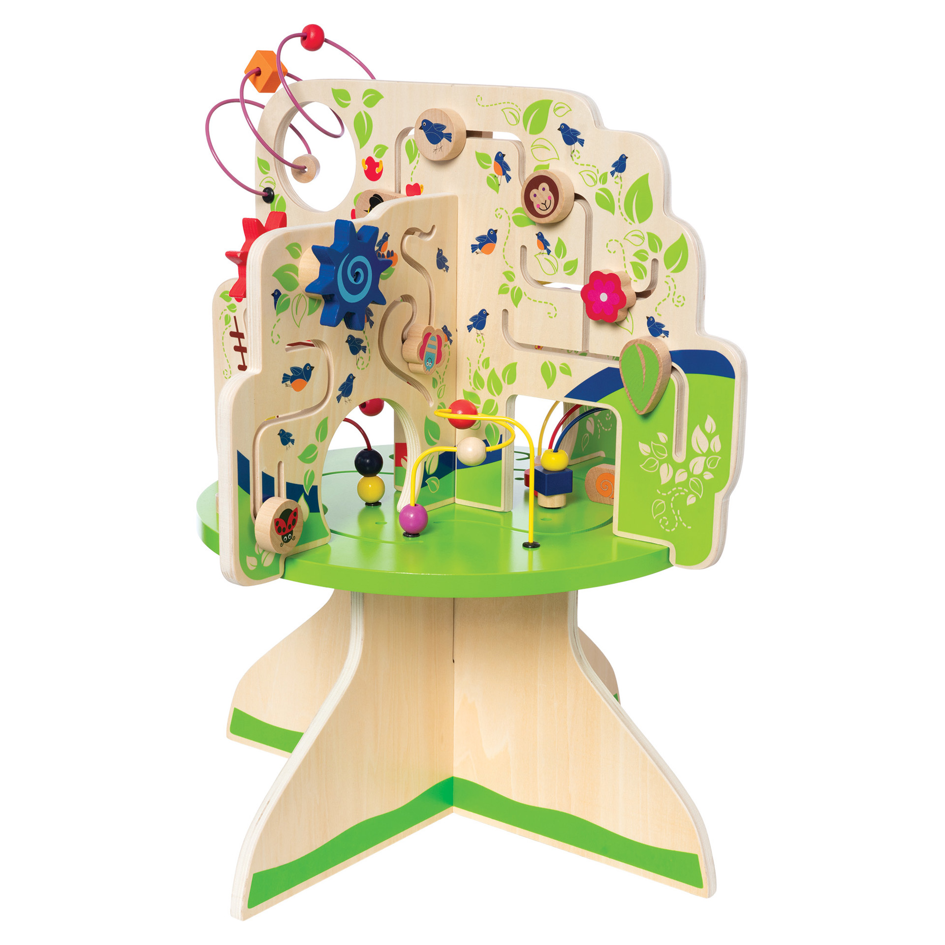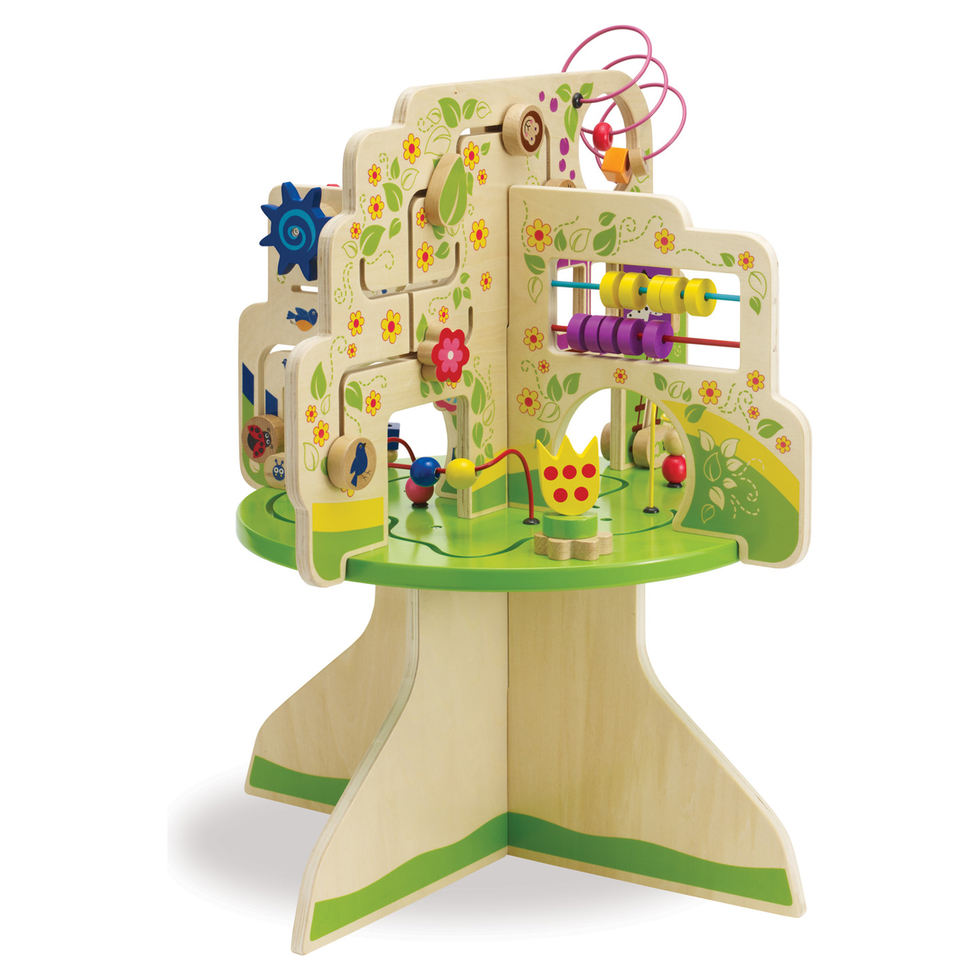 This wood activity center is packed full of exciting features! Includes 4 quadrants in the shape of a tree with a variety of activities for baby : 6 tracks with animal-themed gliders, spinners, colorful bead runs and clacking bead abacus.