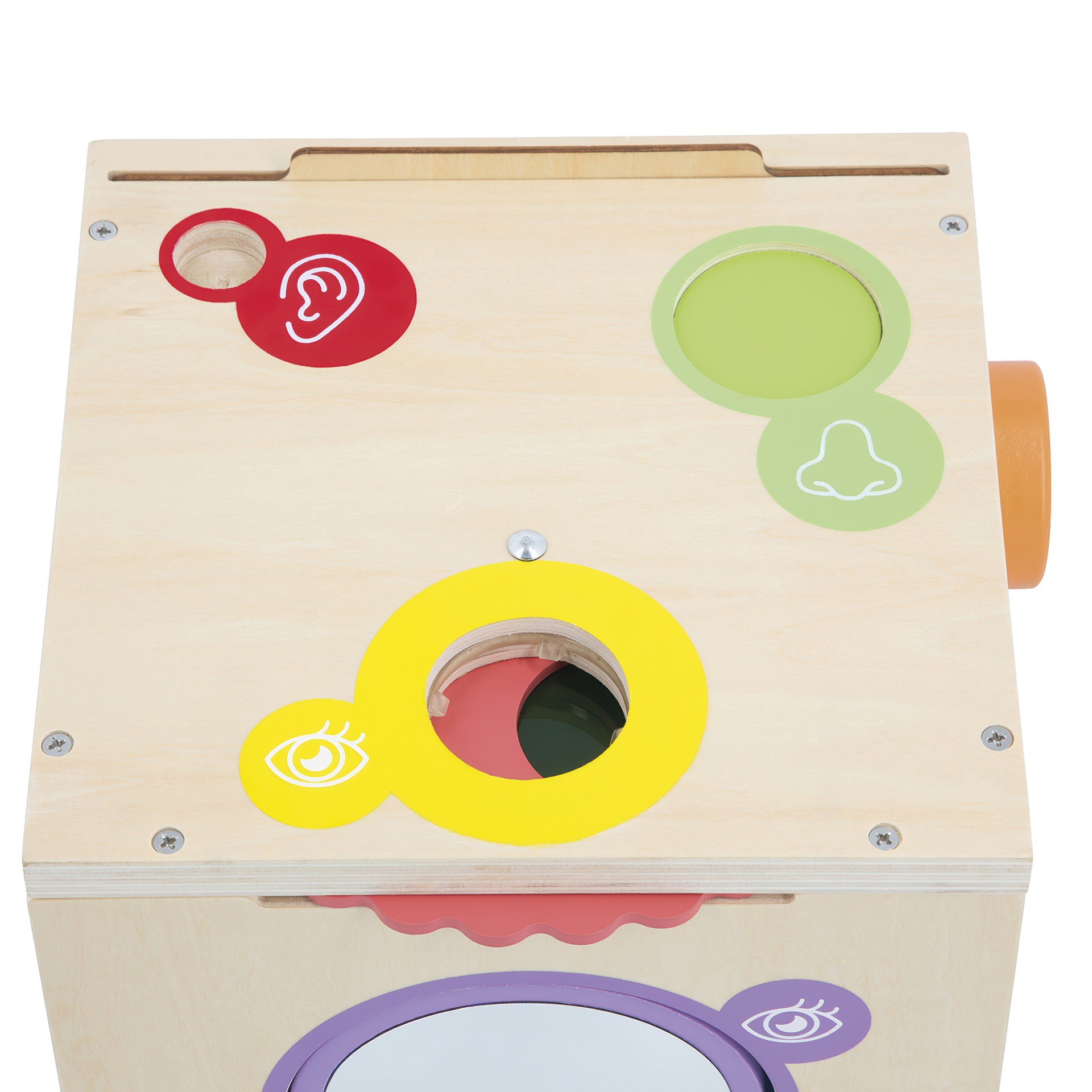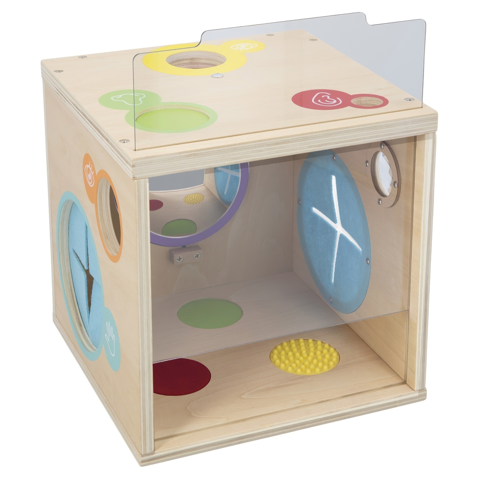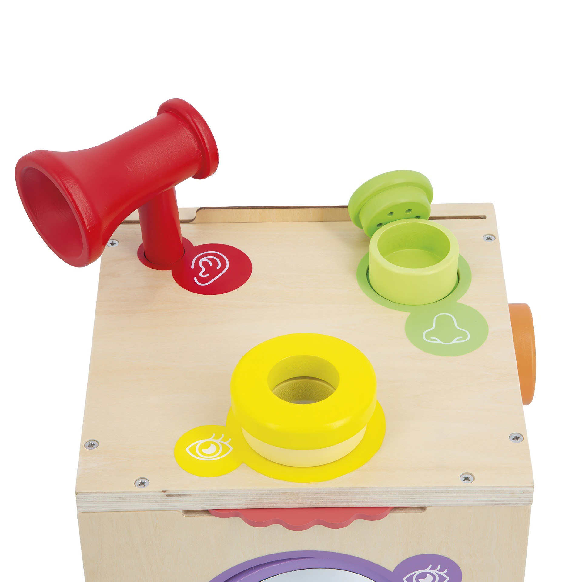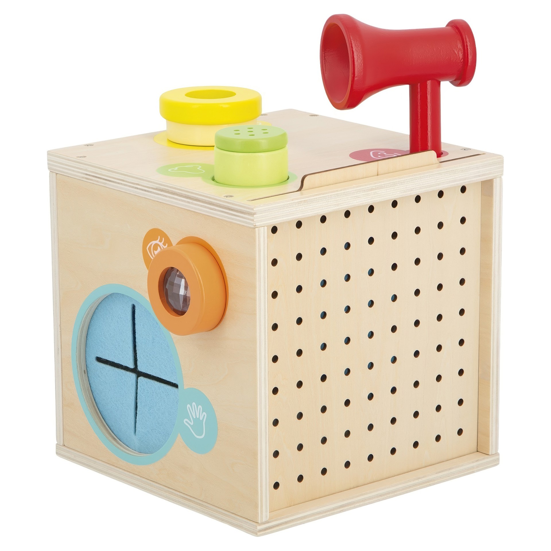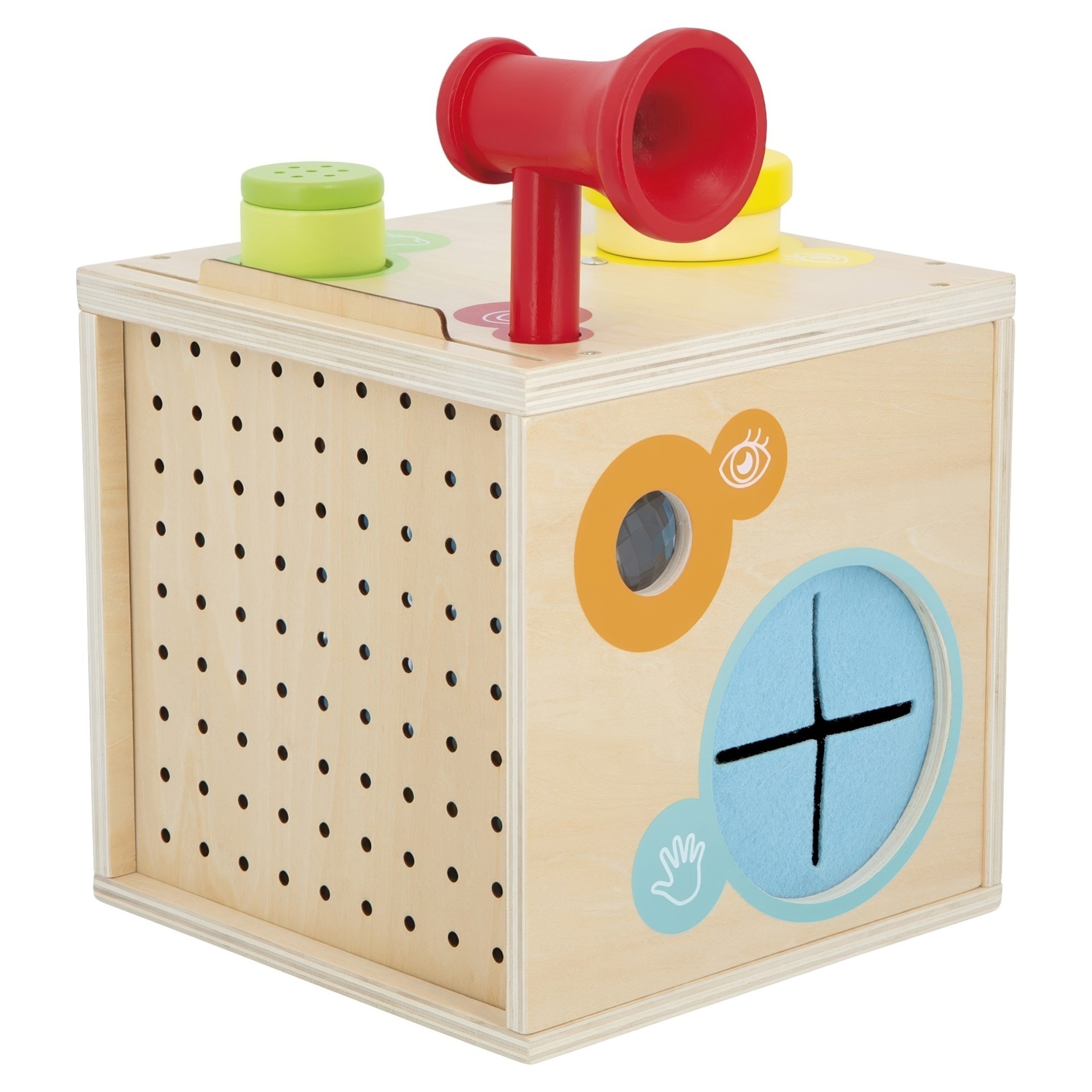 Develop their sense of smell with aromatic herbs. Experience voice amplification with the megaphone. Touch to discover new textures or recognise simple shapes. Look at objects and the surroundings through kaleidoscopes or colour filters. Play with brightness and mirrors.