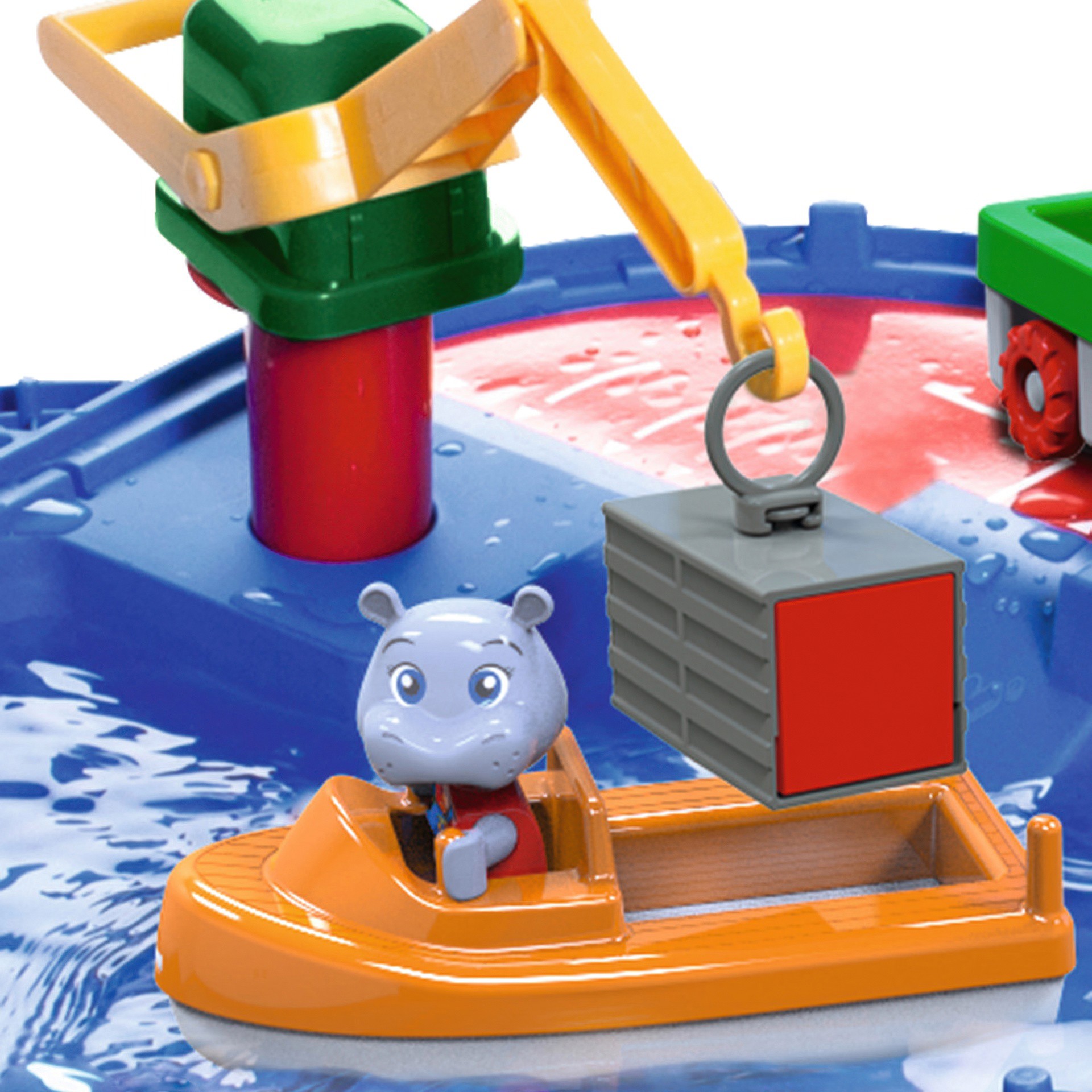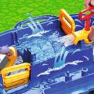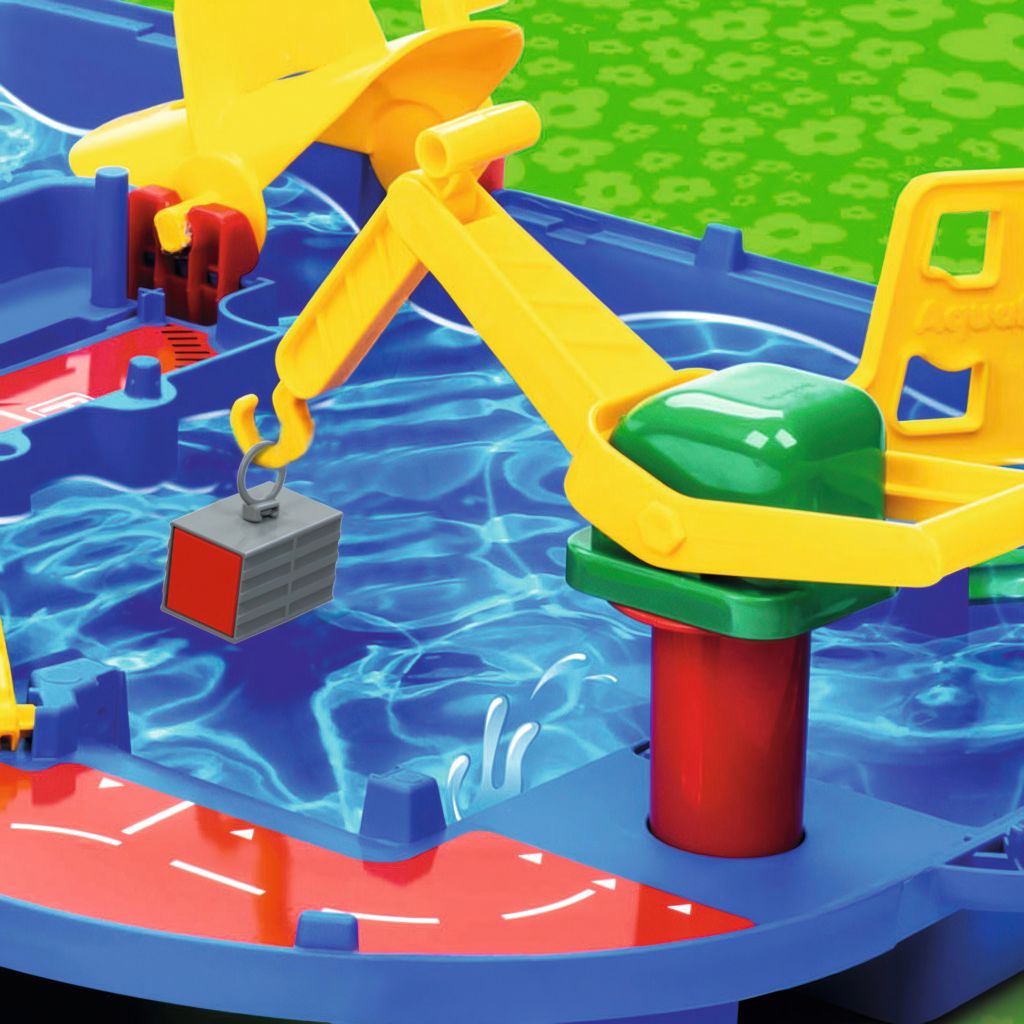 In the harbor, the crane will help you load the container onto the amphibious truck. Turning the paddle wheel, water flows through the canals, a fun way to teach how water moves.