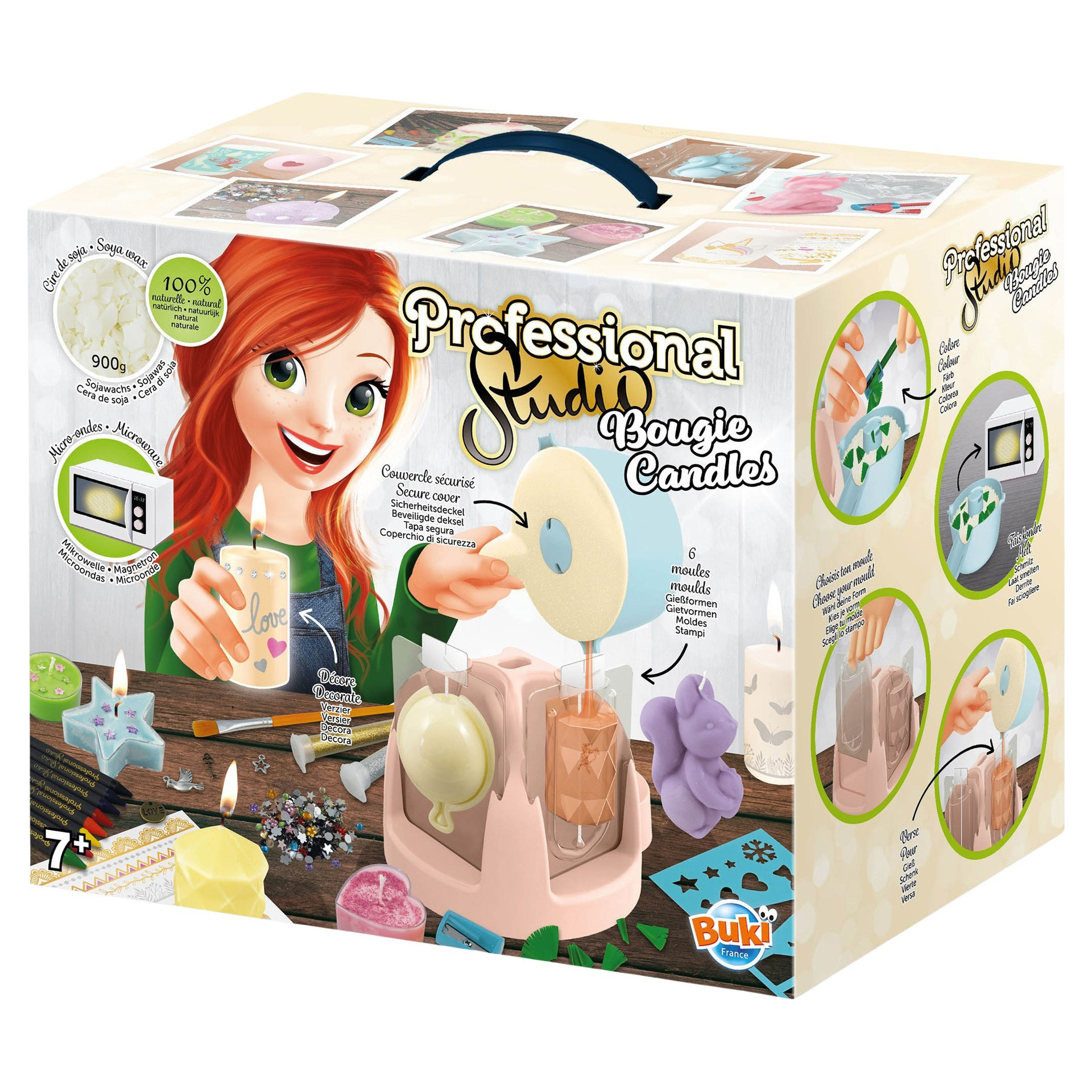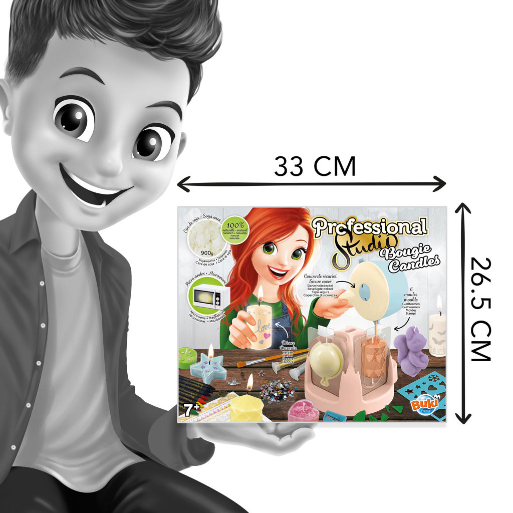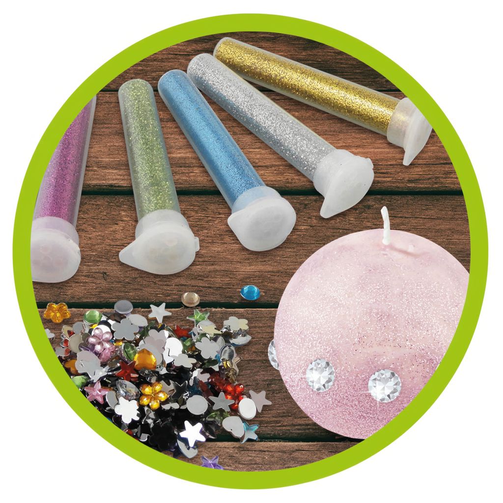 Includes:1 station with 6 transparent moulds, 4 metal cookie cutters, 1 roll of cotton wicks,1 pack of soy wax, 5 pendants, 8 wax crayons., 1 pencil sharpener. 1 brush, 5 tubes of glitter, transfers, 1 stencil and 1 full-colour illustrated leaflet.