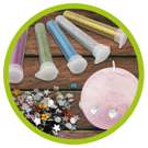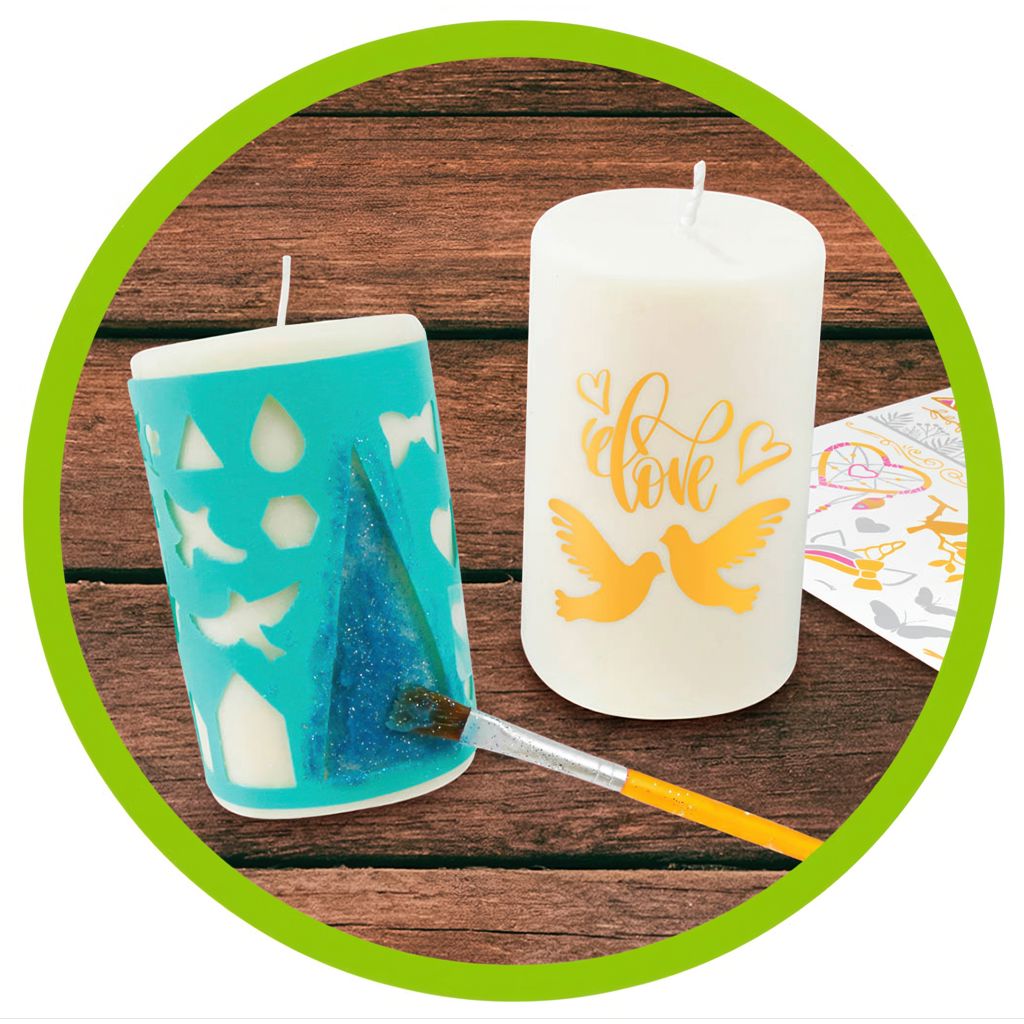 Use the rhinestones, pen and coloured wax to personalise your candles. Wrap a pendant and hide it in the candle for an original gift!