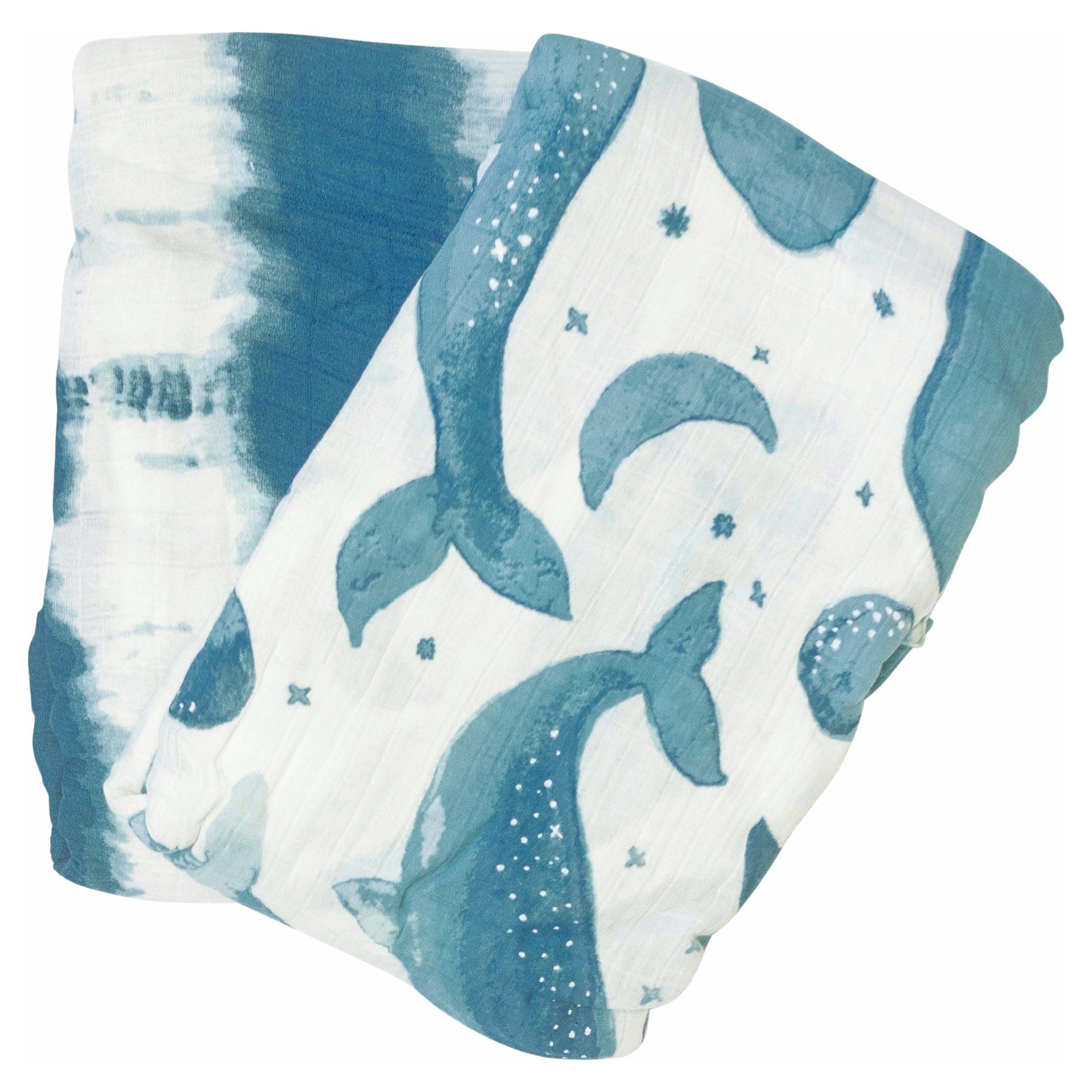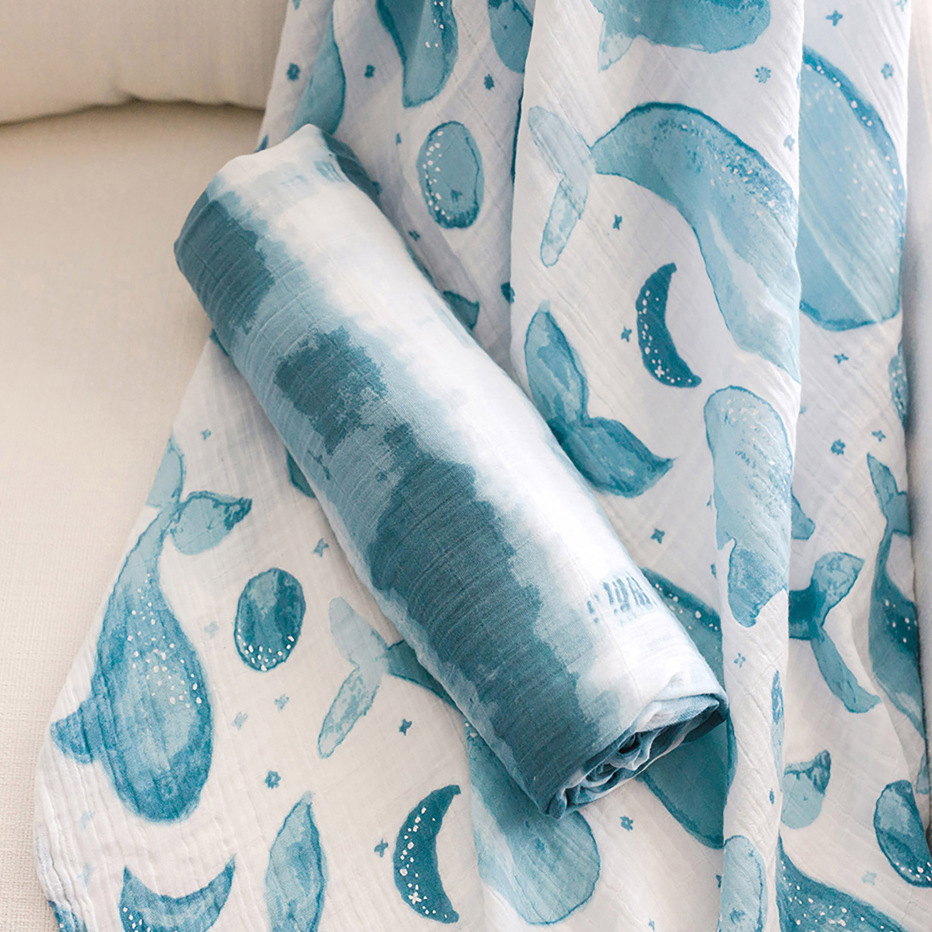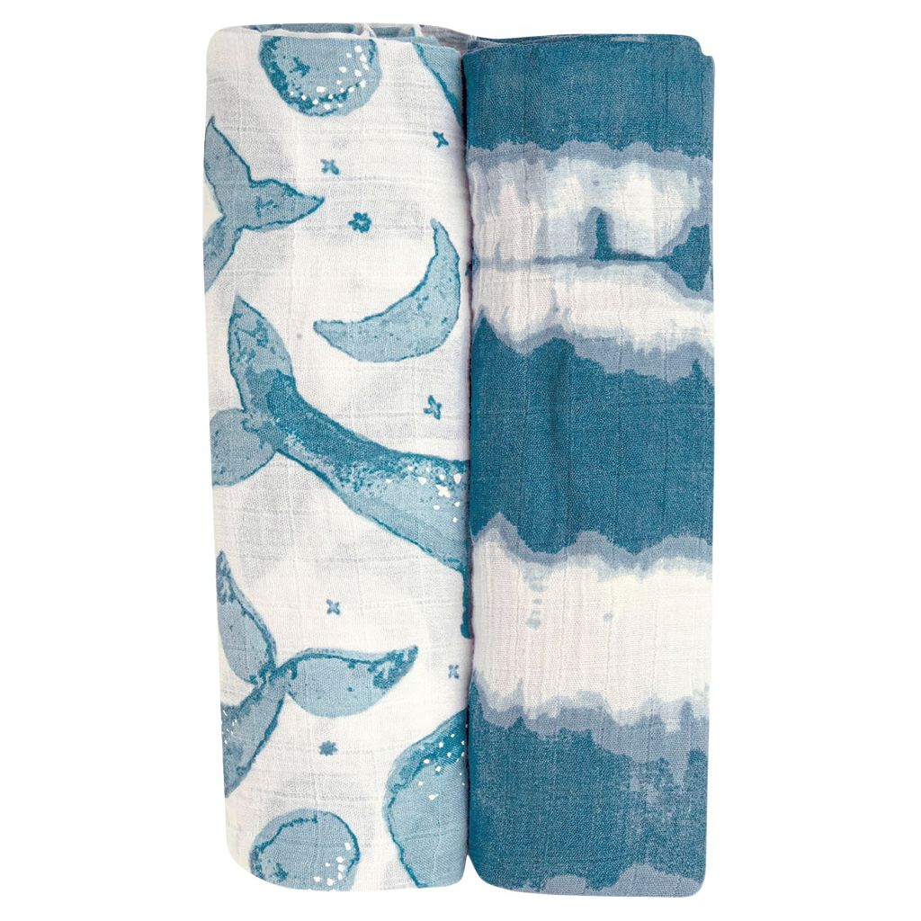 This beautiful two pack of muslin swaddle blankets will be your new favourite duo. Made in lovely shades of blue and white, these blankets are reminiscent of the ocean and can bring a certain calm to your baby's space.