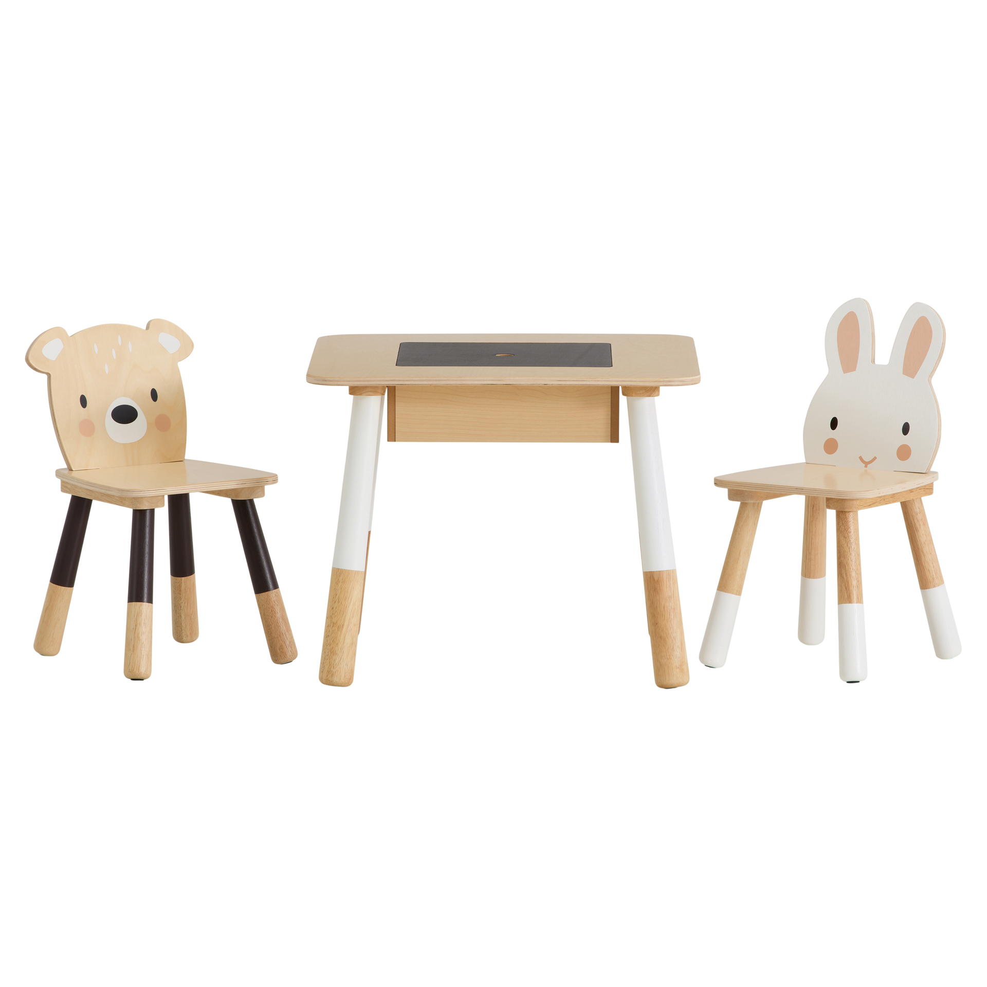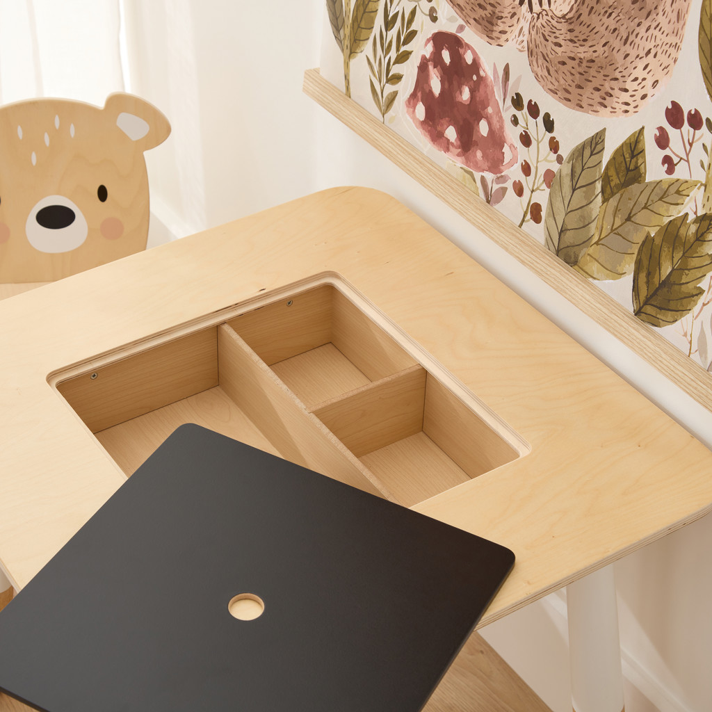 A stylish plywood table with a hidden compartment for crayons etc. under a chalkboard central panel.