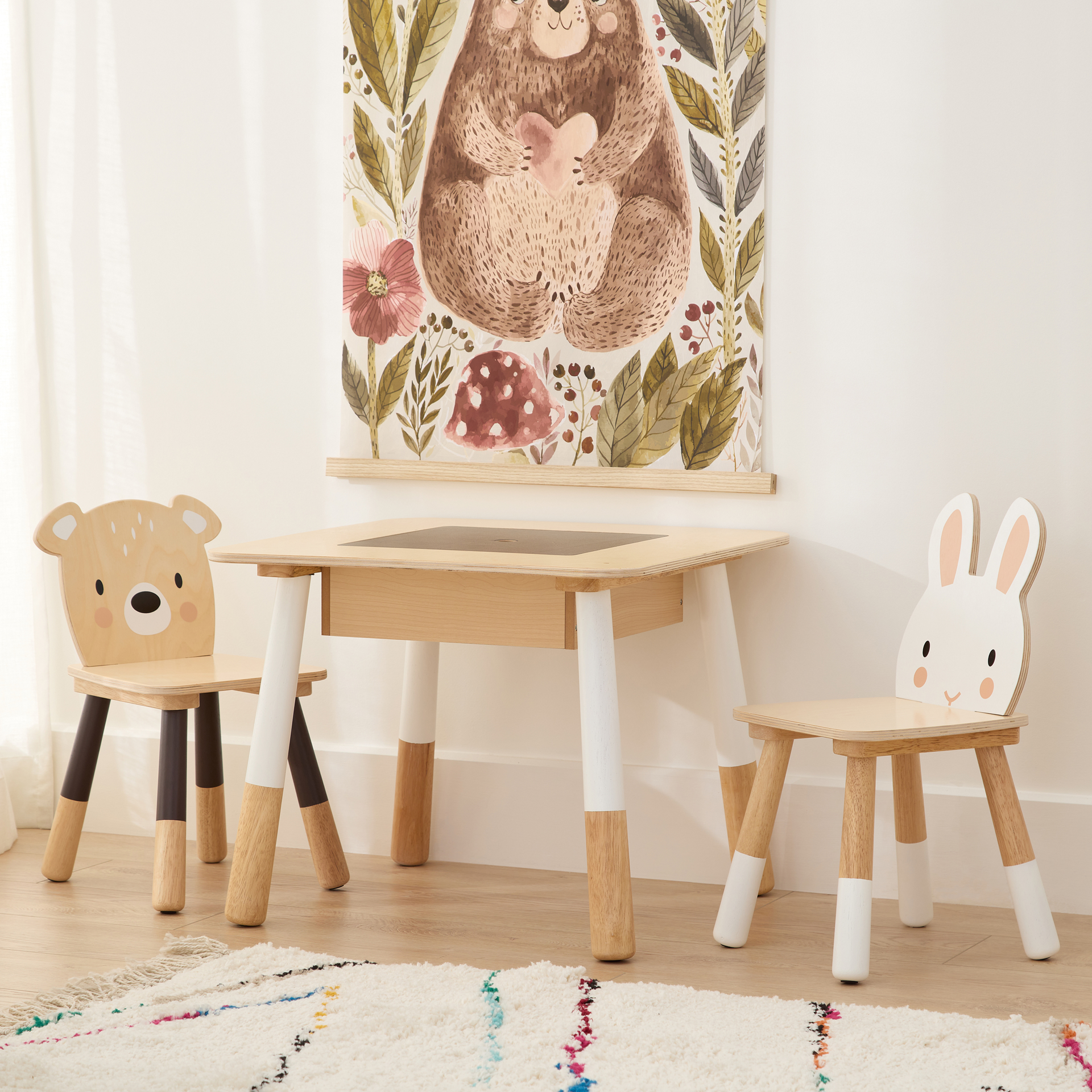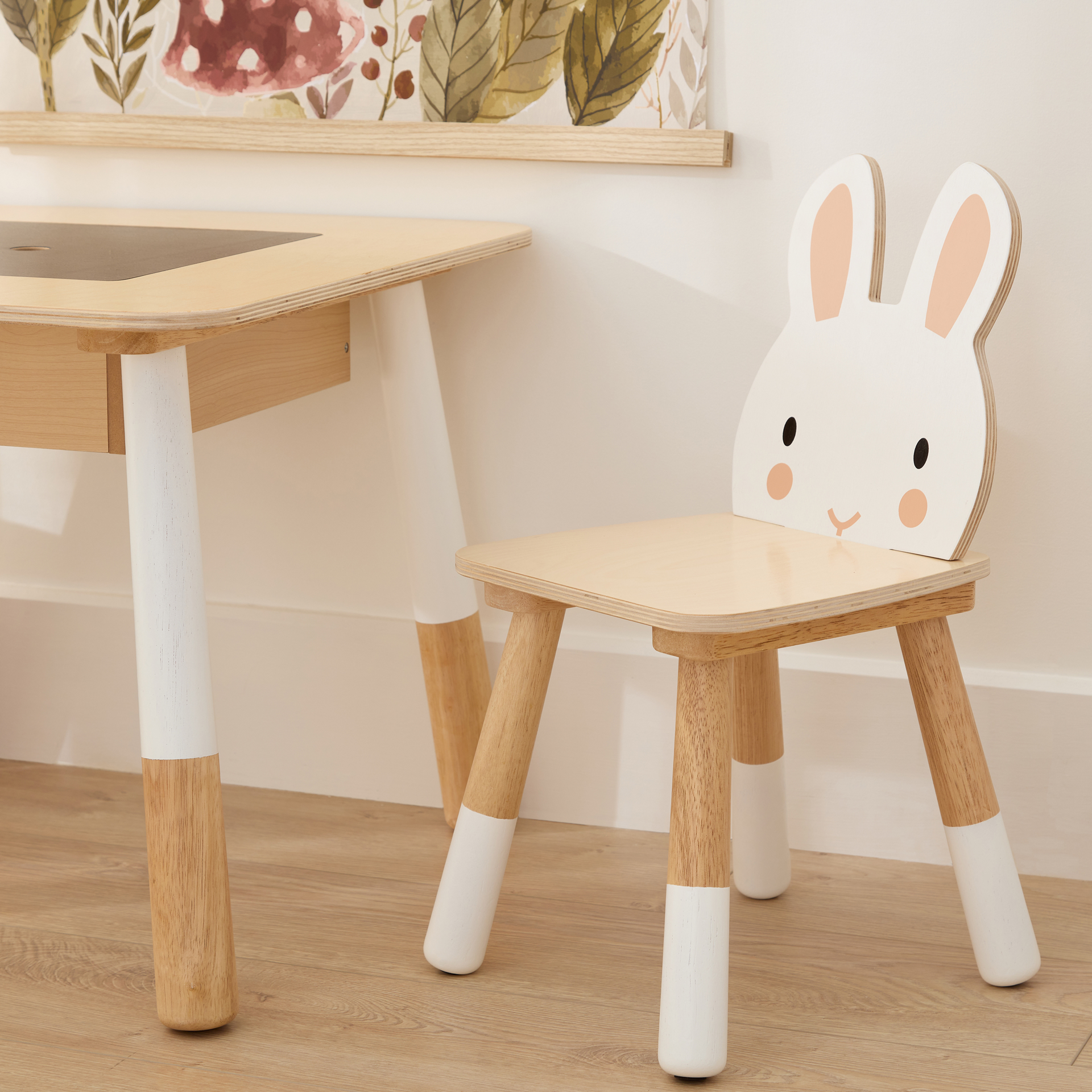 2 plywood chairs, rabbit and bear themed.