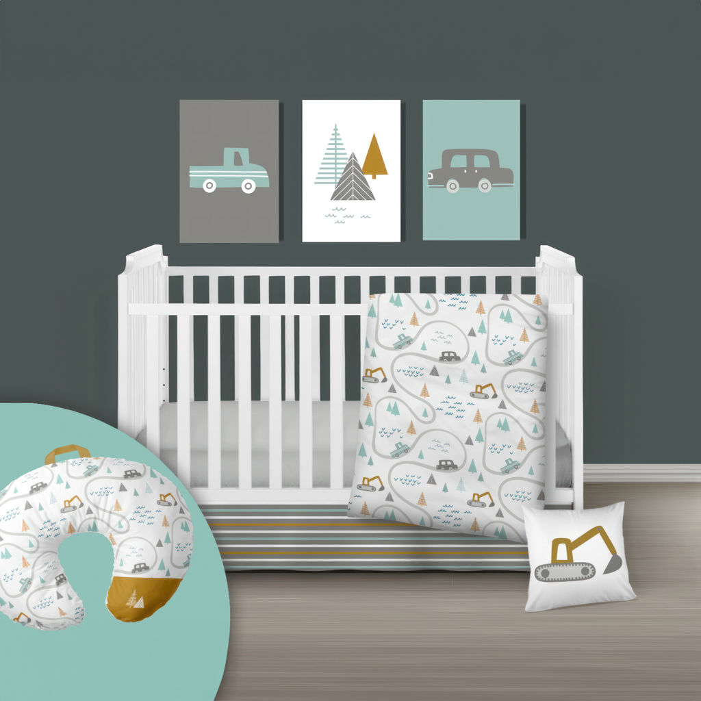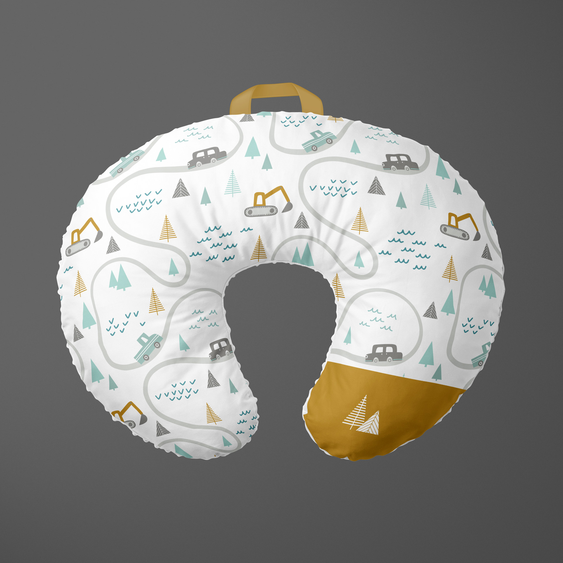 Breastfeeding pillow in the ROAD TRIP theme. Made in QUEBEC from eco-friendly fabric. Features a carrying strap, zippered pocket and removable cover.