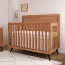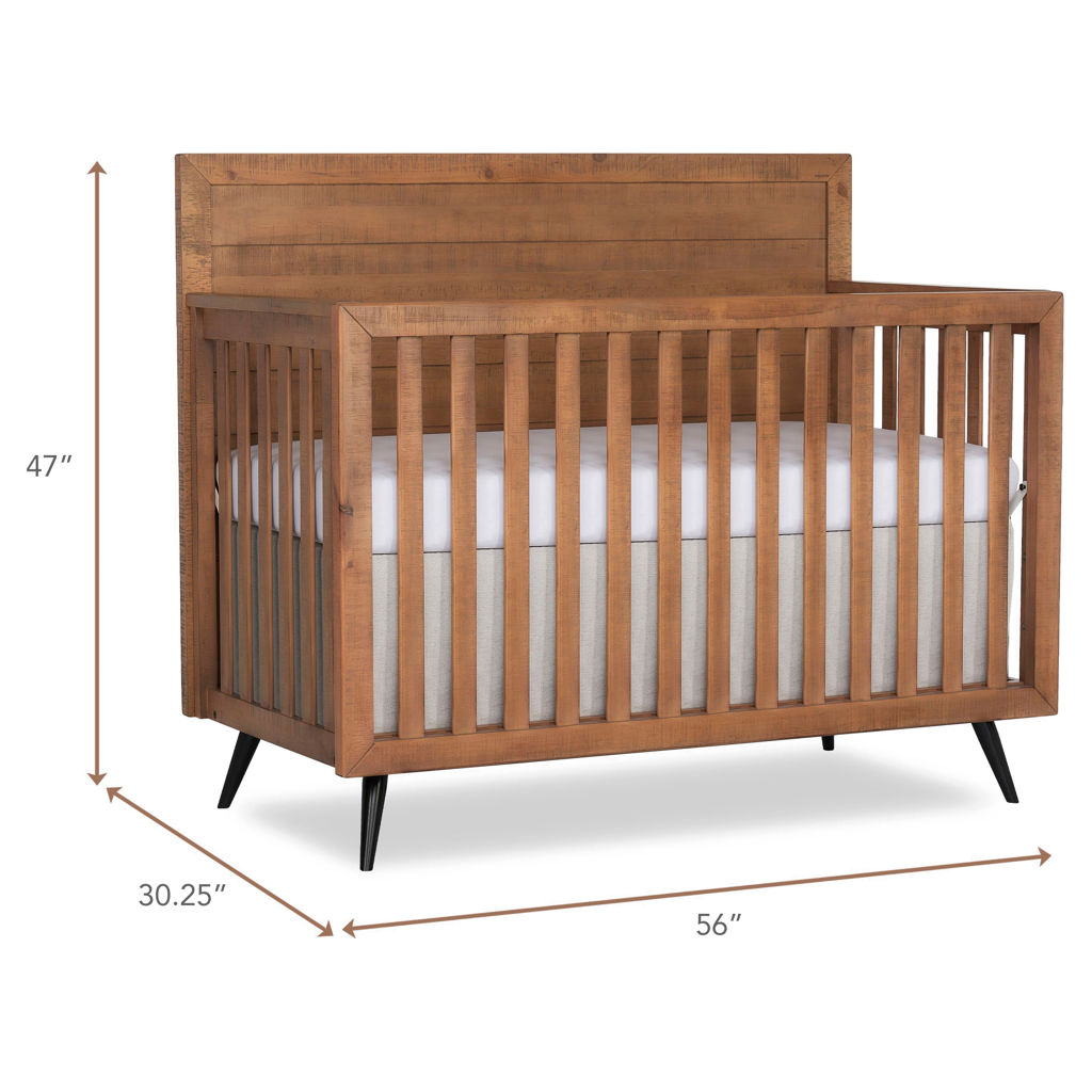 The Evolur Stilnovo 4-in-1 Convertible Crib, embodies mid century modern design with its high full panel headboard, juxtaposing sleek line, miter seams while the flared tapered metal legs adds a playful touch to this sophisticated crib.