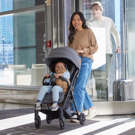 Your child will travel comfortably thanks to a multi-position reclining seat, adjustable calf support and oversized canopy with UV 50 protection and visor.