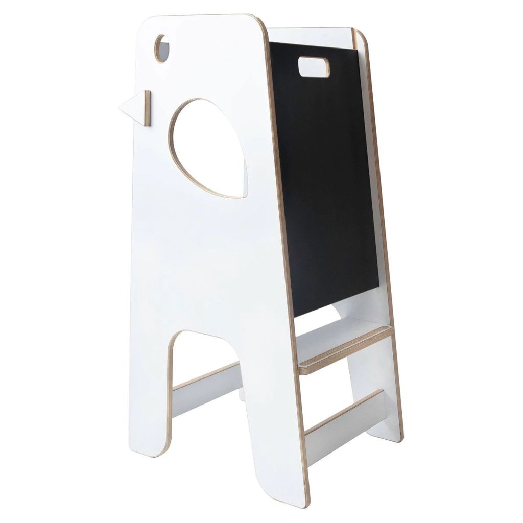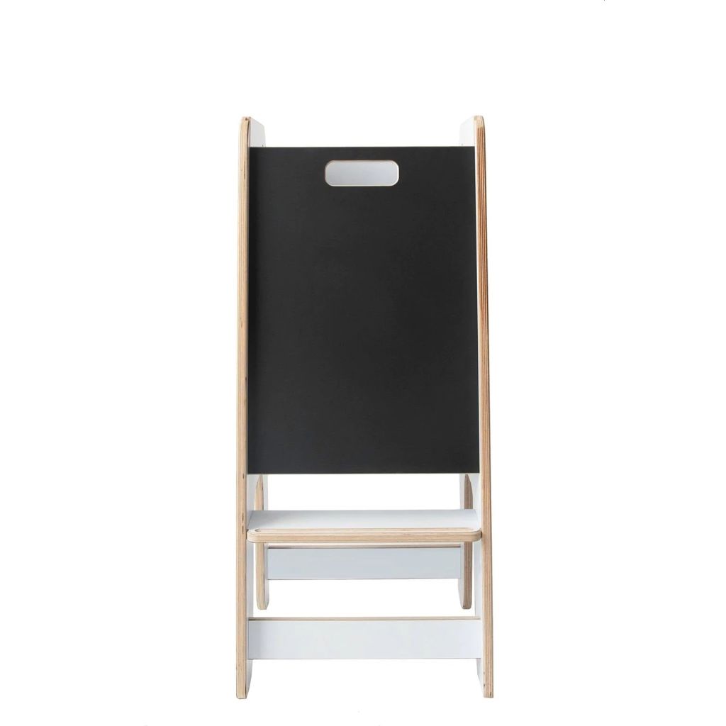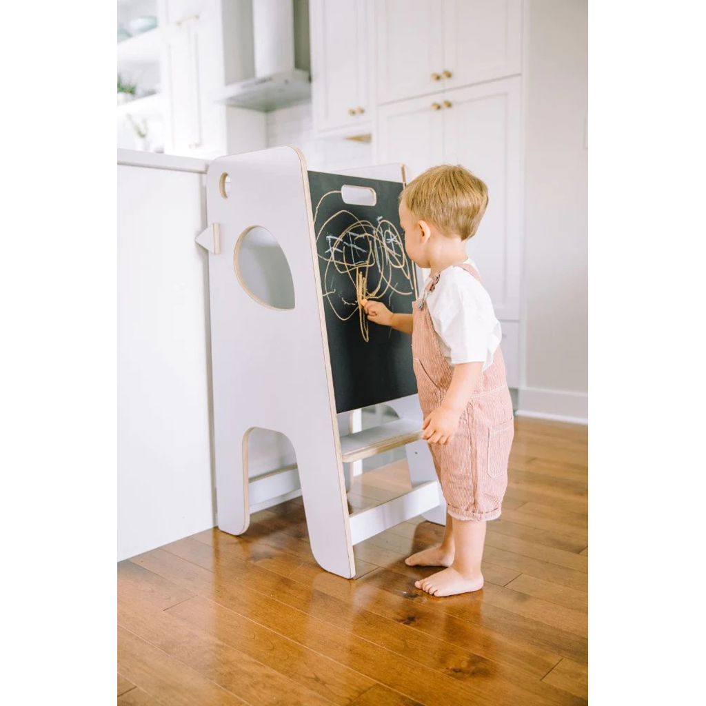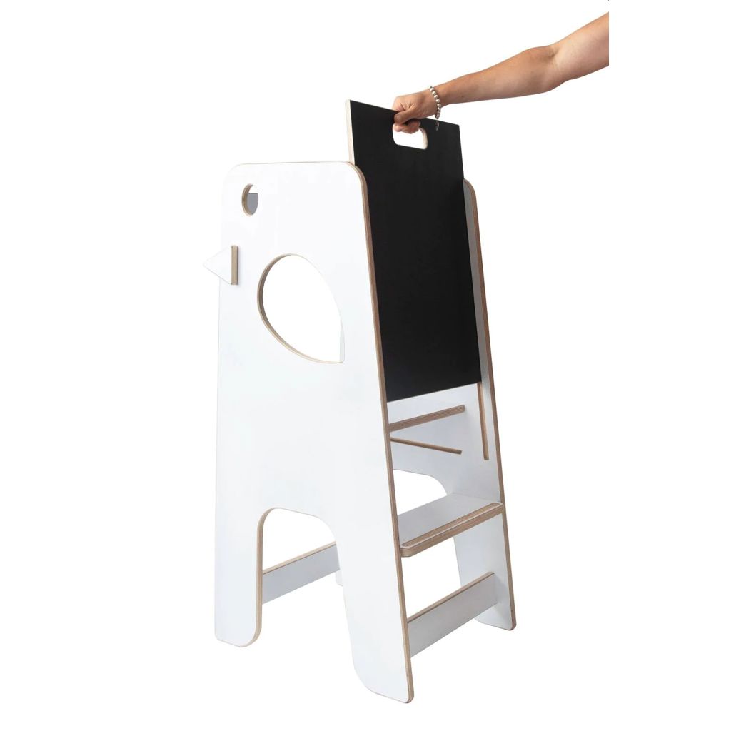 - This 2-in-1 learning tower has a removable chalkboard with the dual function of preventing the child from falling and transforming the learning tower into an art easel.