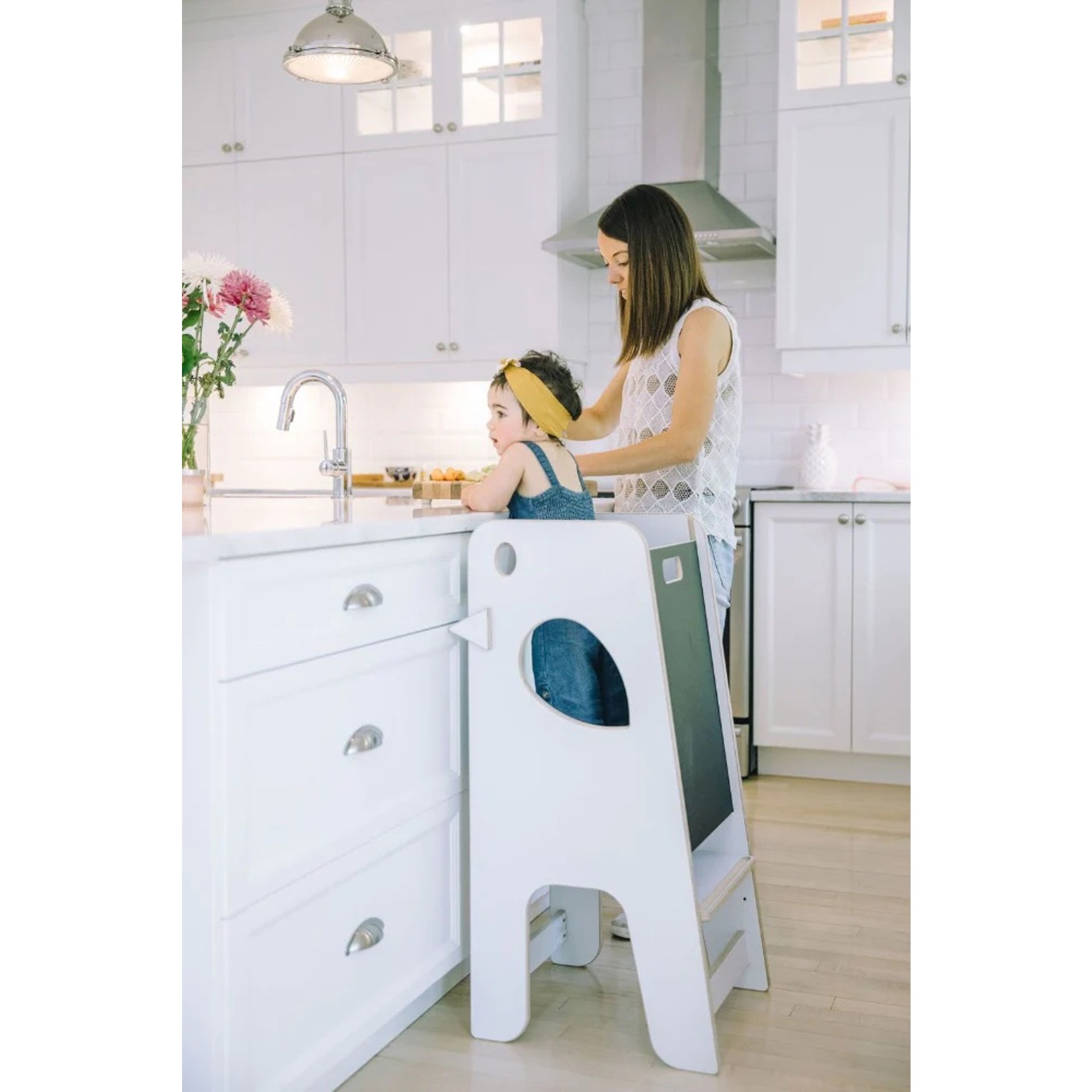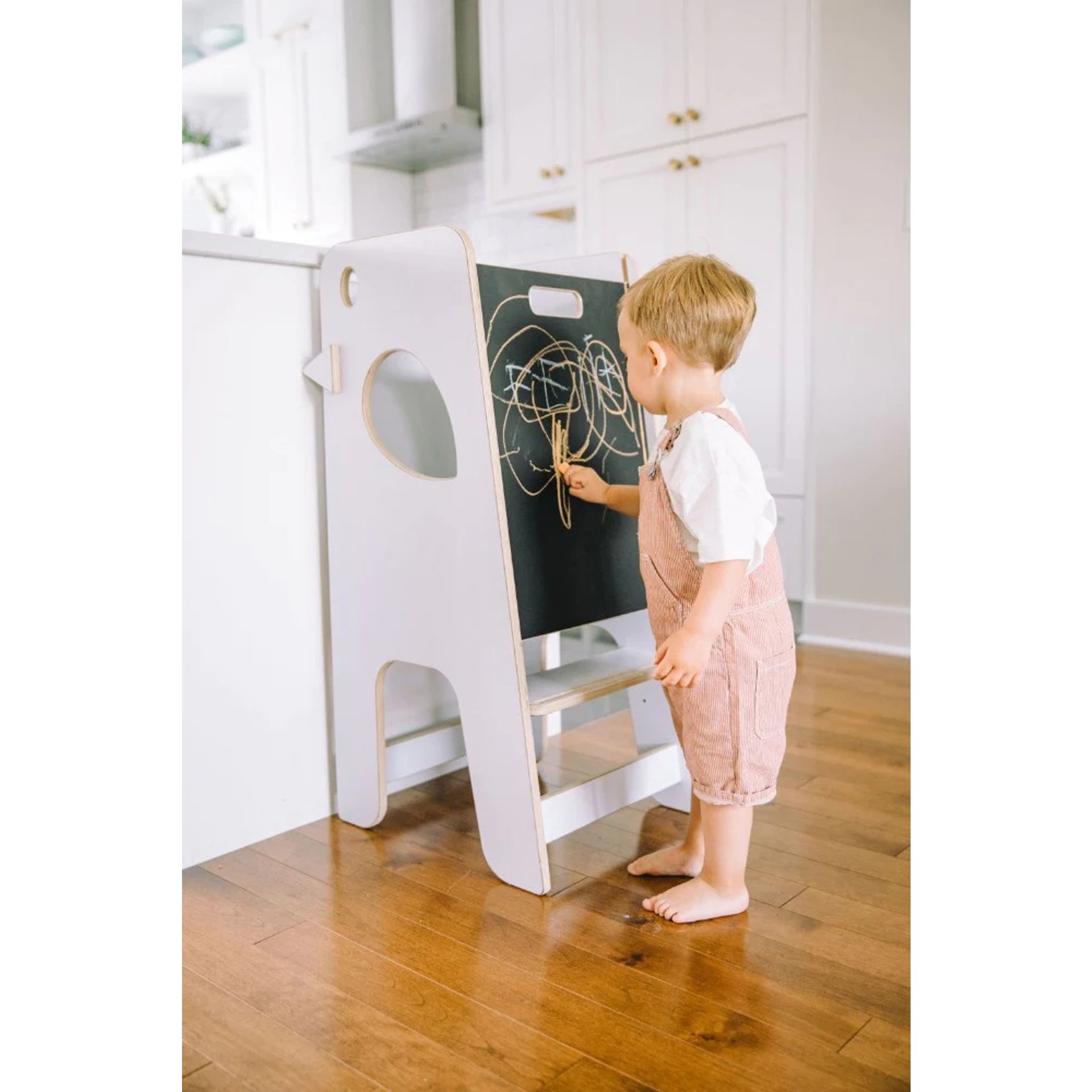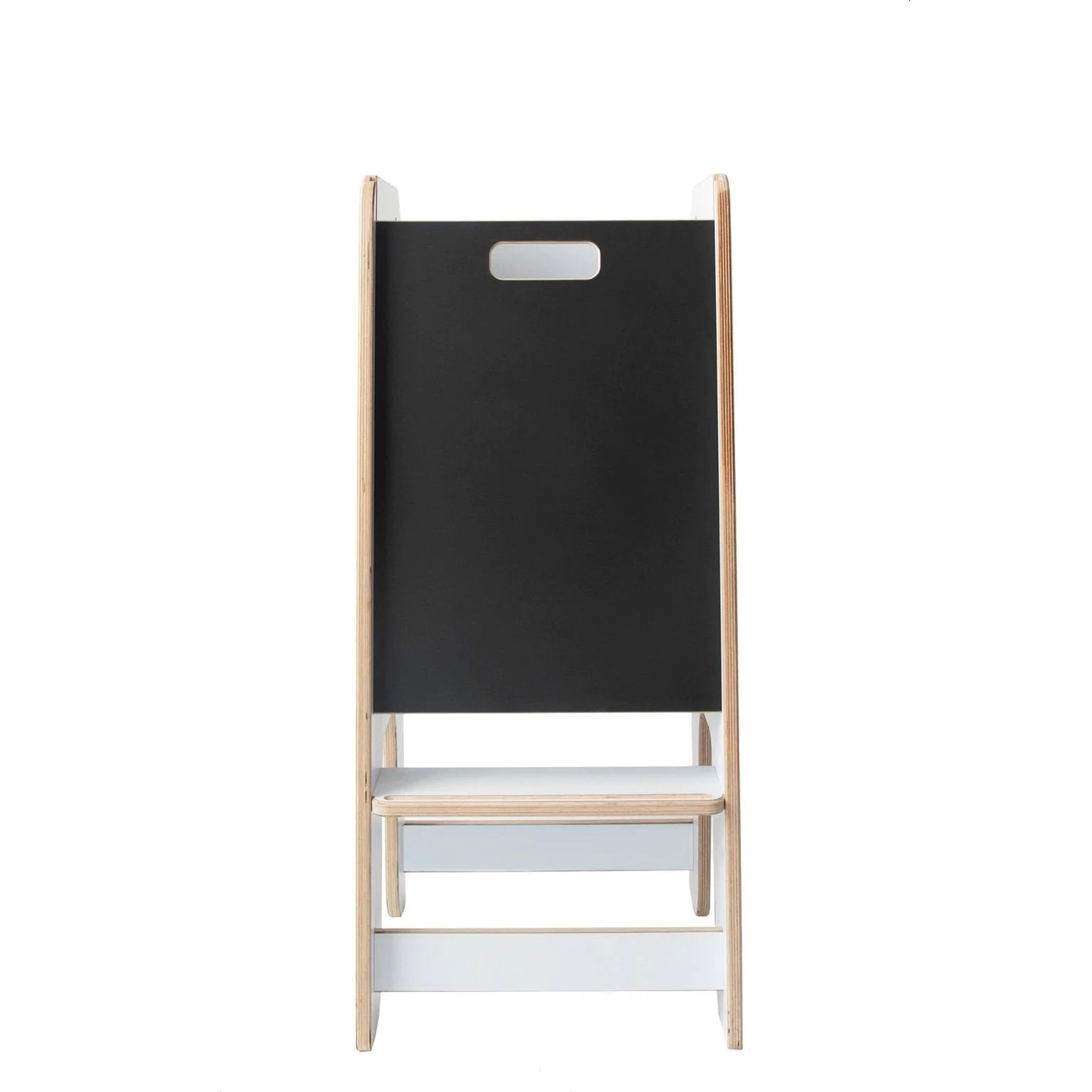 - This 2-in-1 learning tower has a removable chalkboard with the dual function of preventing the child from falling and transforming the learning tower into an art easel.