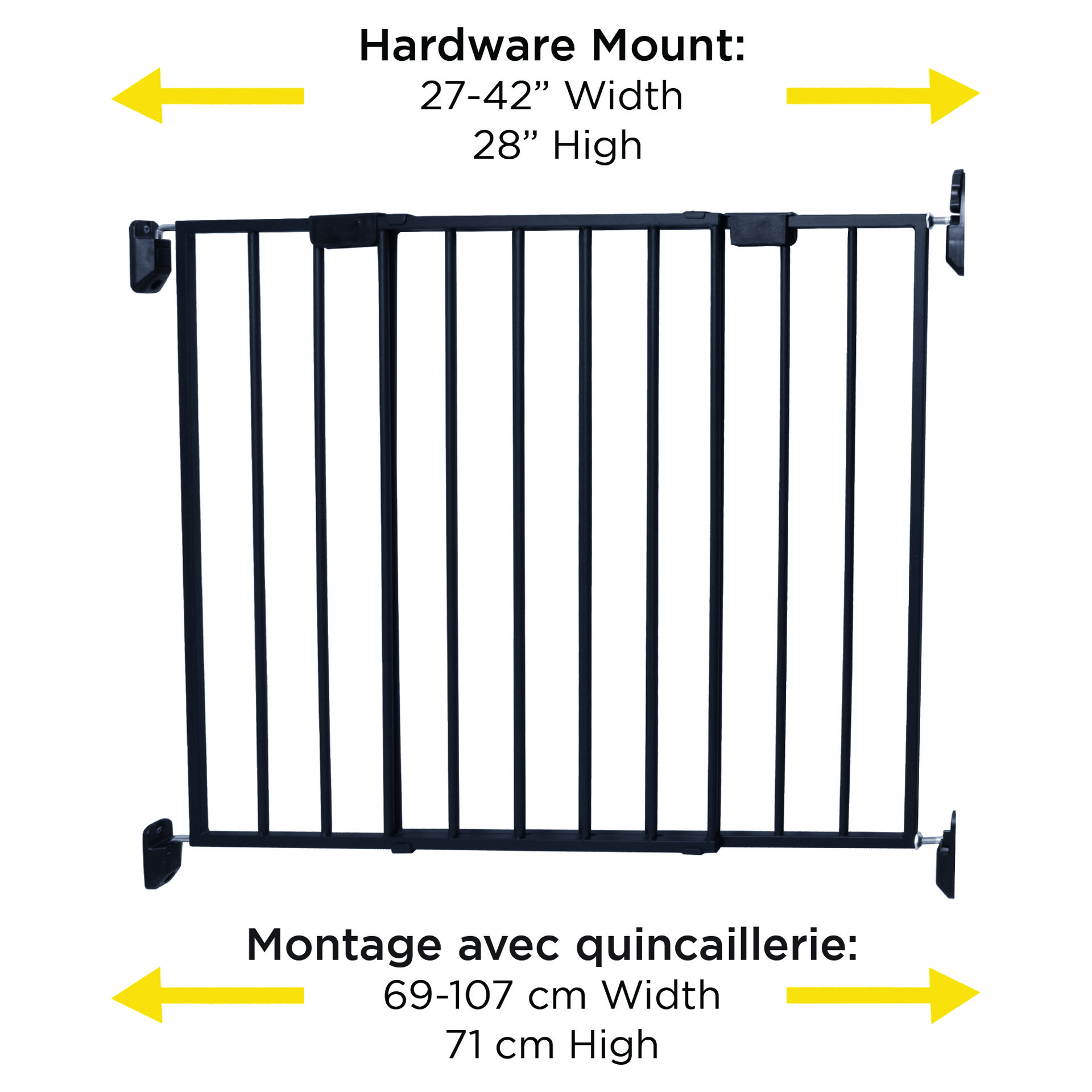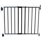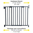 This metal gate expands from 27-42" and is 28" tall. The gate complements your home while keeping baby safely inside, or out of, certain areas.