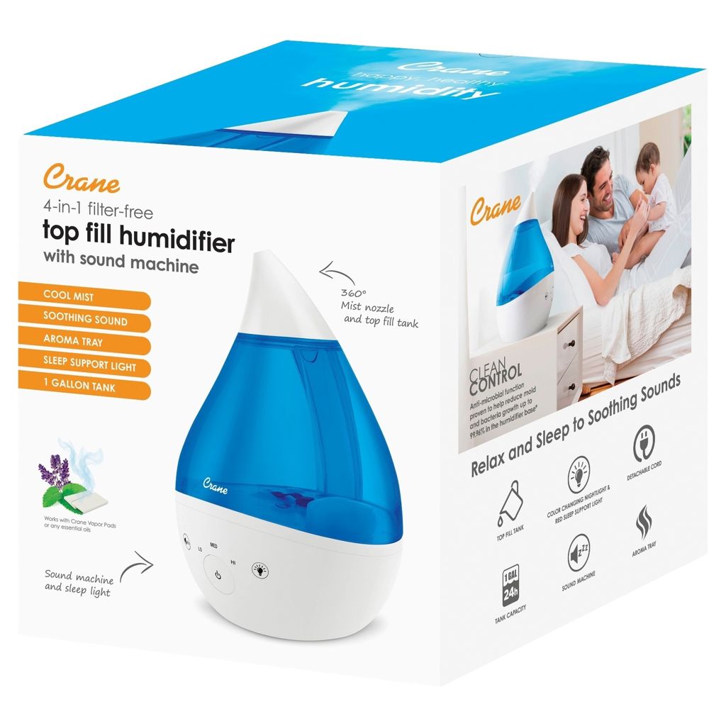 Get relief from cold and flu symptoms and bring wellness to your entire family in style, with a Crane Top Fill Drop Humidifier. With an award-winning design & top-rated performance, Crane's 3.78L(1 Gallon) Top Fill Drop Ultrasonic Cool Mist Humidifier provides up to 46.45 m² (500 sq. ft) of coverage and 24-hours of soothing moisture to help relieve the effects of dryness and congestion. Use with Crane's vapor pads (HS-1950 & HW-1950L, sold separately) for an elevated experience to help you and your family breathe easy and sleep peacefully through the night.