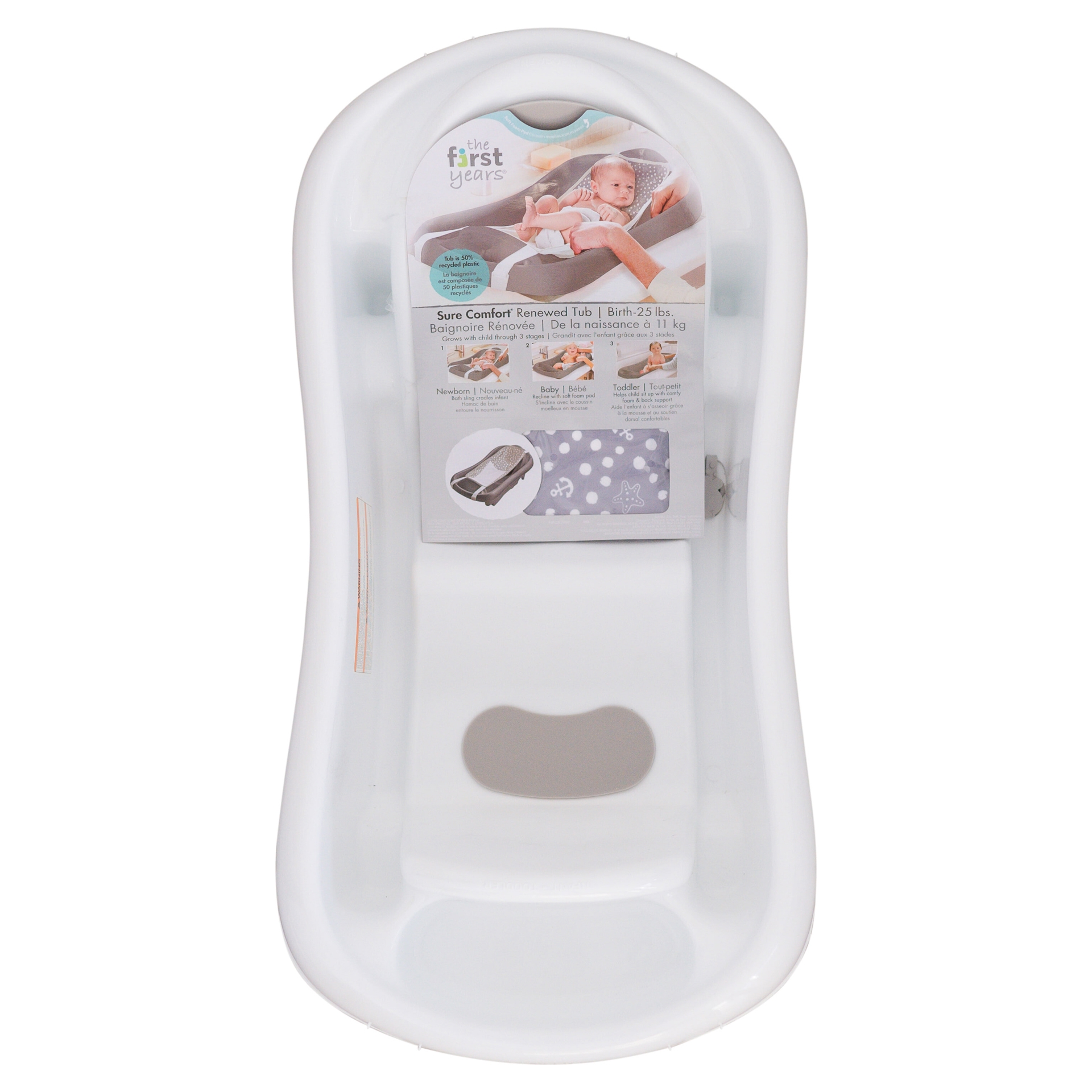 The Sure Comfort® Newborn to Toddler Tub with Infant Sling grows with your child through three stages. The included mesh sling cradles newborns to provide them with extra comfort and support while bathing. The added security of the form-fitting netting helps make bath time less stressful for both new parents and their newborn.