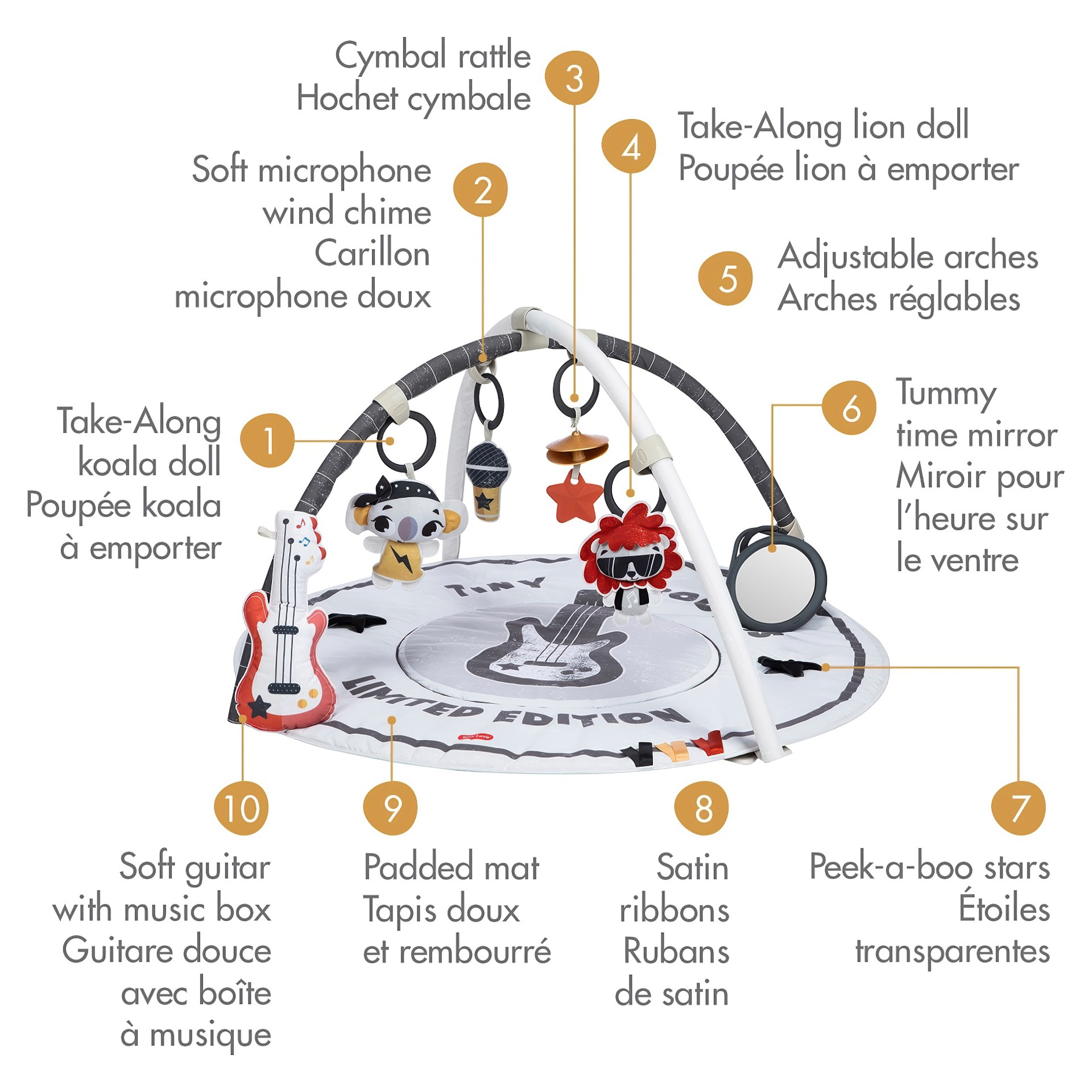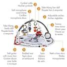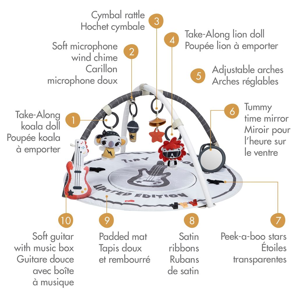 With over 20 engaging activities, including a take-along lion doll with rattle, a crinkly koala friend, a soft microphone wind chime, a cymbal rattle and satin ribbons, this gymini encourages exploration, stimulates senses and develops a wide variety of skills.