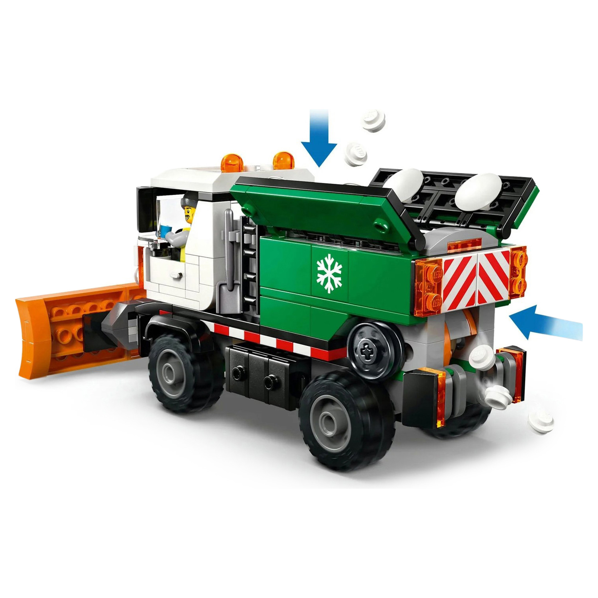 Kids can tilt, raise, and lower the front blade to clear snow, load LEGO® elements representing salt into the hopper, and push the truck to activate the spreading function. The 2-seat cab tilts forward to access the engine, while side compartments store pretend salt and tools using built-in clips. Just add the driver minifigure to bring action-packed winter adventures to life.