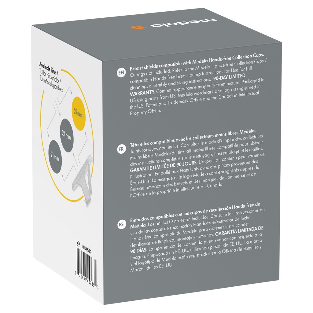 Made from BPA-free materials, these comfortable nipple shields are available in 3 sizes (21 mm, 24 mm, 27 mm) and are designed to be compatible with Medela breast pumps fitted with Hands-Free Collectors.