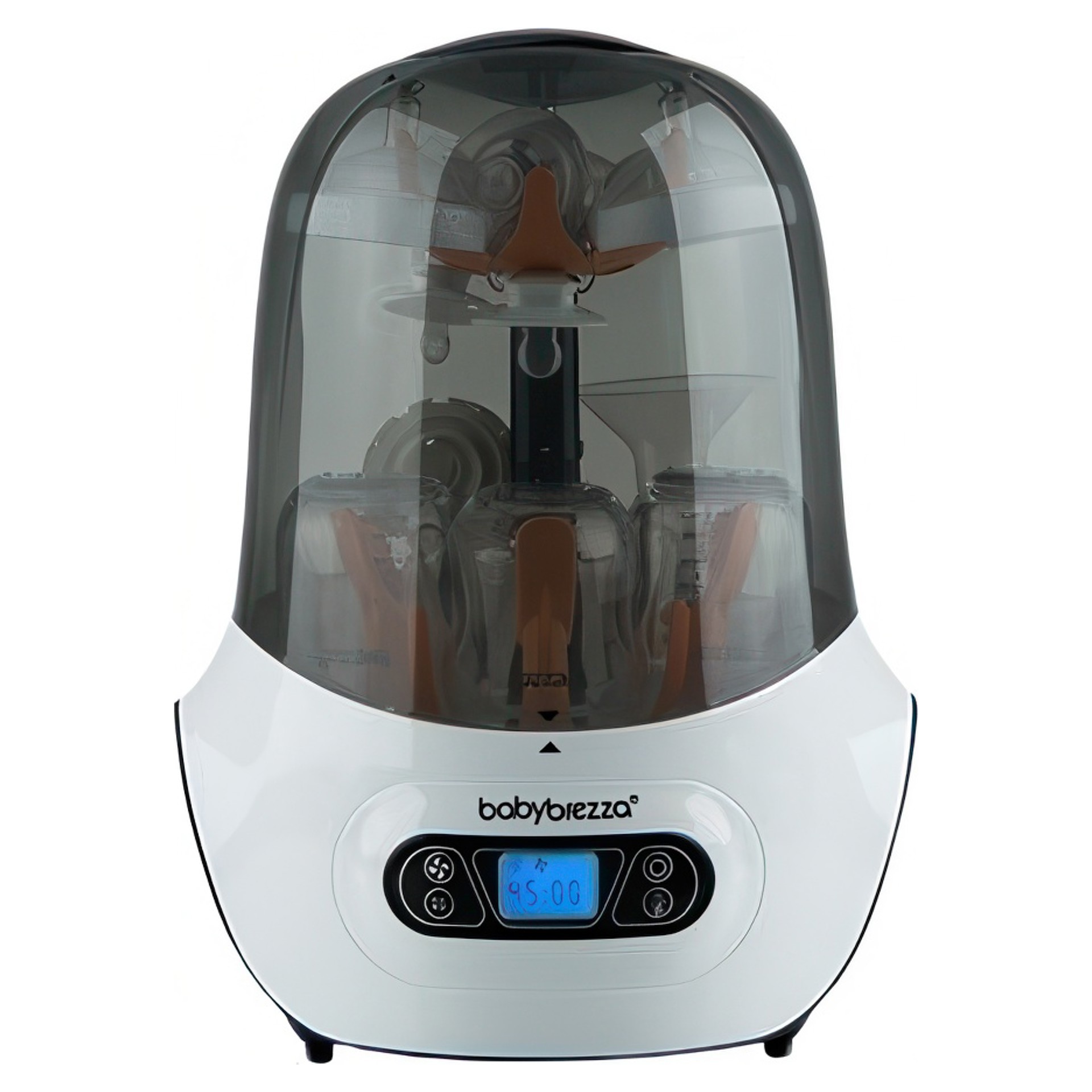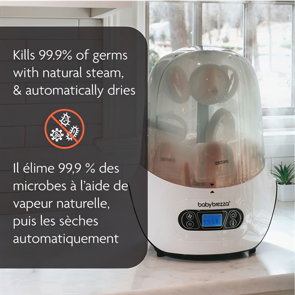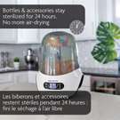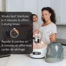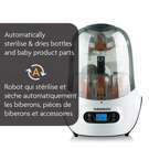 This innovative appliance kills 99.9% of germs with natural steam, then automatically dries everything, keeping items sterilized for up to 24 hours. It has a large universal capacity that holds 6 bottles, baby product parts, soothers and accessories from any brand. BPA-FREE. 1-year limited warranty.
