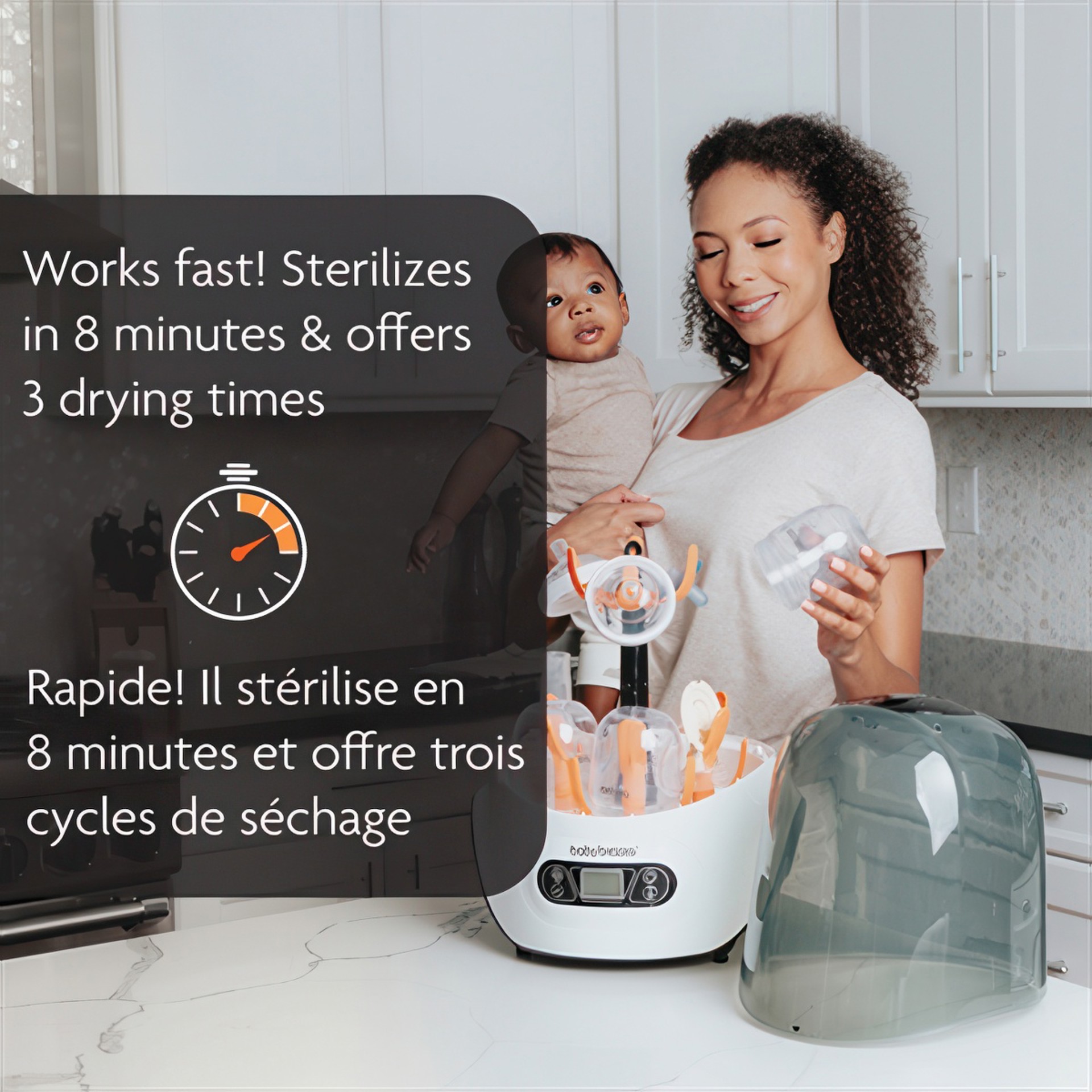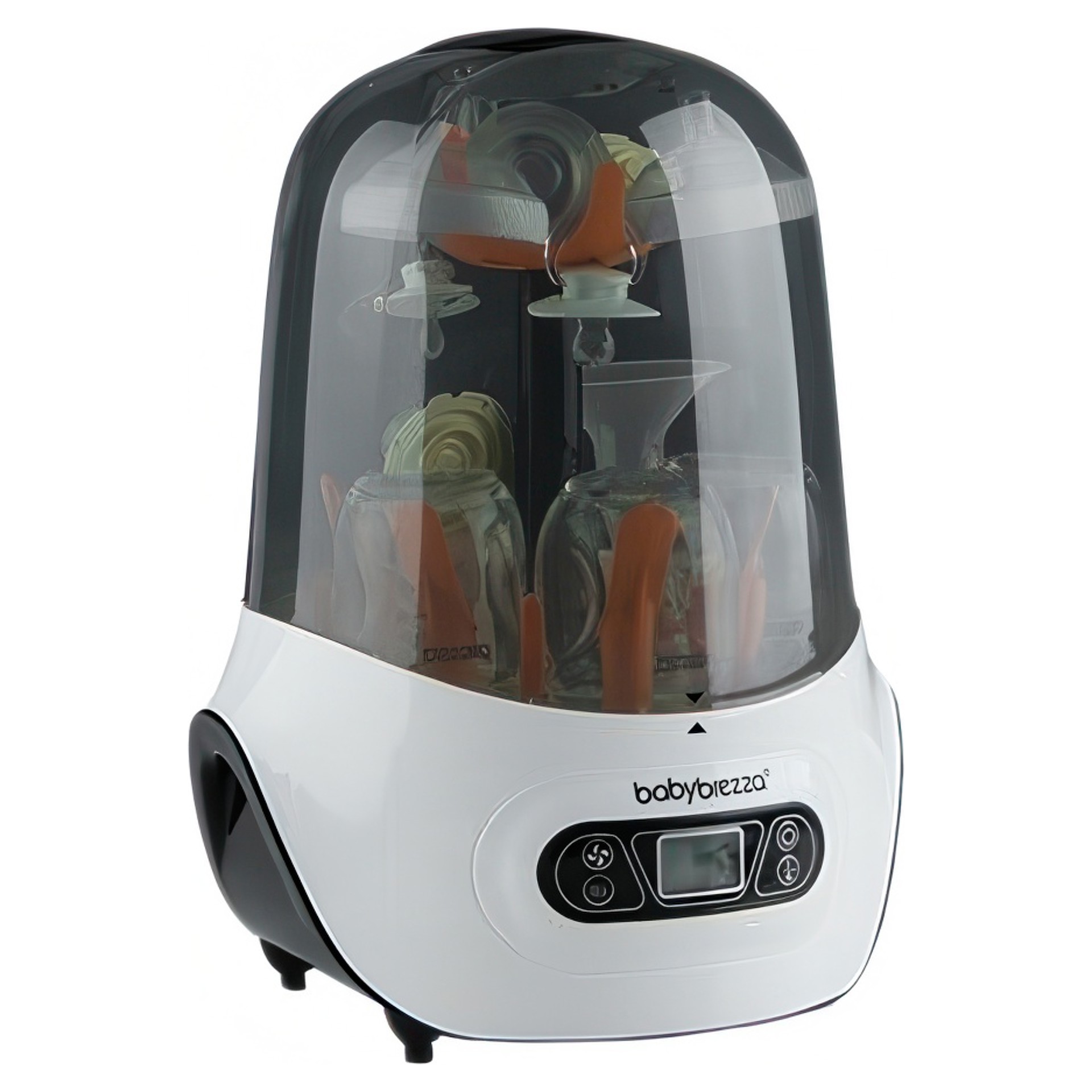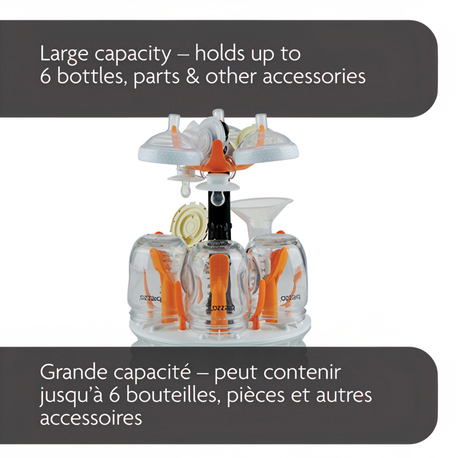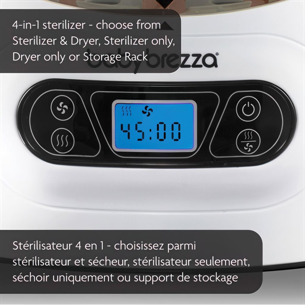 Automatically sterilizes & dries at the push of a button. Natural steam effectively sterilizes any brand/size of bottles, baby product parts & accessories; products remain sterile inside for up to 24 hours. 4 functions; Sterilizer Dryer, Sterilizer Only, Dryer Only or Storage System - No need to use a dirty drying rack again!