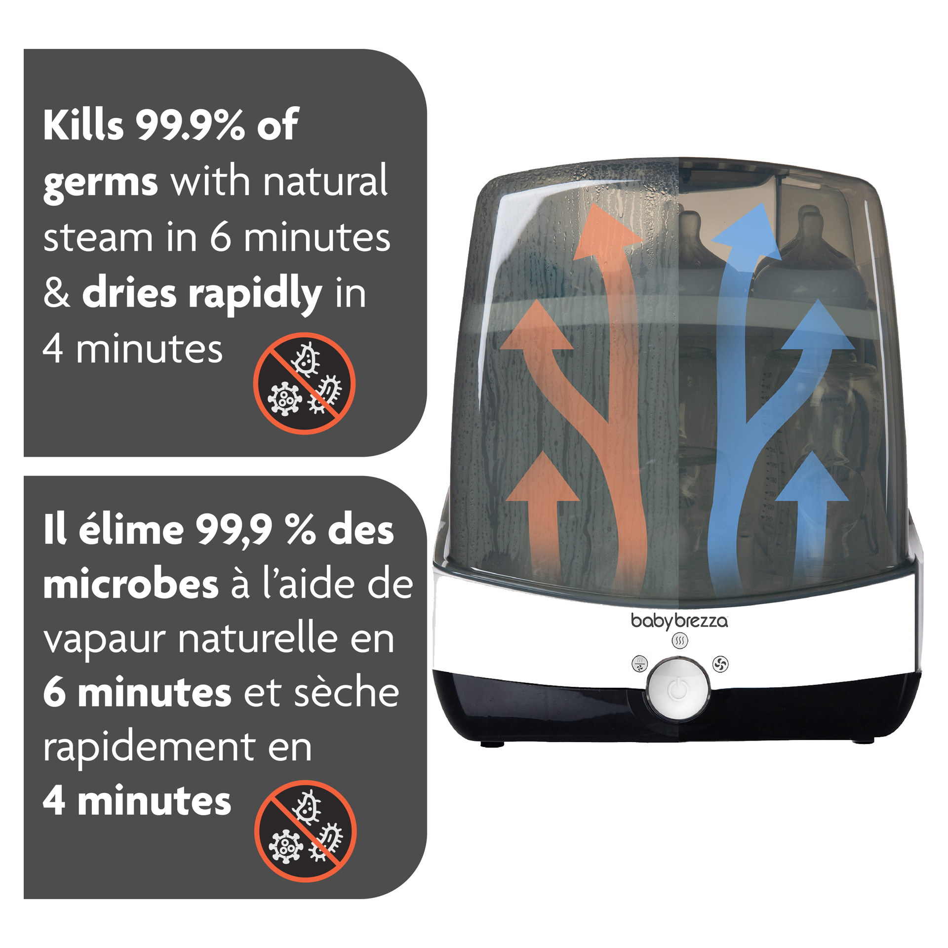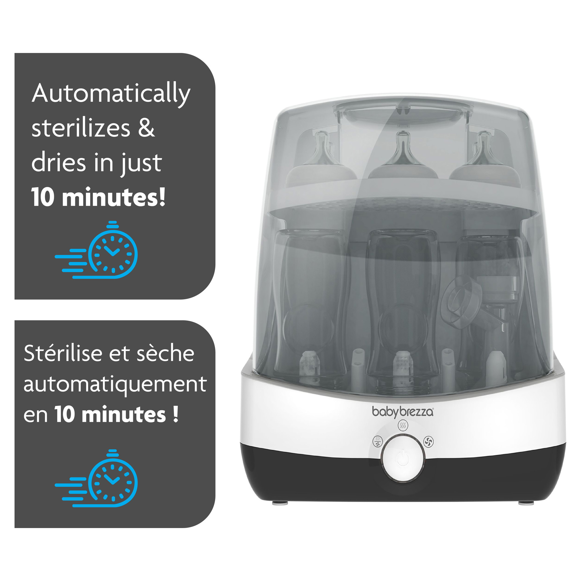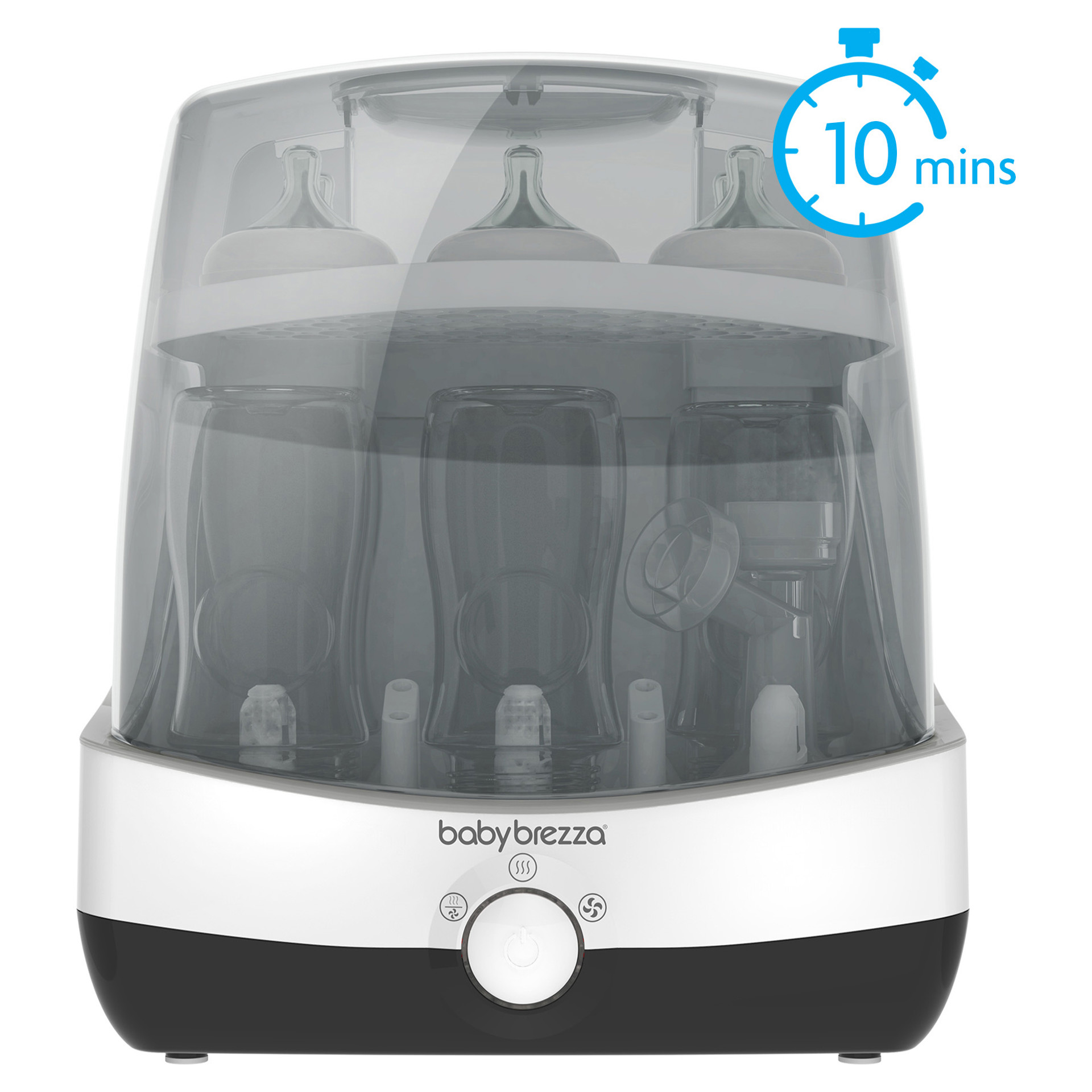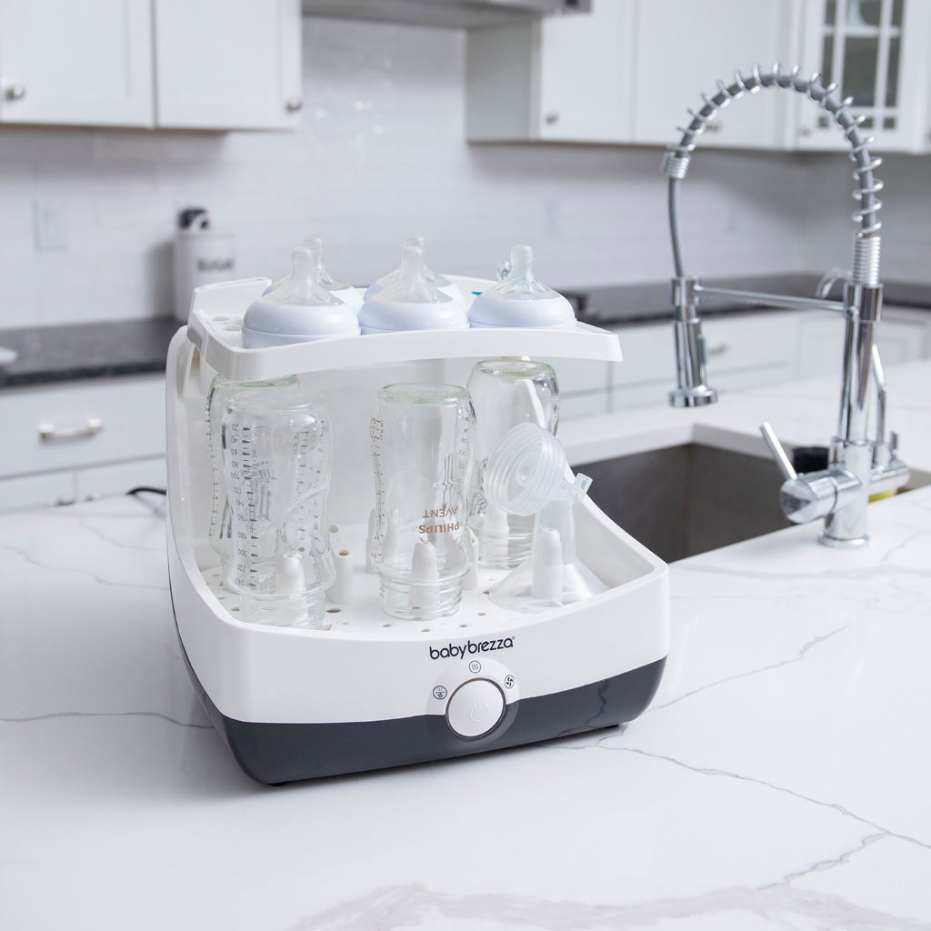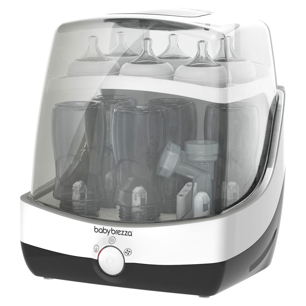 Baby Brezza SuperFast Sterilizer Dryer automatically sterilizes & dries baby products SUPERFAST! In only 10 minutes, this revolutionary appliance sterilizes and dries any brand of bottles, pump parts or accessories 75% faster than other sterilizer dryers. It uses natural steam to kill 99.9% of germs, then automatically dries and keeps items sterile for 24 hours when left unopened. It has a large capacity, holding 6 bottles, 2 pump part sets and accessories.
