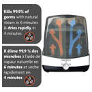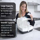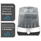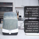 Fastest Sterilizer Dryer only takes 10 minutes! No planning necessary! Automatically sterilizes & dries 75% faster all brands of bottles, pump parts & accessories Natural steam kills 99.9% of germs; products remain sterile for 24 hours when left in unopened sterilizer Large capacity holds 6 bottles & 2 pump part sets