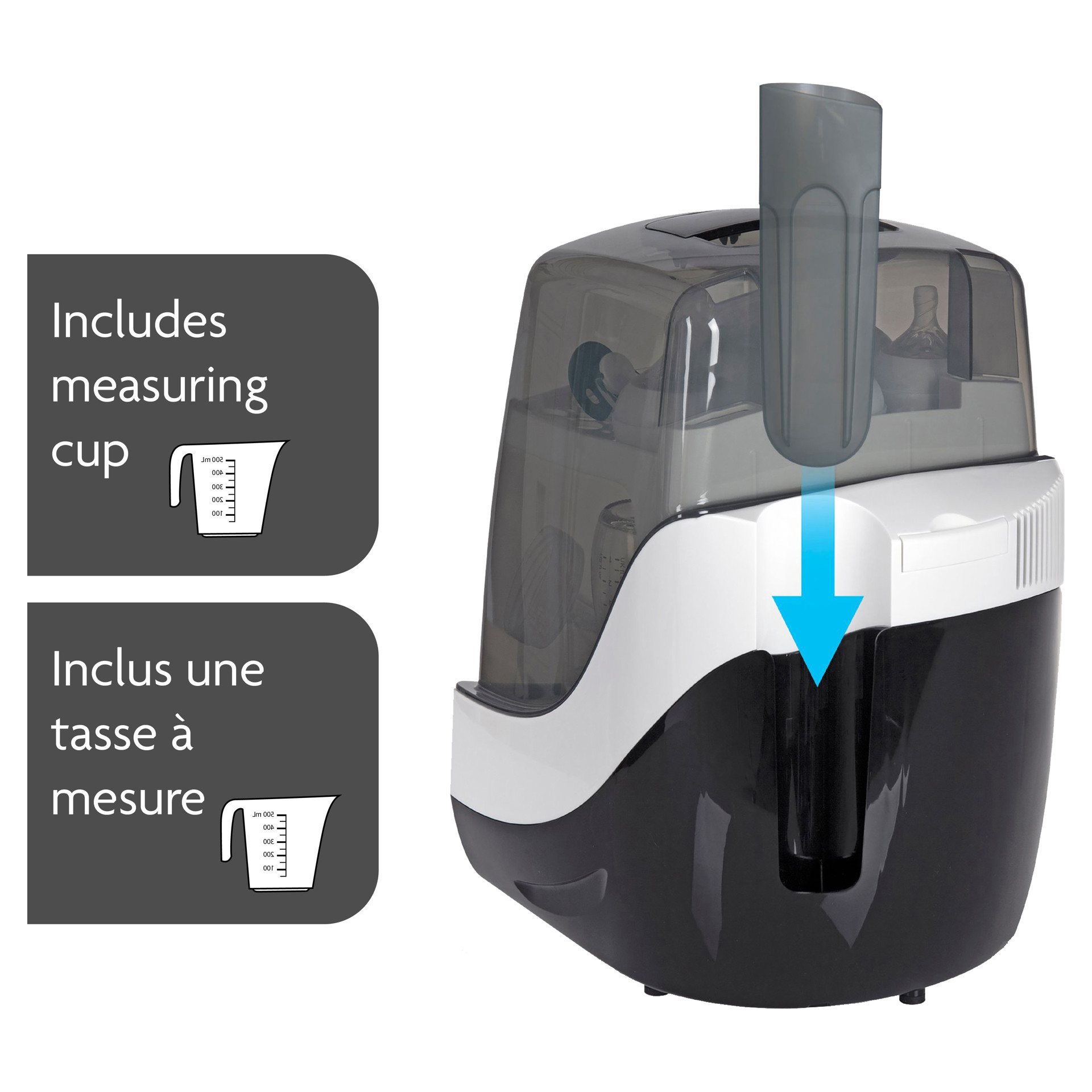 Includes measuring cup to easily fill with water BPA-FREE; 1-year limited warranty.
