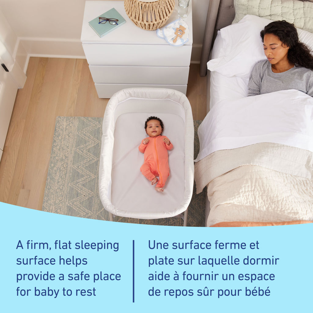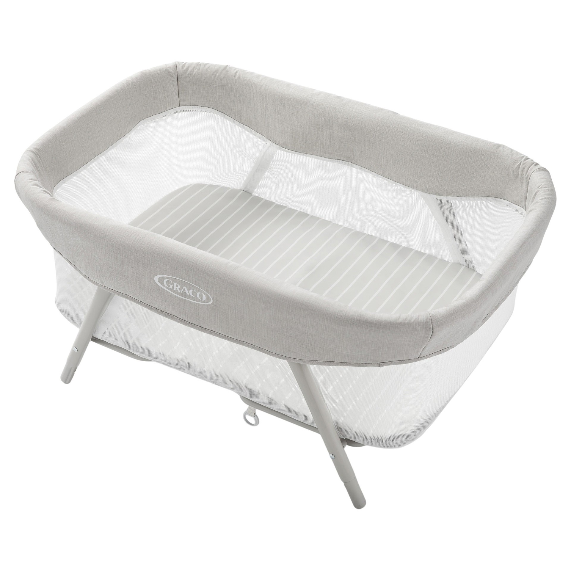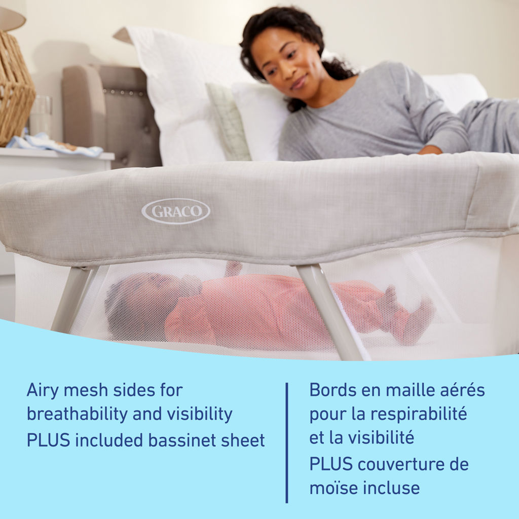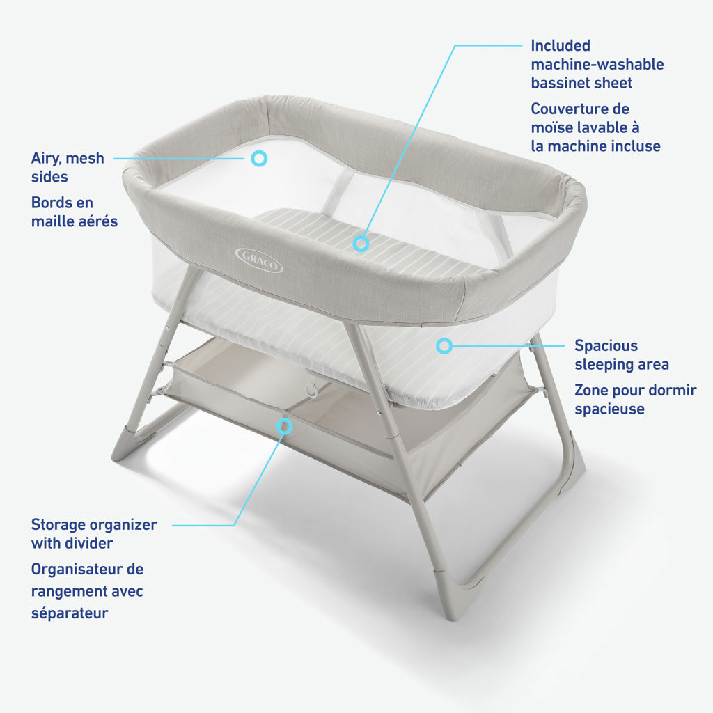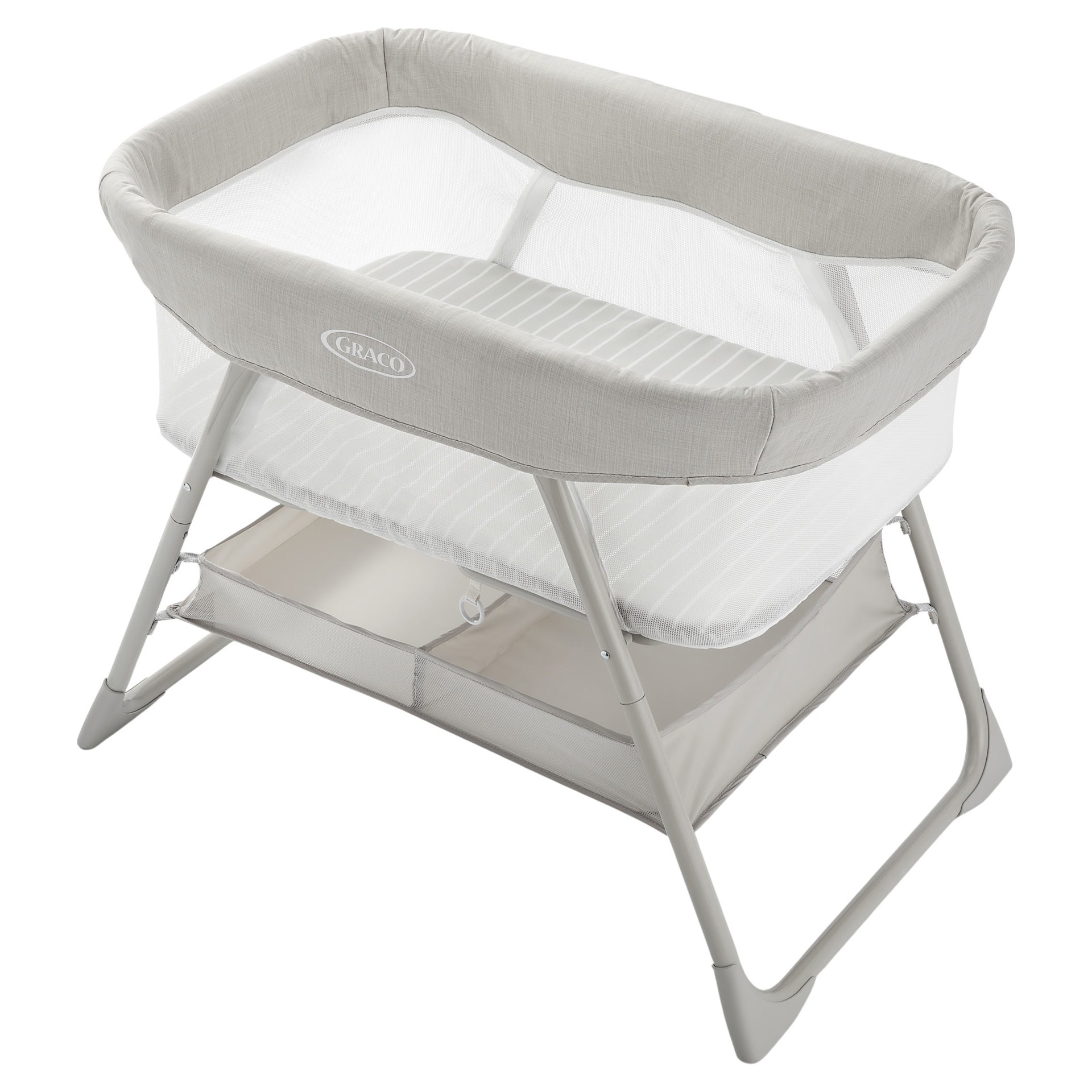 The Graco DreamMore bedside bassinet is the perfect place for your little one to rest, whether at home or on the road! This compact bassinet is designed with a spacious sleeping area and a firm, flat surface to provide a safe sleeping space for your newborn.