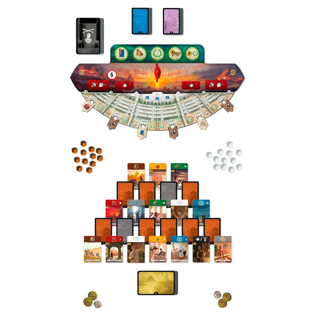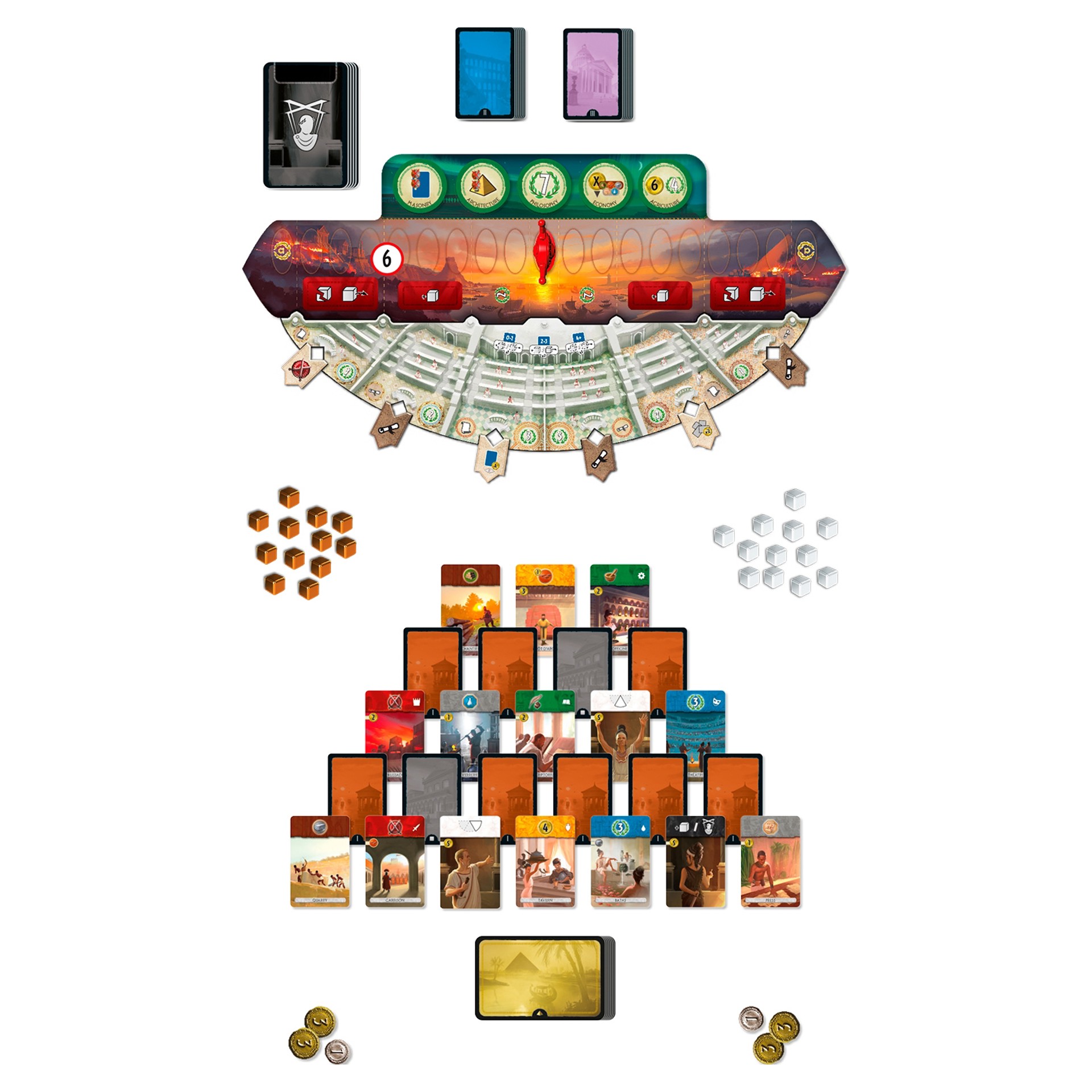 7 Wonders Duel – Agora introduces a new board, the Senate, which is divided into six chambers. Each chamber grants different advantages to the players who control them.