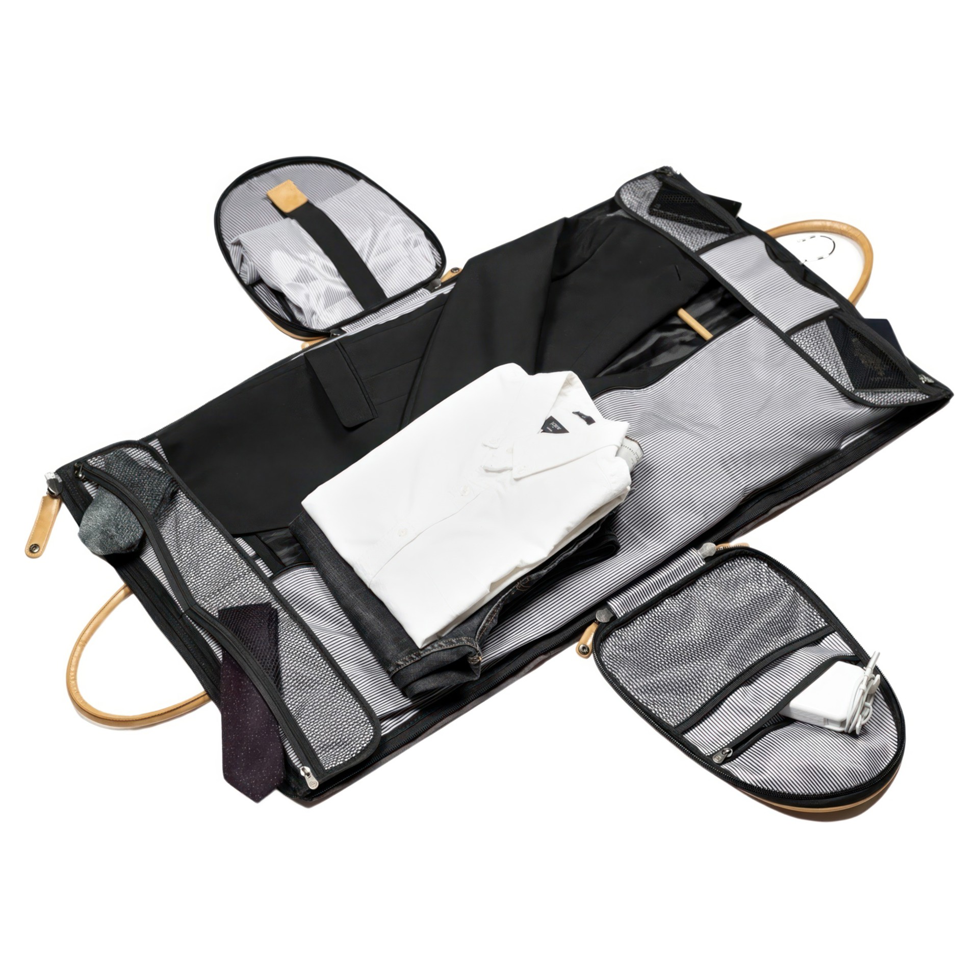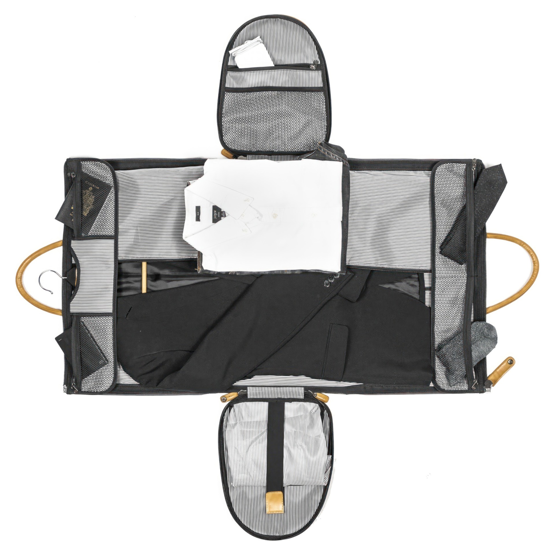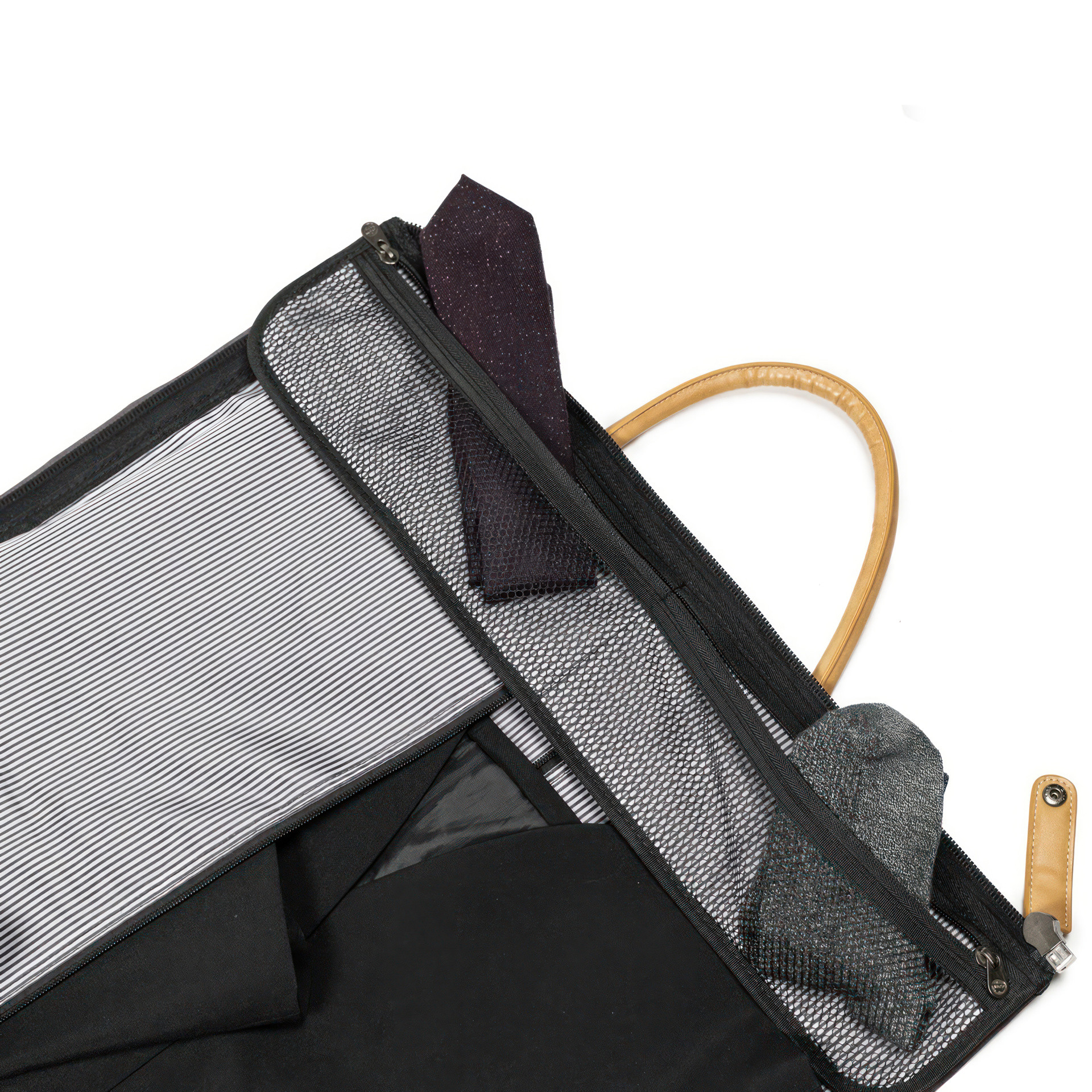 • Zippered mesh storage pockets on top and bottom of inner garment flap for additional internal accessory storage