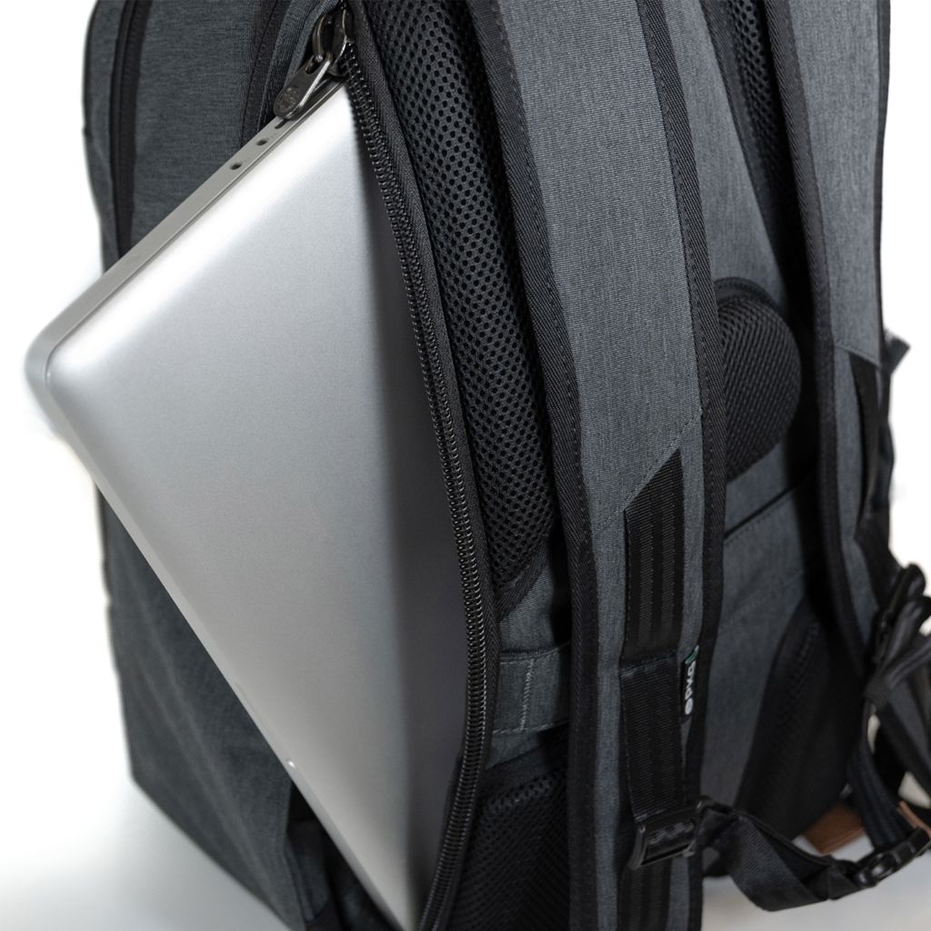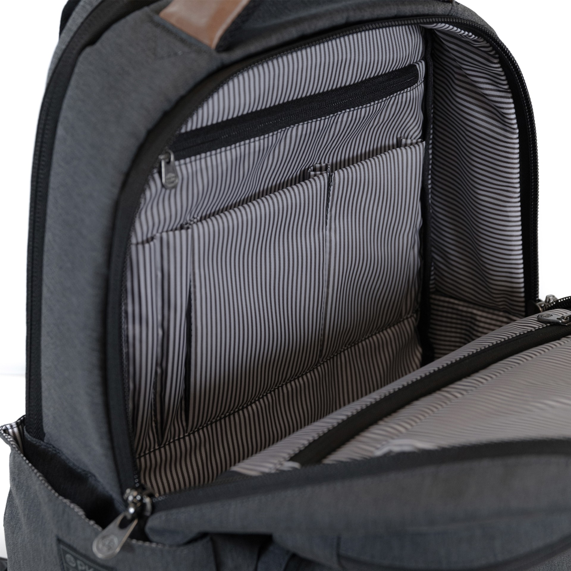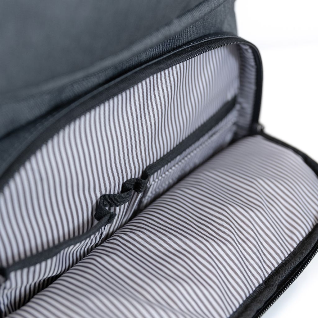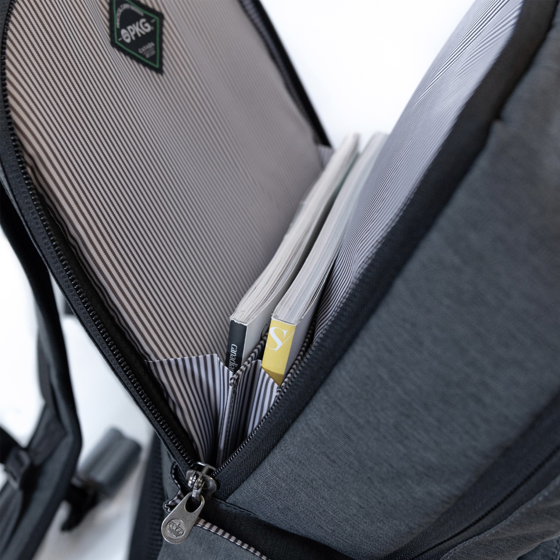 Made from 75 post-consumer water bottles, both the exterior and interior fabrics are crafted with sustainability in mind. The minimalist exterior complements a thoughtfully organized interior.