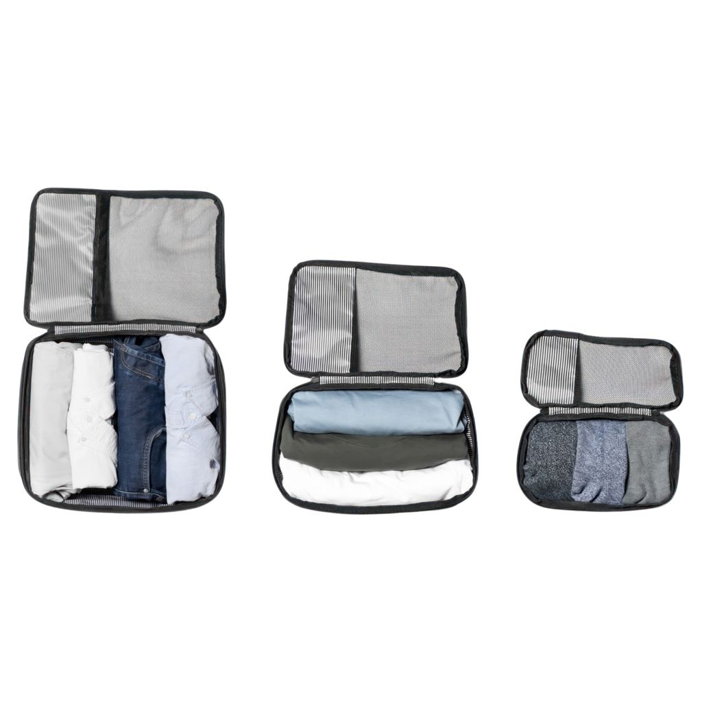 The PKG Union recycled packing cubes (3-pack) are used to neatly pack and compress clothing to maximize space savings.