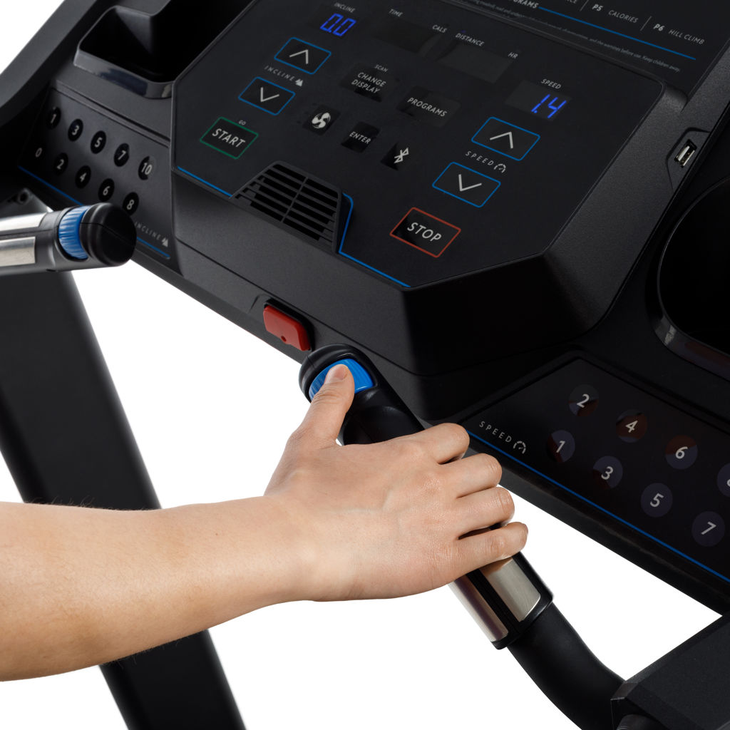 Intuitive dial controls, located directly on the grips, simplify speed and incline changes without interrupting your stride. On the right, turn the dial forwards to increase speed and backwards to decrease it. On the left, turn it forwards to go up the hill and backwards to go down.