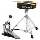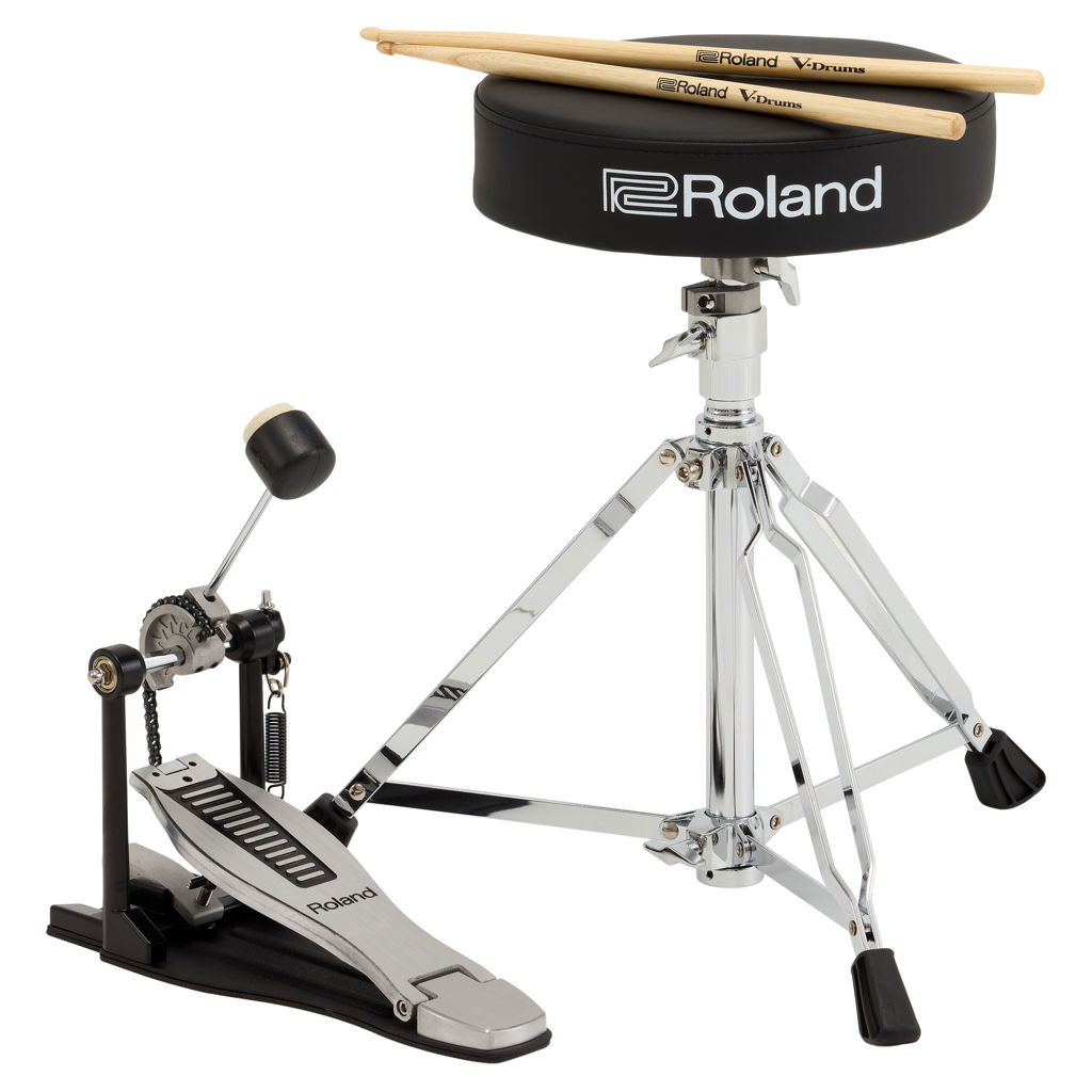 This handy drum accessory package is recommended for entry-level drummers, as it enables them to play their V-Drums right out of the box. Components include a pair of hickory-made drumsticks sporting the V-Drums logo, a kick pedal with new embossed Roland logo footplate, and a drum throne with double-braced tripod for years of reliable use.