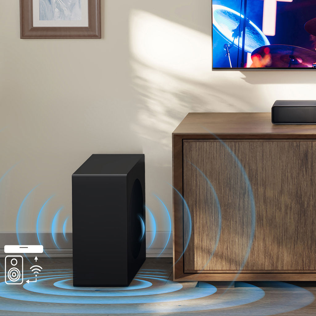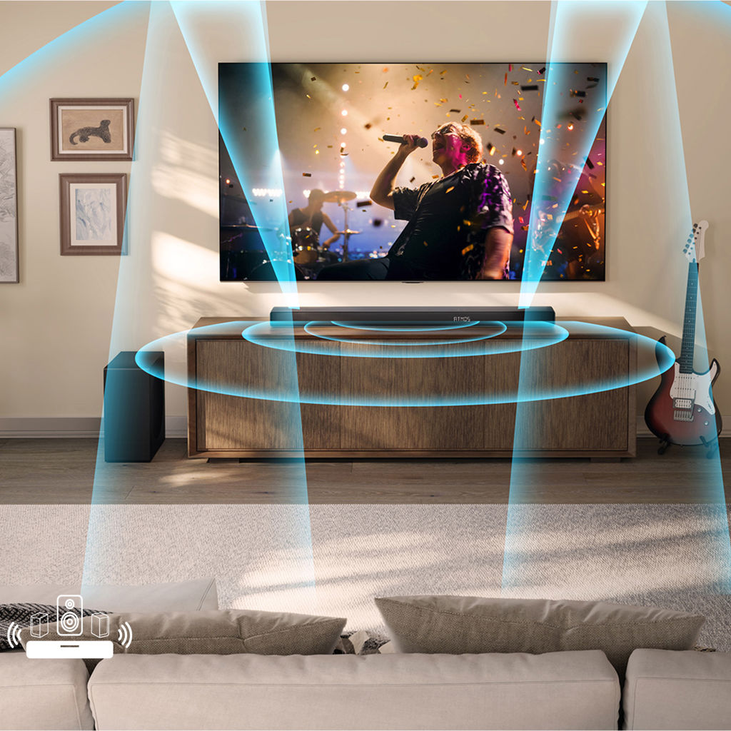 Equipped with a 6.5" wireless subwoofer, the AX3120Q delivers deep, impactful bass without cluttering your room. With Dolby Atmos and DTS:X technologies, it accurately reproduces the soundscapes of movies, games, and music. Its automatic equalization mode (AI EQ) and room-adapted calibration optimize sound output based on your environment.