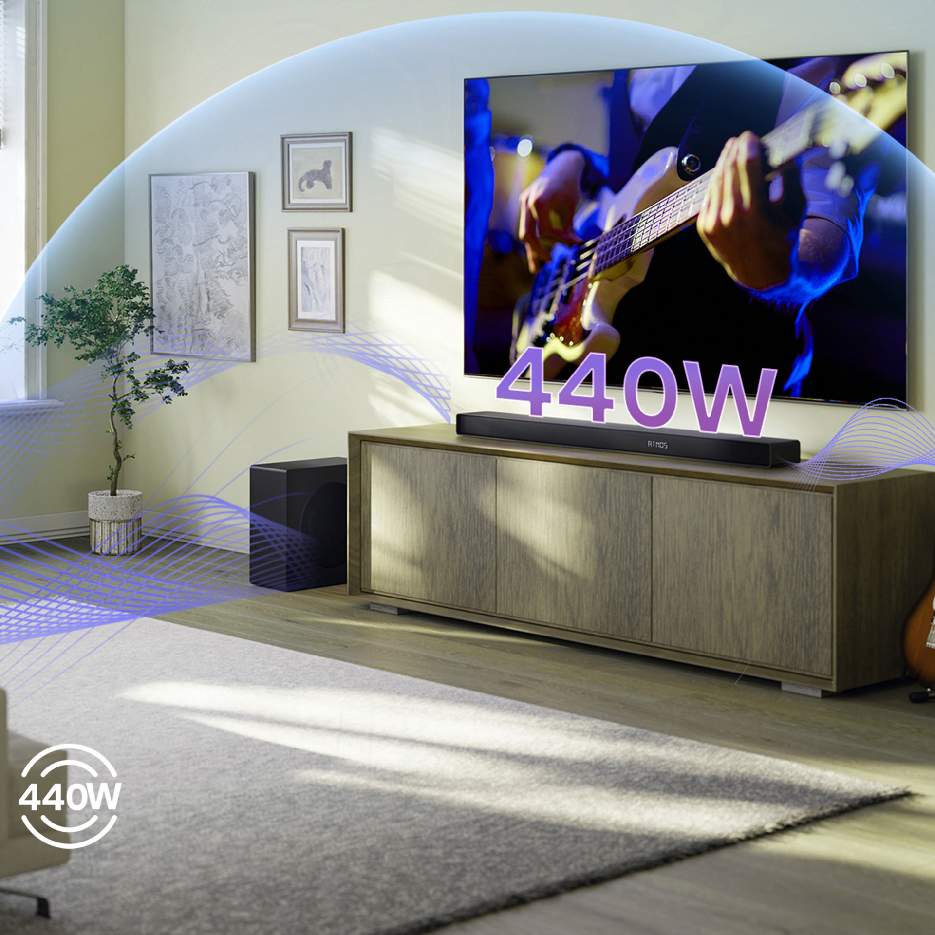 The Hisense AX3120Q transforms your living room into a true home theater. With its 3.1.2-channel audio system and upward-firing speakers, it recreates enveloping, three-dimensional sound. Dialogue becomes clearer, effects gain depth, and the overall experience delivers cinema-quality immersion. Its total power of 440 W provides rich, balanced, and powerful sound for all your content.