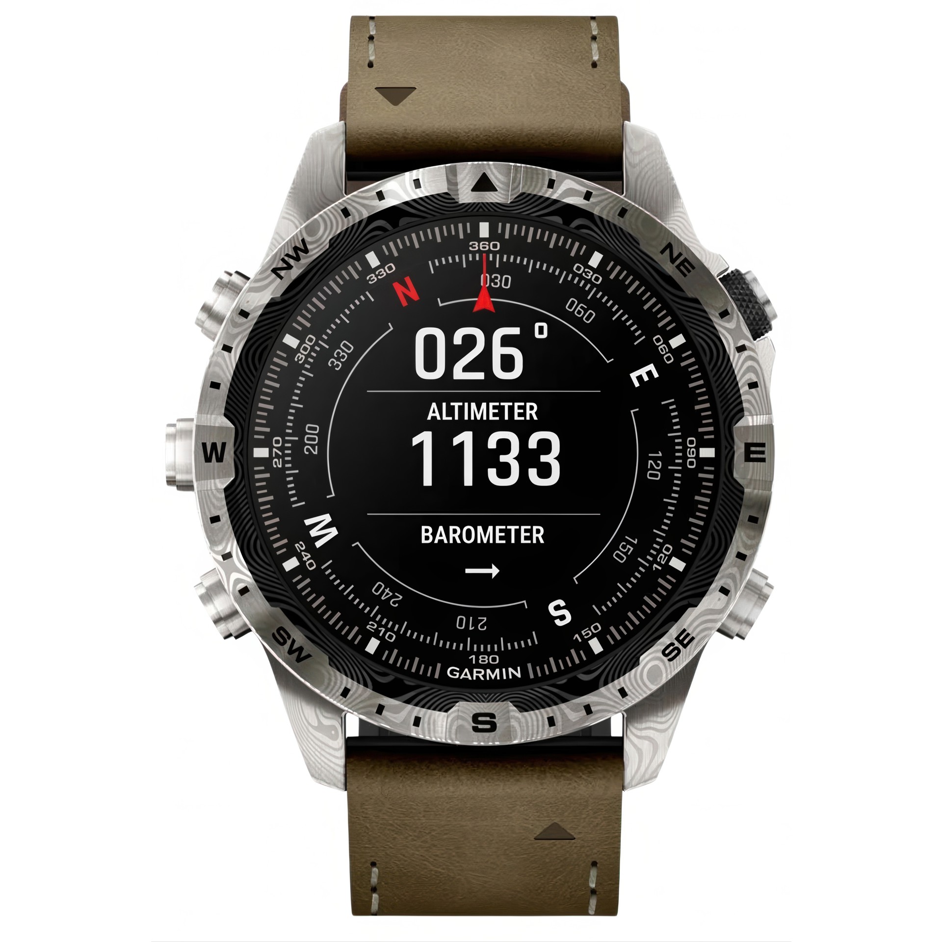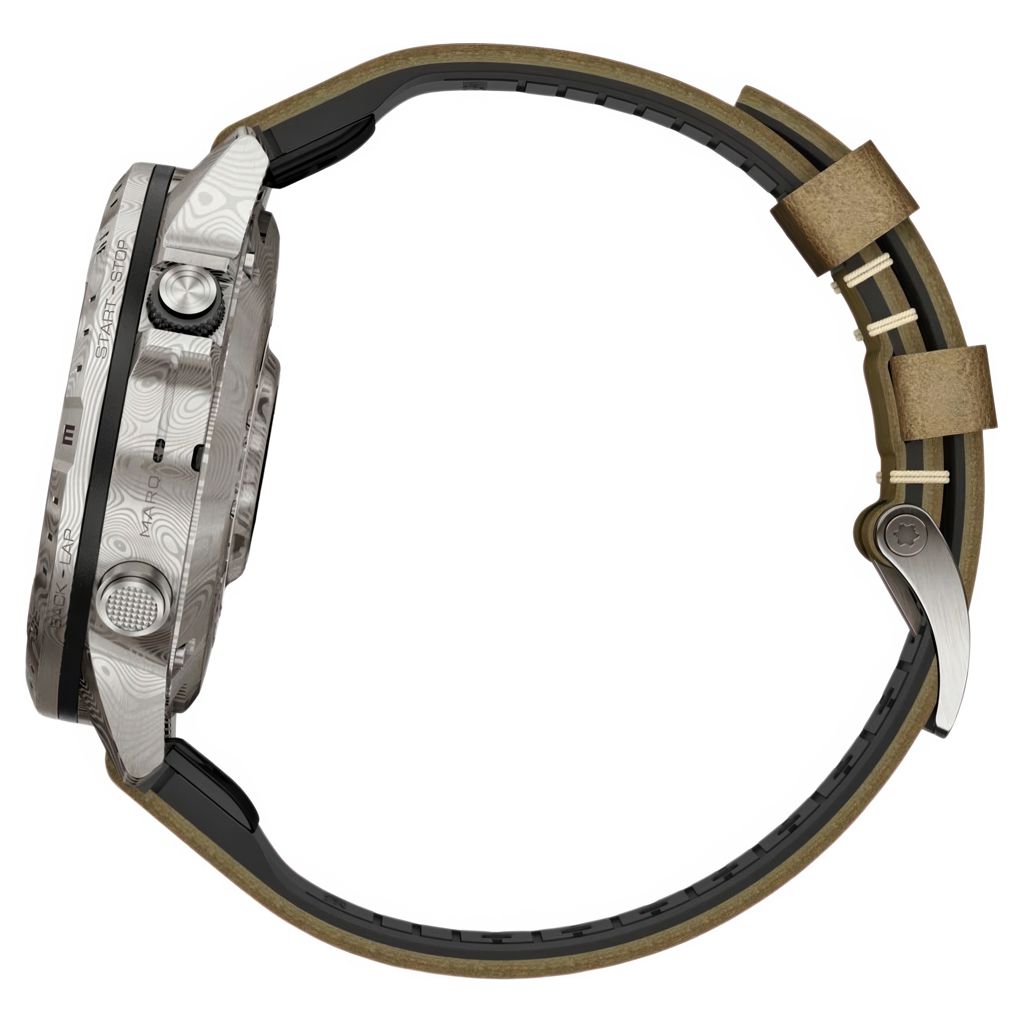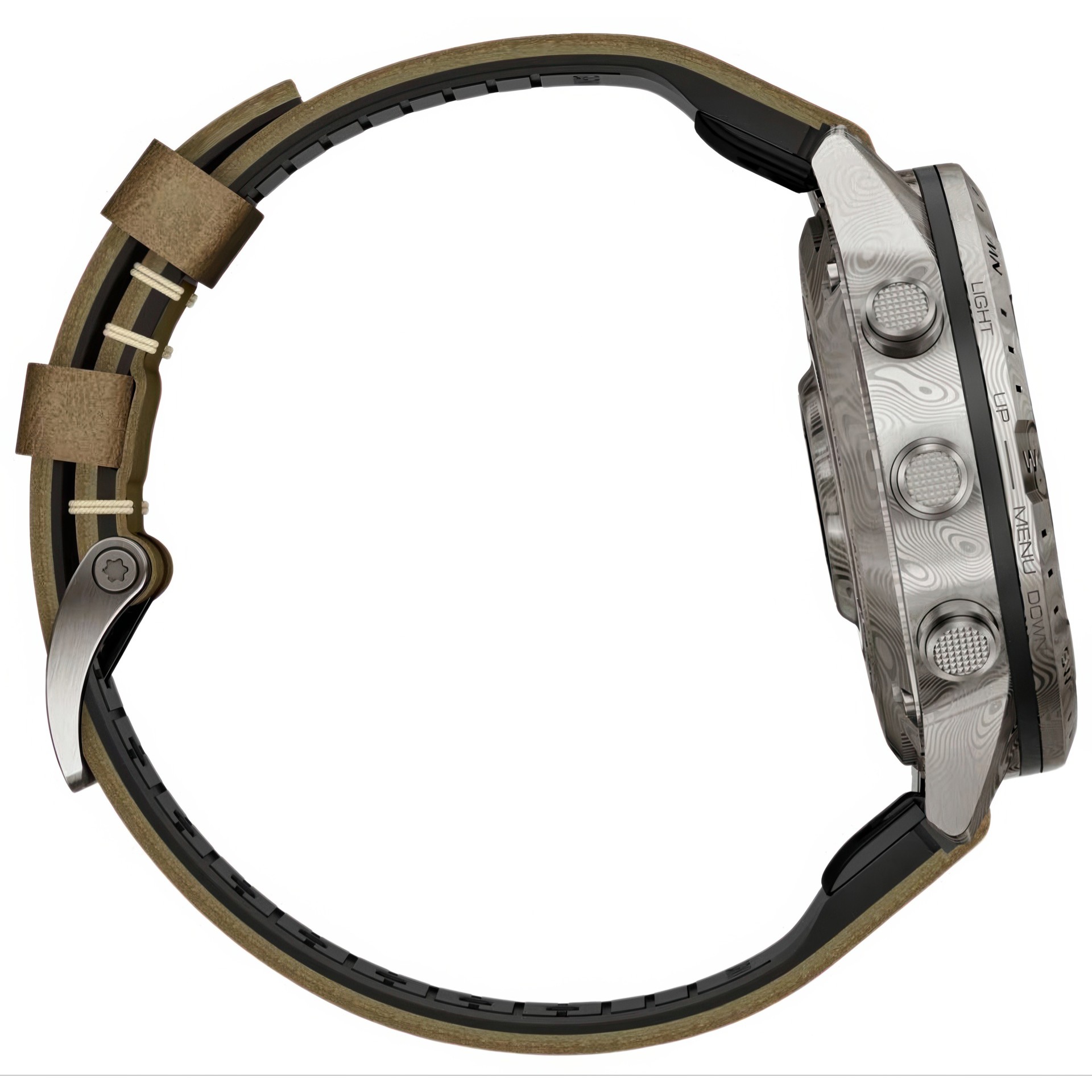 Ancient art revisited for a modern world. This high-end 46 mm tool-watch is crafted in Damascus steel and features a superb AMOLED touchscreen with a hybrid strap in sweat- and stain-resistant leather and FKM rubber.