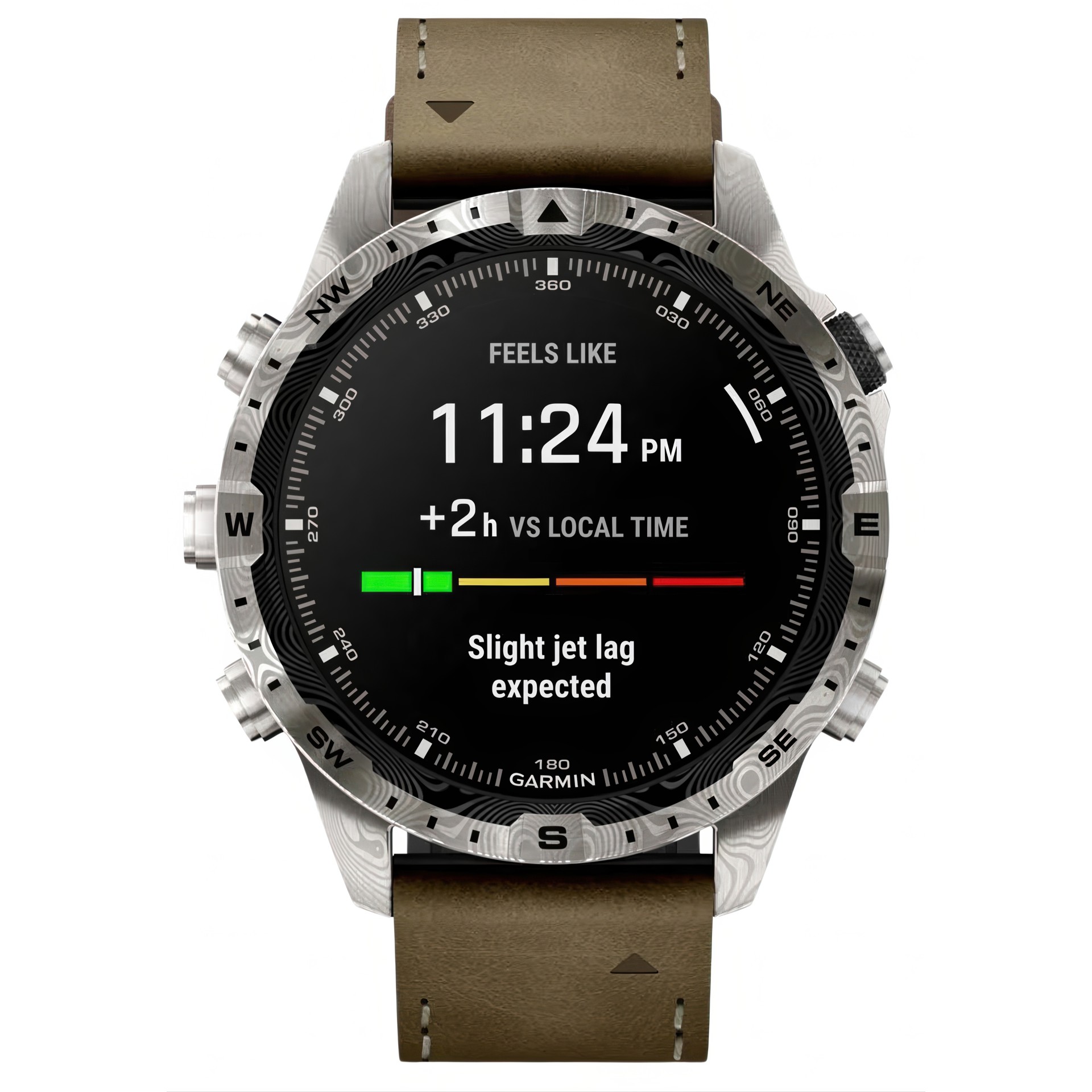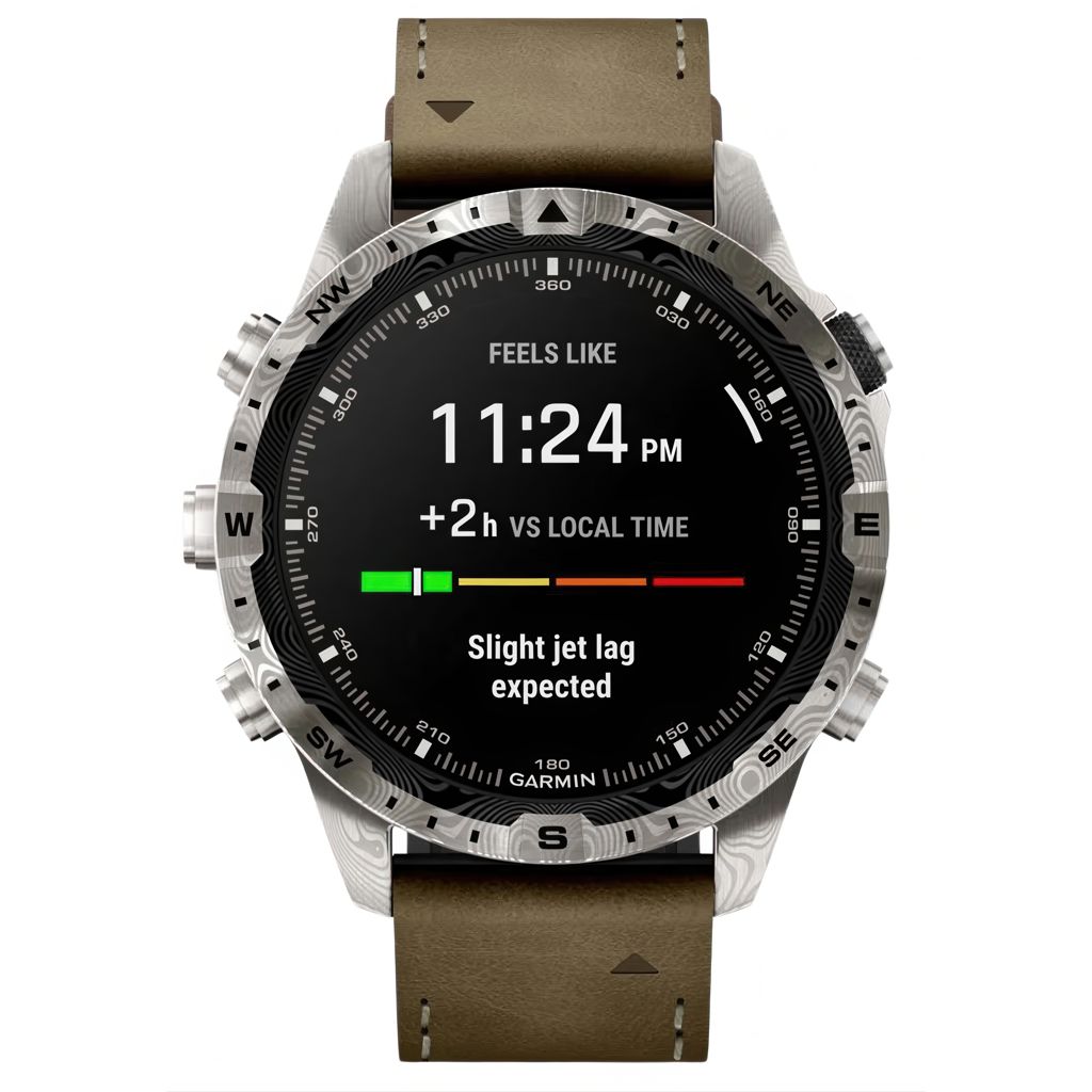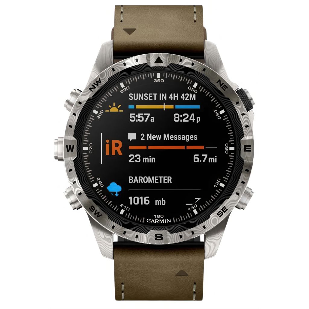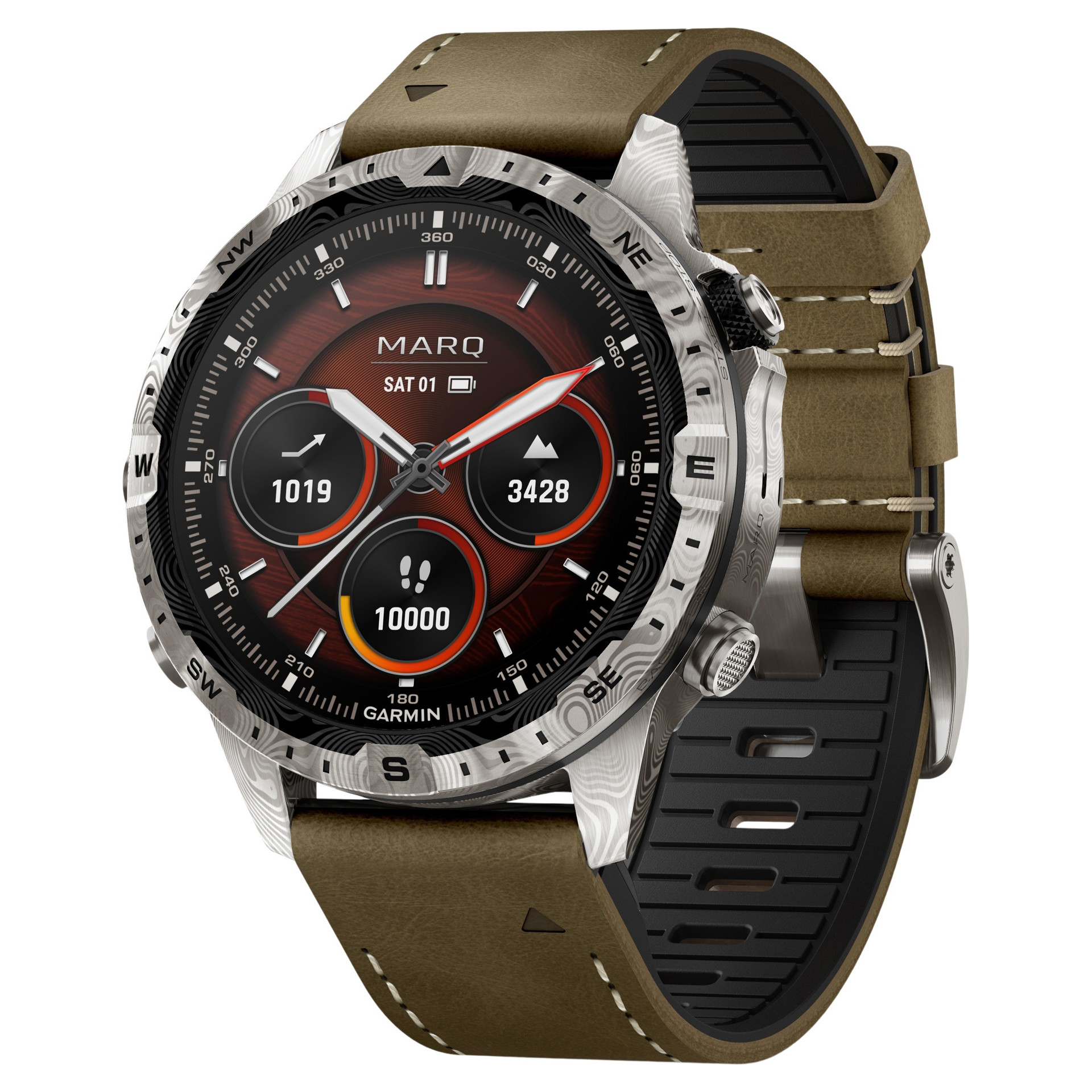 Ancient art revisited for a modern world. This high-end 46 mm tool-watch is crafted in Damascus steel and features a superb AMOLED touchscreen with a hybrid strap in sweat- and stain-resistant leather and FKM rubber.