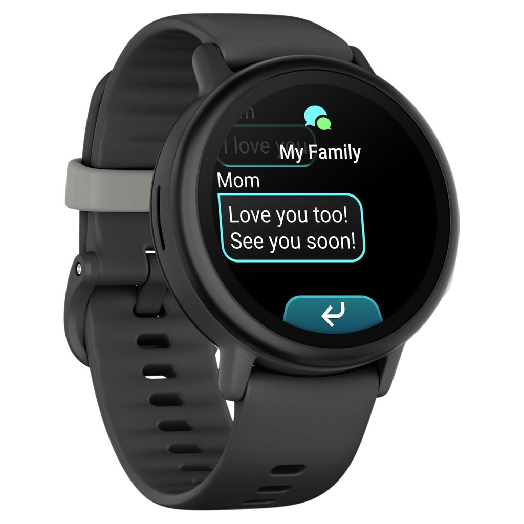 With an active subscription, you can use the Garmin Jr.™ app to send text messages to your child’s Bounce 2 smartwatch. Kids can create their own messages and reply using the built-in full keyboard, complete with emojis and sound emojis, to parent-approved contacts and within family group chats.