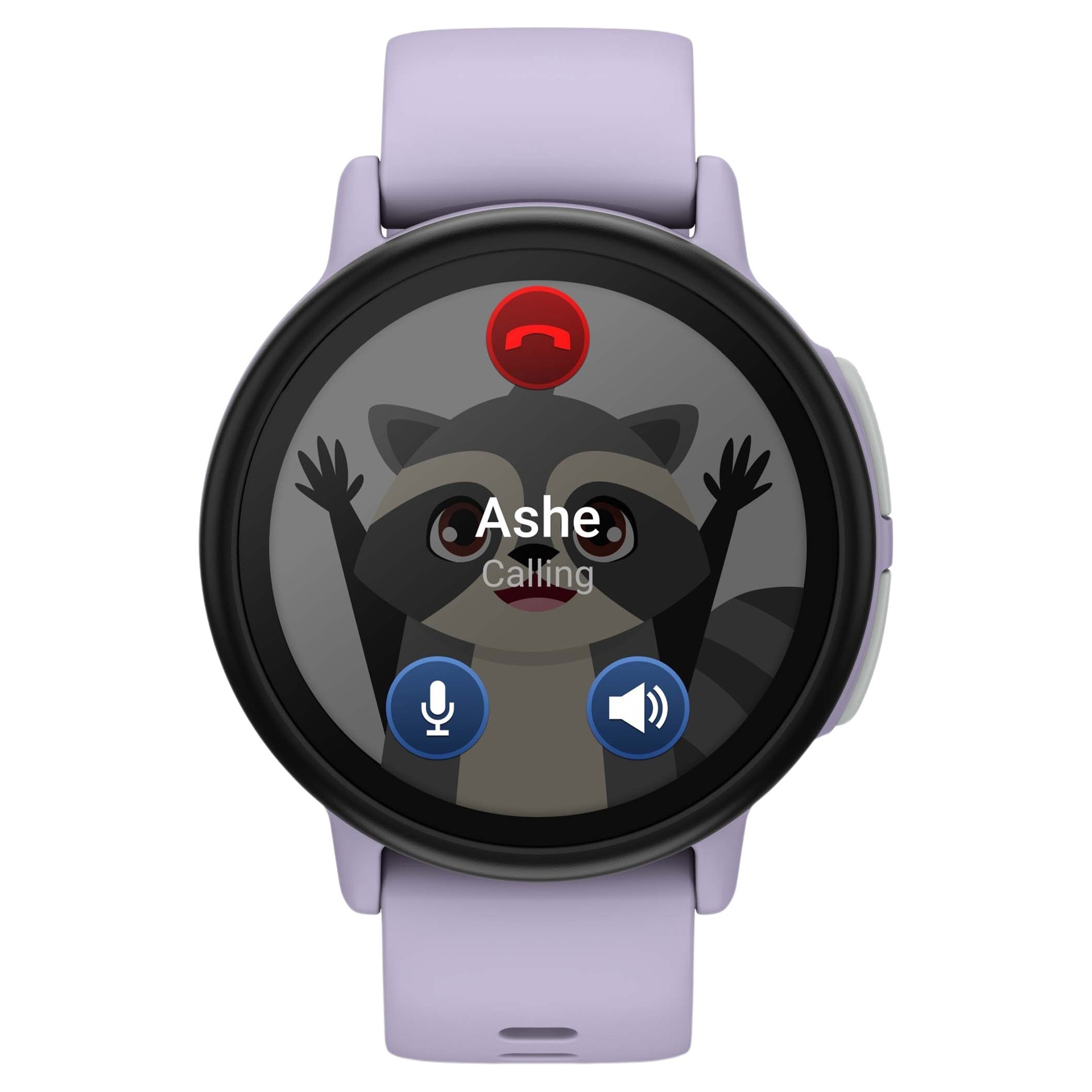 With an active subscription, you can use the Garmin Jr.™ app to send text messages to your child’s Bounce 2 smartwatch. Kids can create their own messages and reply using the built-in full keyboard, complete with emojis and sound emojis, to parent-approved contacts and within family group chats.
