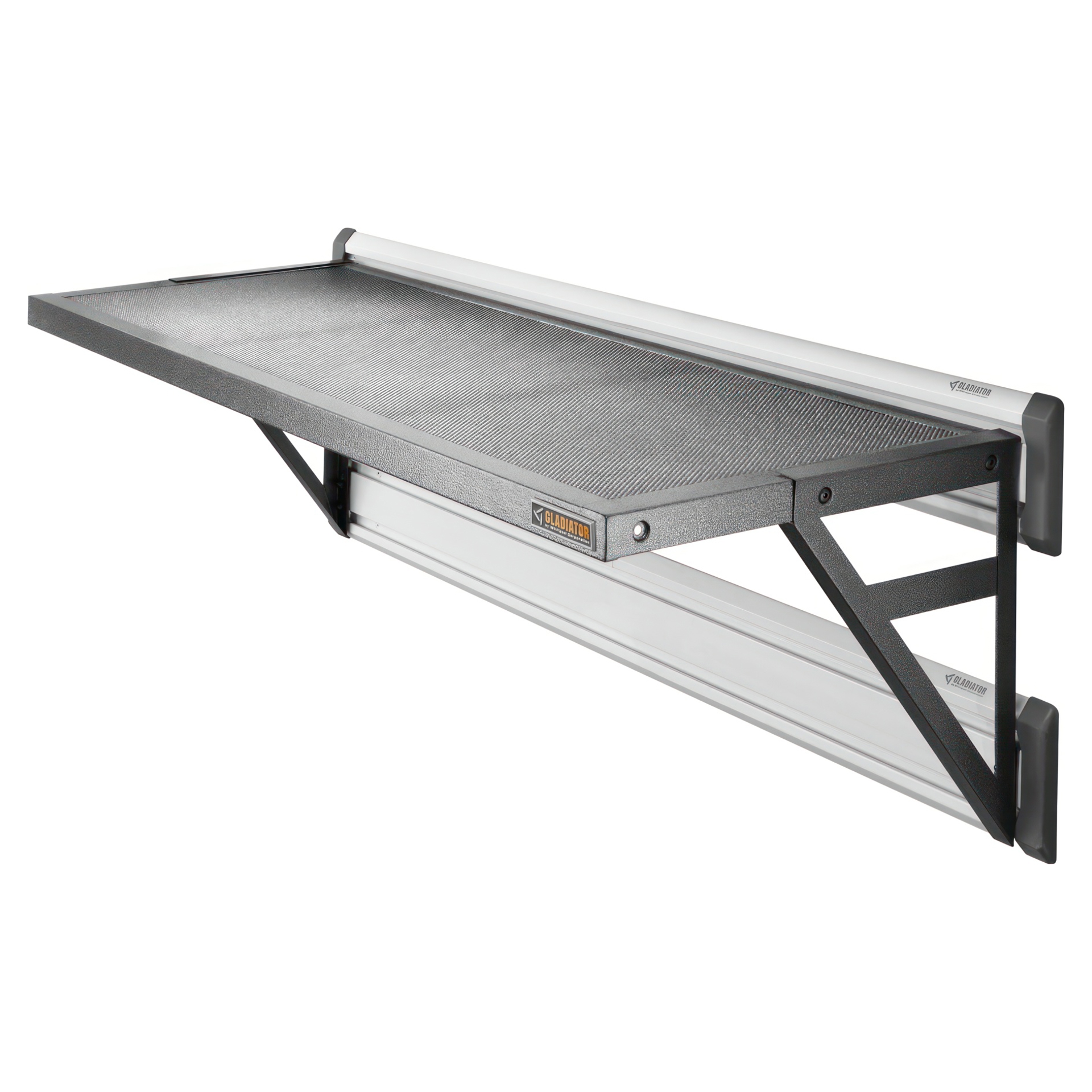 The 45" (114.3 cm) depth of the GearLoft Gladiator shelf is meant for the storage of large items. Its screened surface allows for viewing of contents even when mounted high on the wall. The dual brackets can be placed above or below the shelf for the most efficient storage.