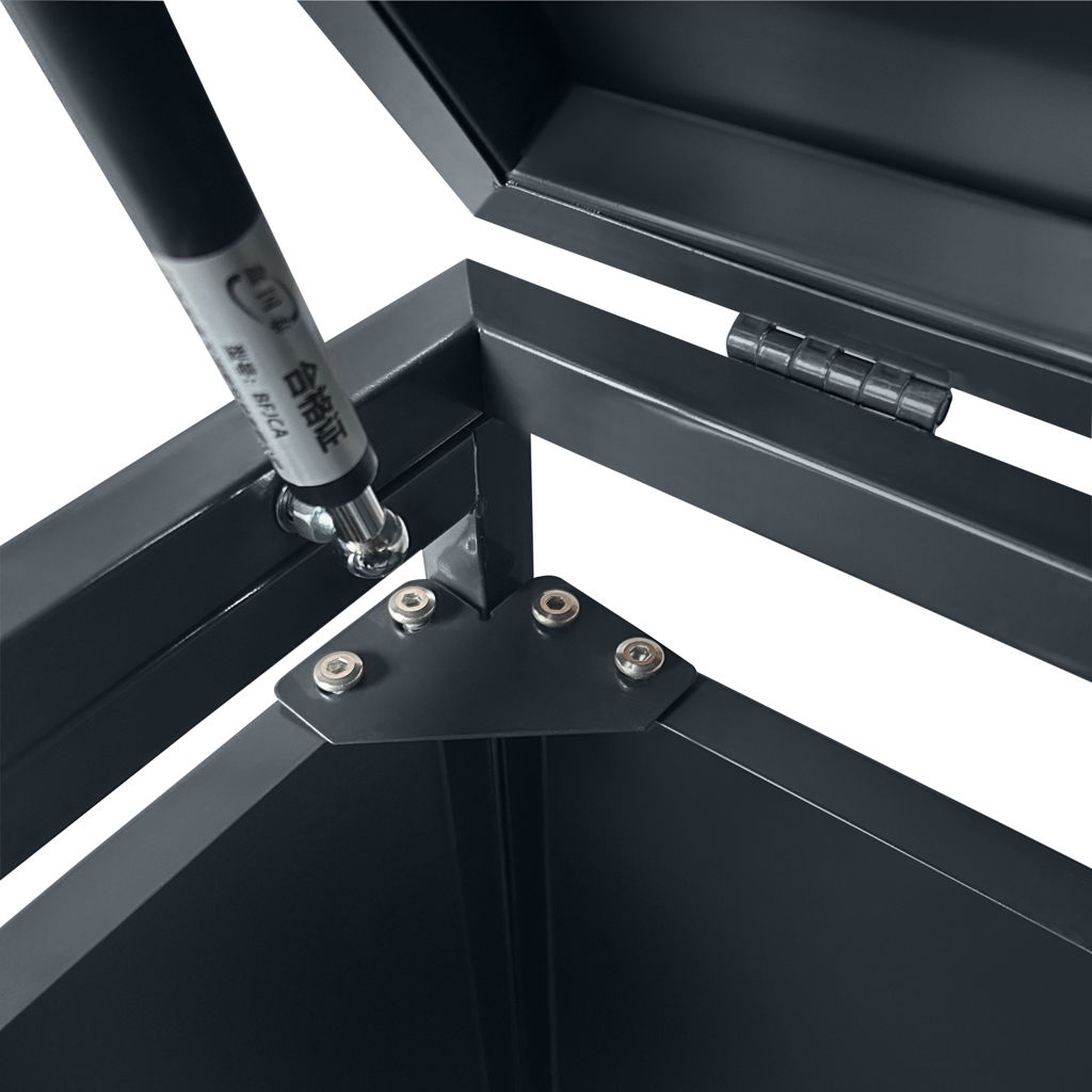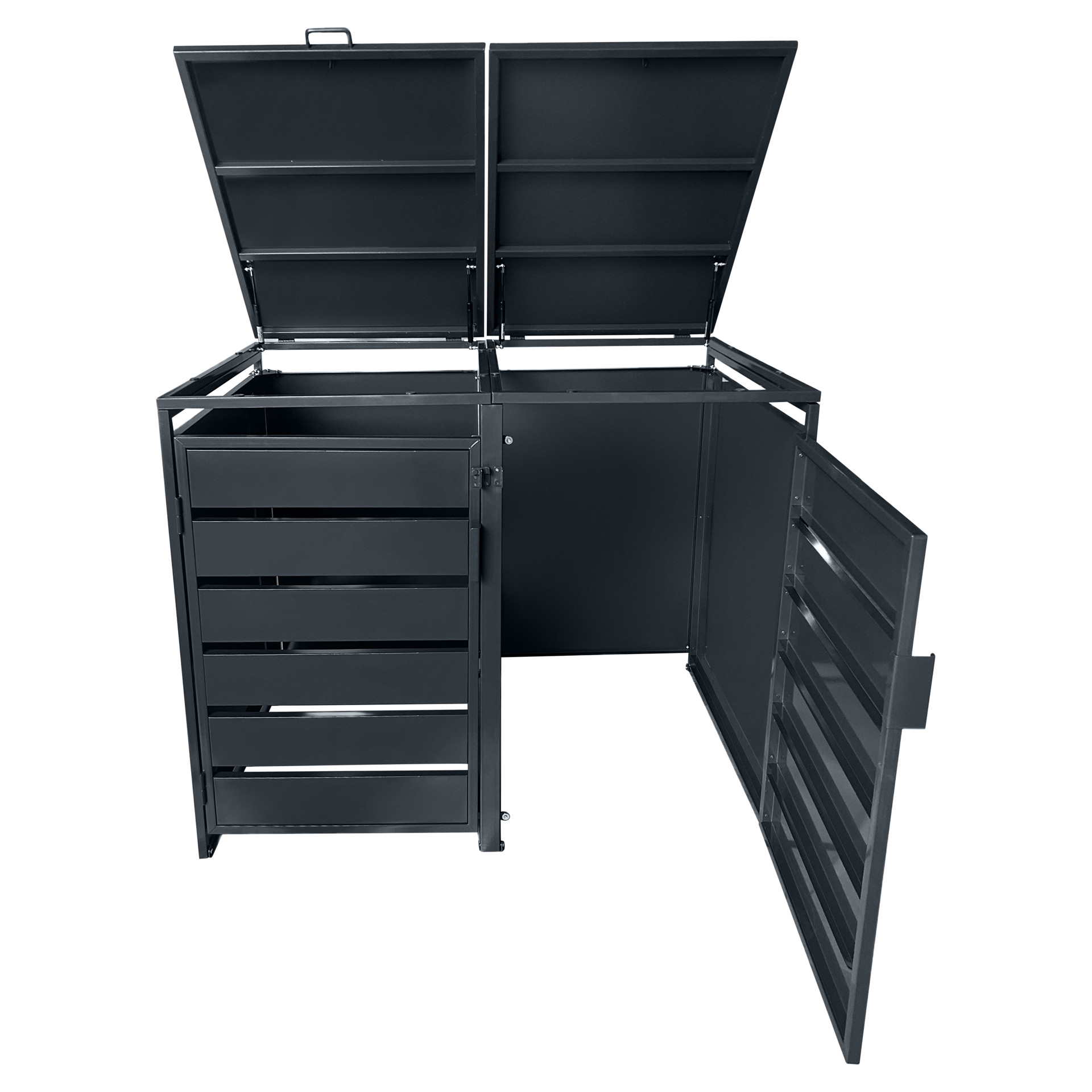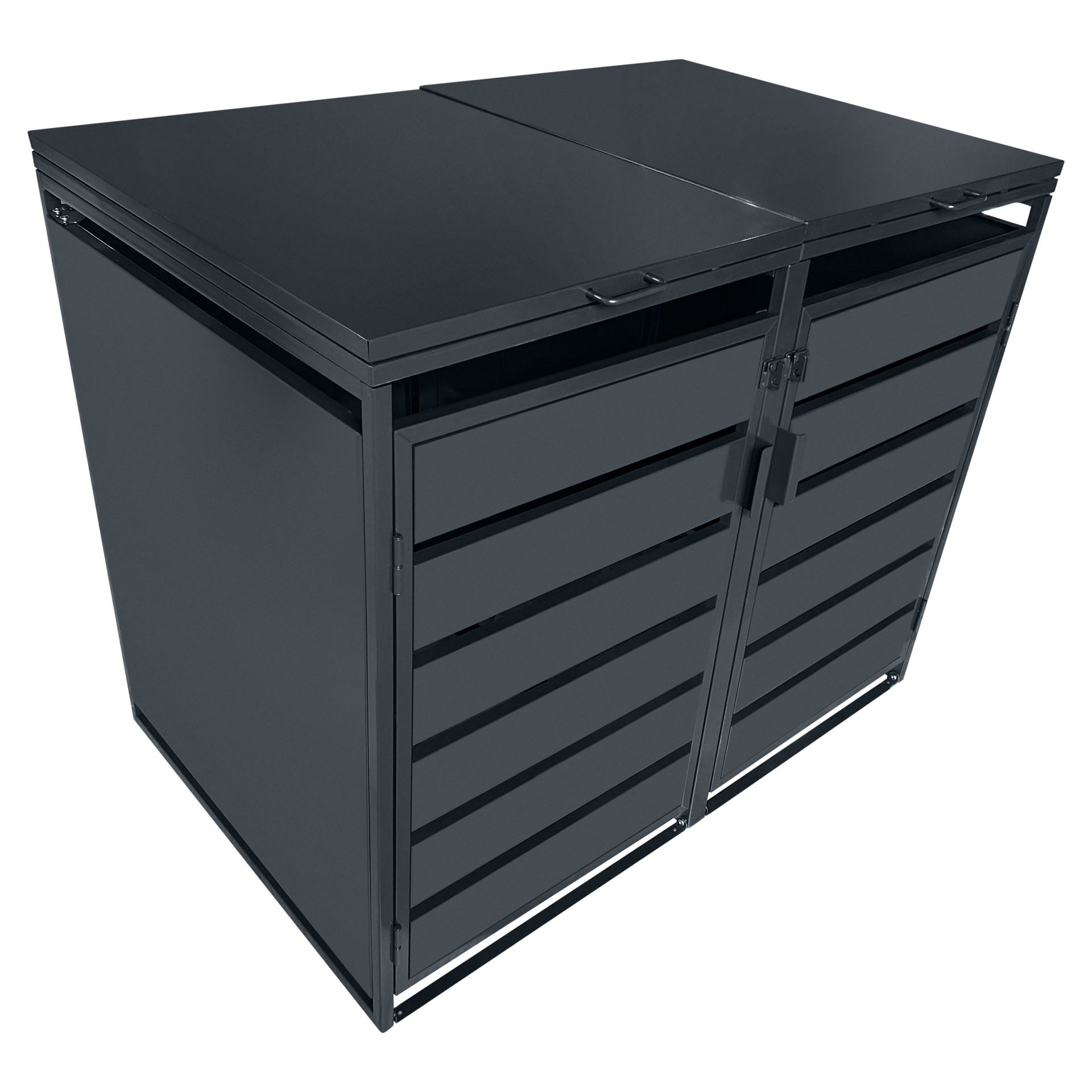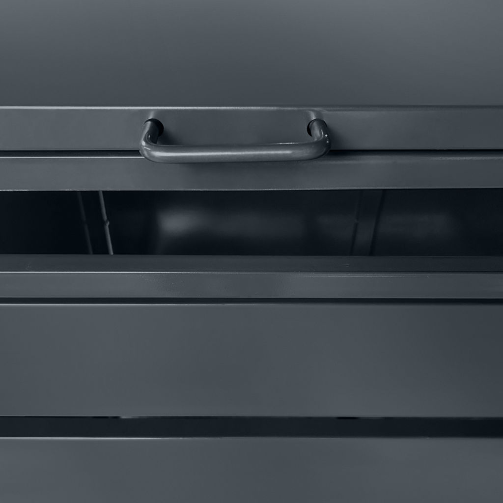 Convenient for everyday use, this shed features two independent top lids with hydraulic pistons for easy opening when disposing of waste. The wide-opening front doors allow you to roll the bins out and place them back effortlessly. Its sturdy construction ensures excellent durability against the elements.