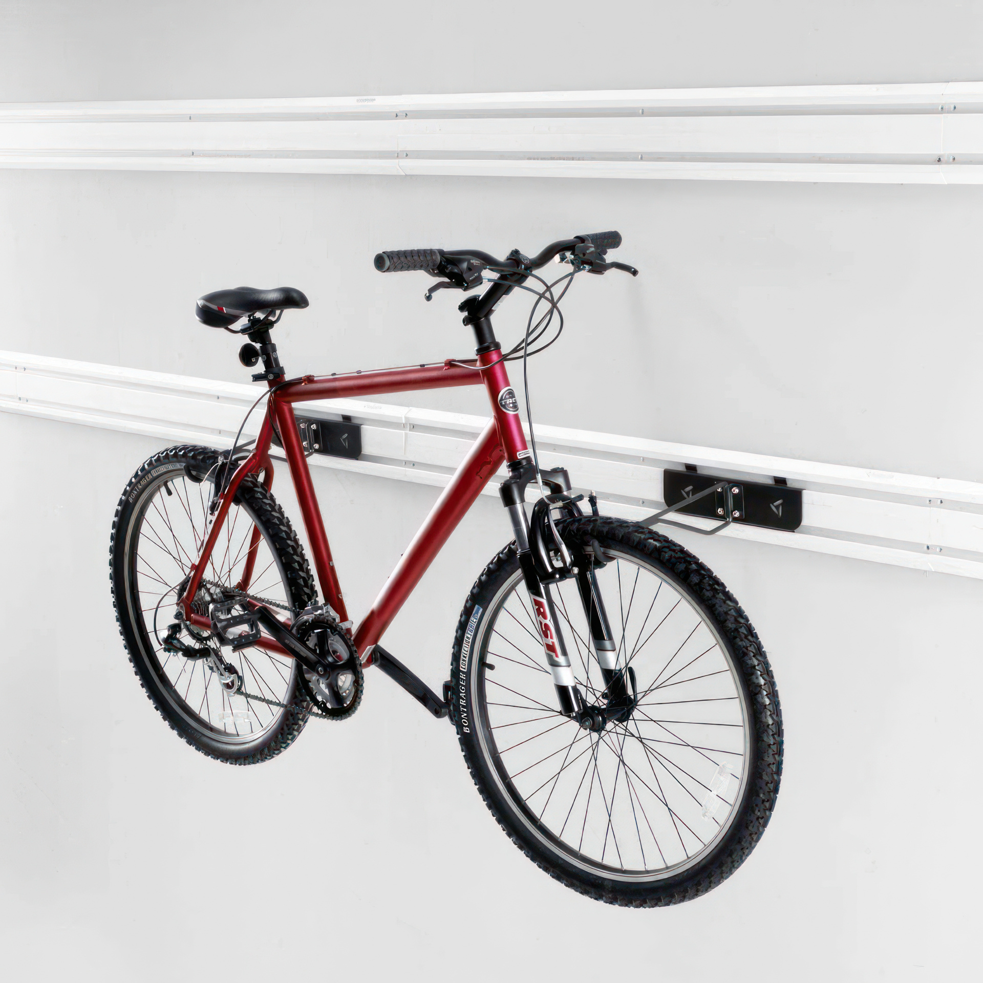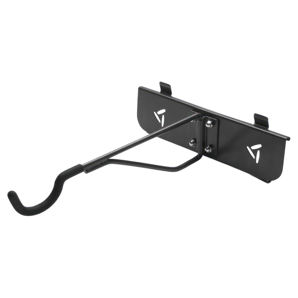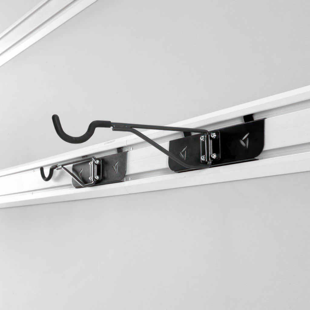 The Gladiator horizontal bike rack allows you to store your bike parallel to the wall. Its rotating arm allows you to easily swing the hook against the wall, so bikes are out of reach when not in use. Protective vinyl end caps prevent scratches and dings on bikes.