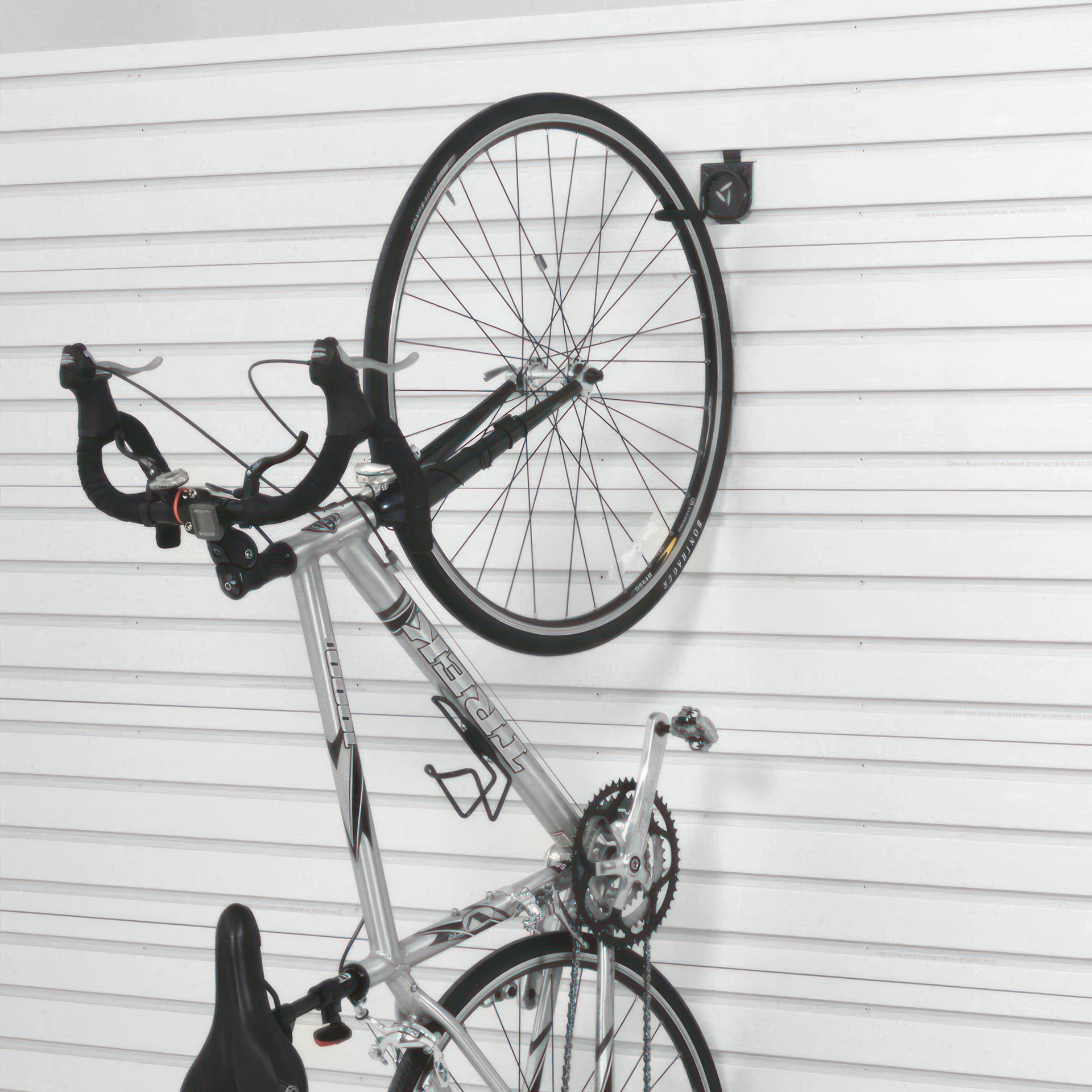 The Gladiator Vertical Bike Rack keeps bikes perpendicular to the floor. These vertical bike racks can support up to 30 pounds (13.6 kg), and are easily repositioned on various Gladiator wall systems. The padded vinyl end caps protect your items from scratches and bumps and the locking tabs securely fasten this hook to the wall.