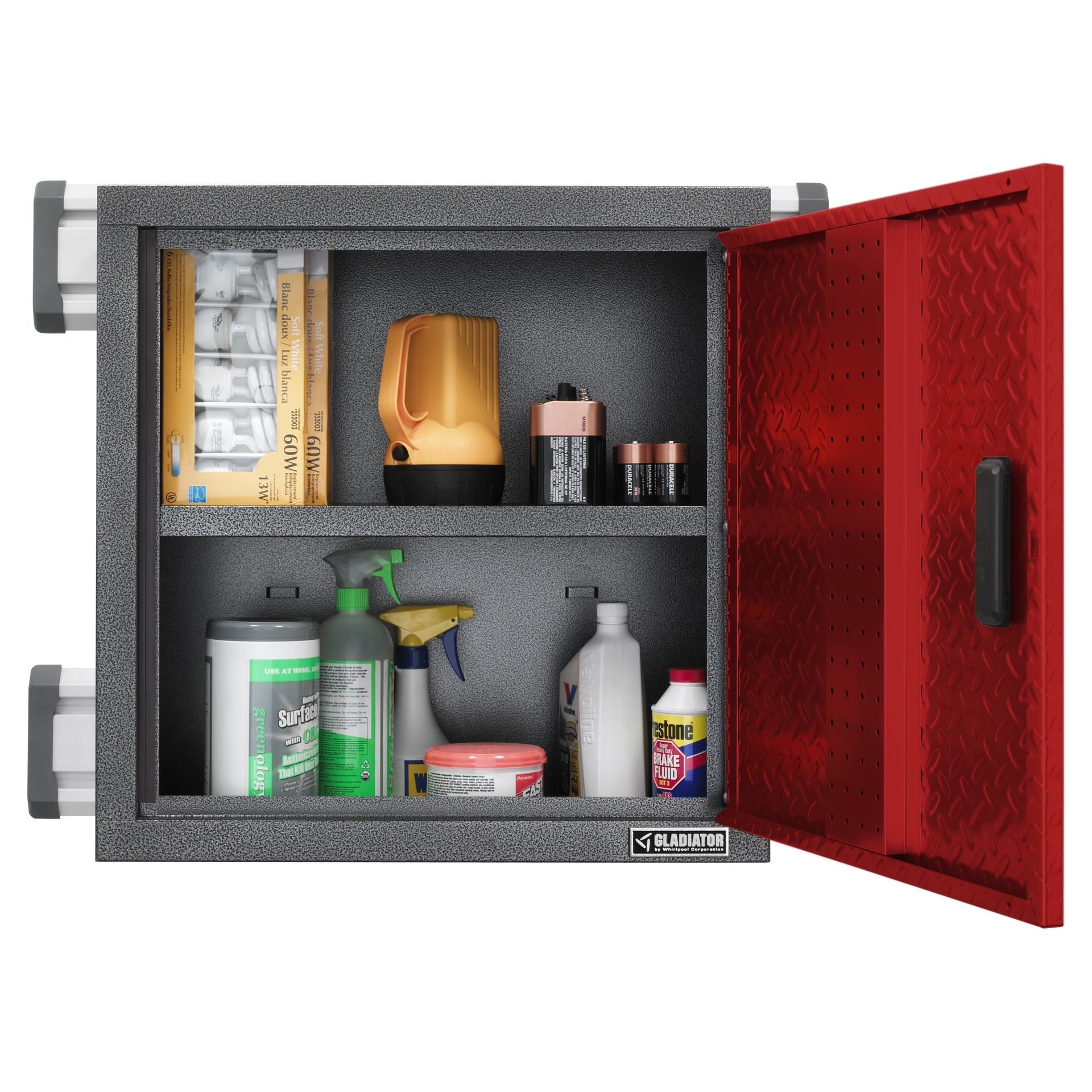 The Gladiator GearBox 24" (61cm) Premier Series Wall Cabinet provides versatility for your storage needs. The Gladiator 24" (61 cm) welded steel wall cabinet is built to last and features our signature textured finish. The wall cabinet conveniently mounts directly to wood drywall studs or Gladiator wall systems. The quality of this GearBox wall cabinet is backed by a no-hassle lifetime limited warranty.