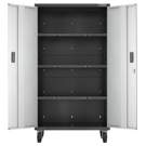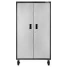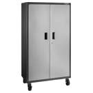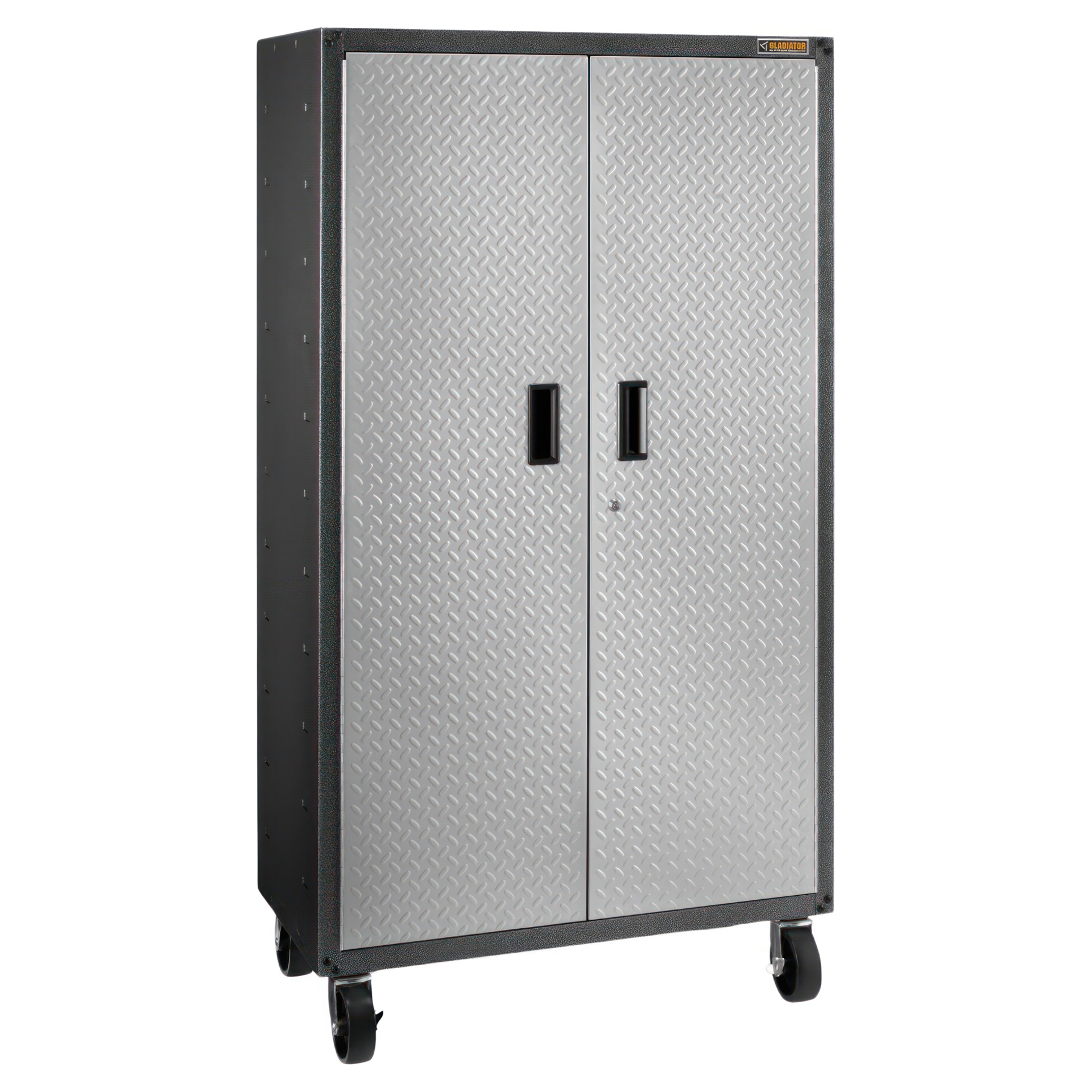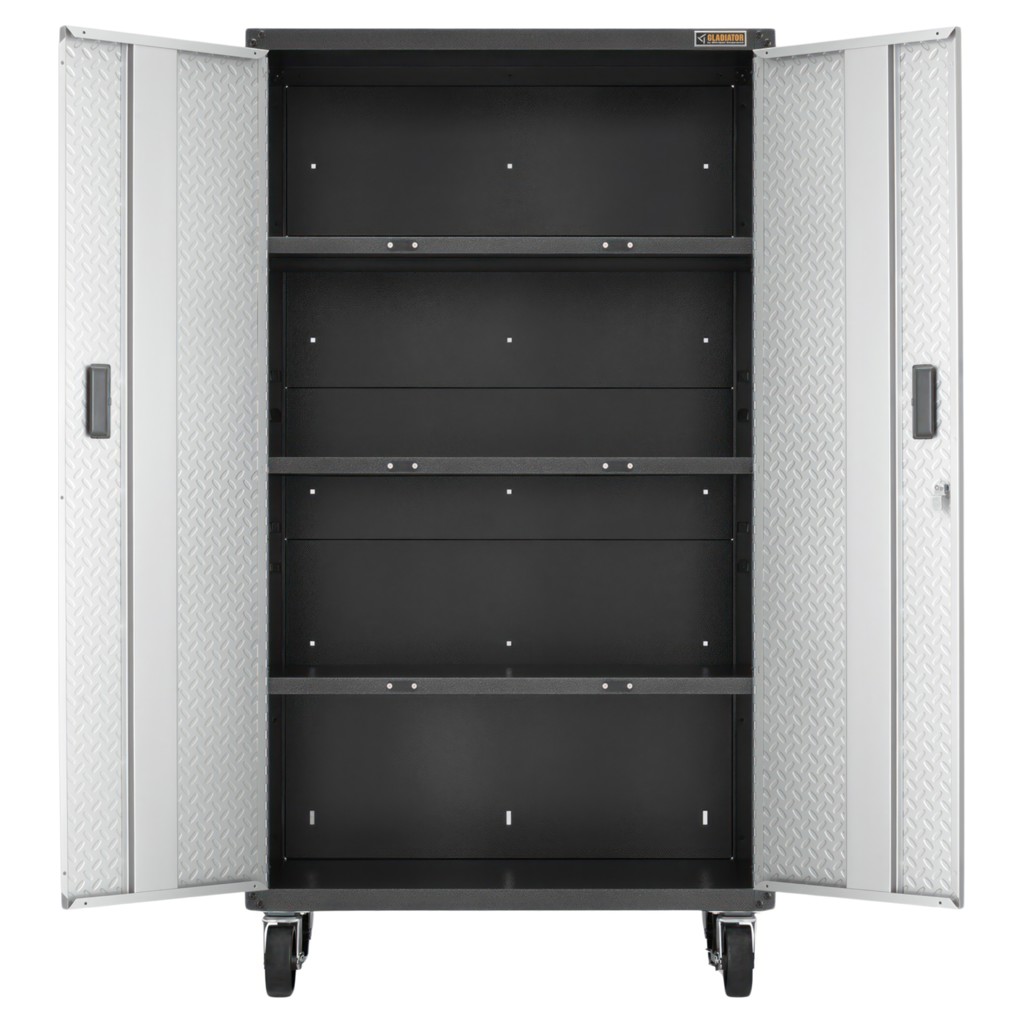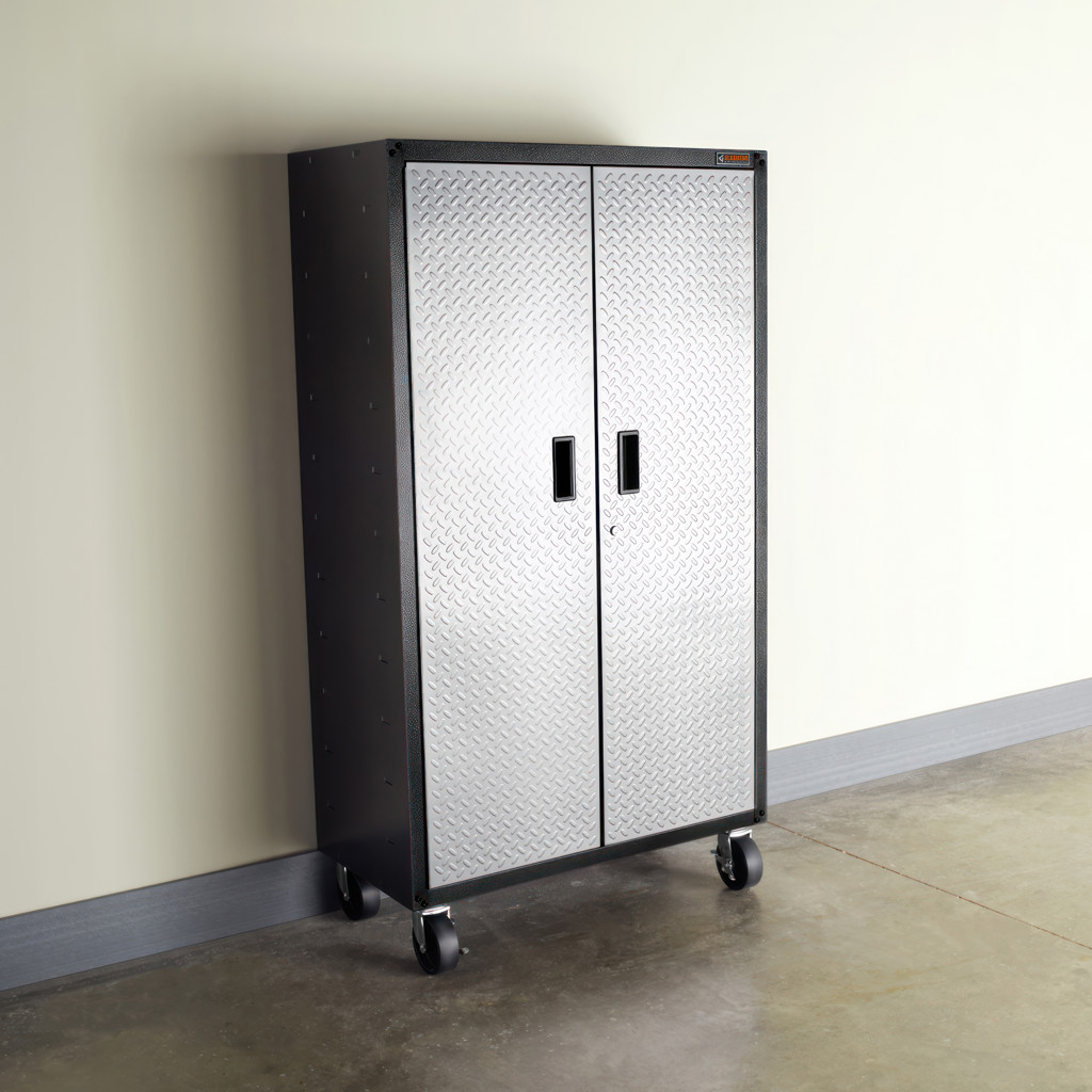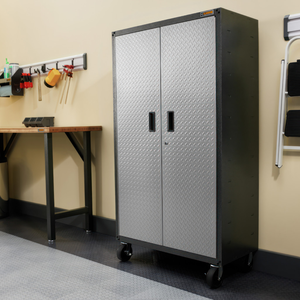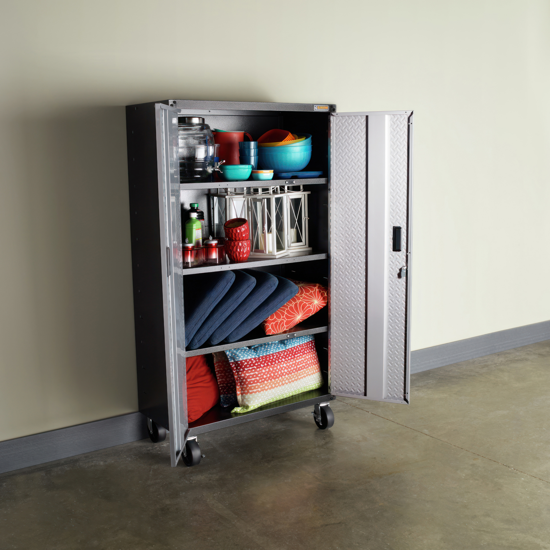 This heavy-duty, multi-purpose cabinet stands over 5 feet tall (152.4 cm), can accommodate a variety of items on its three shelves, and can move with you throughout the garage. The front casters can also lock for stability and the rear casters swivel, giving you the option to move your storage cabinet to suit your different needs.