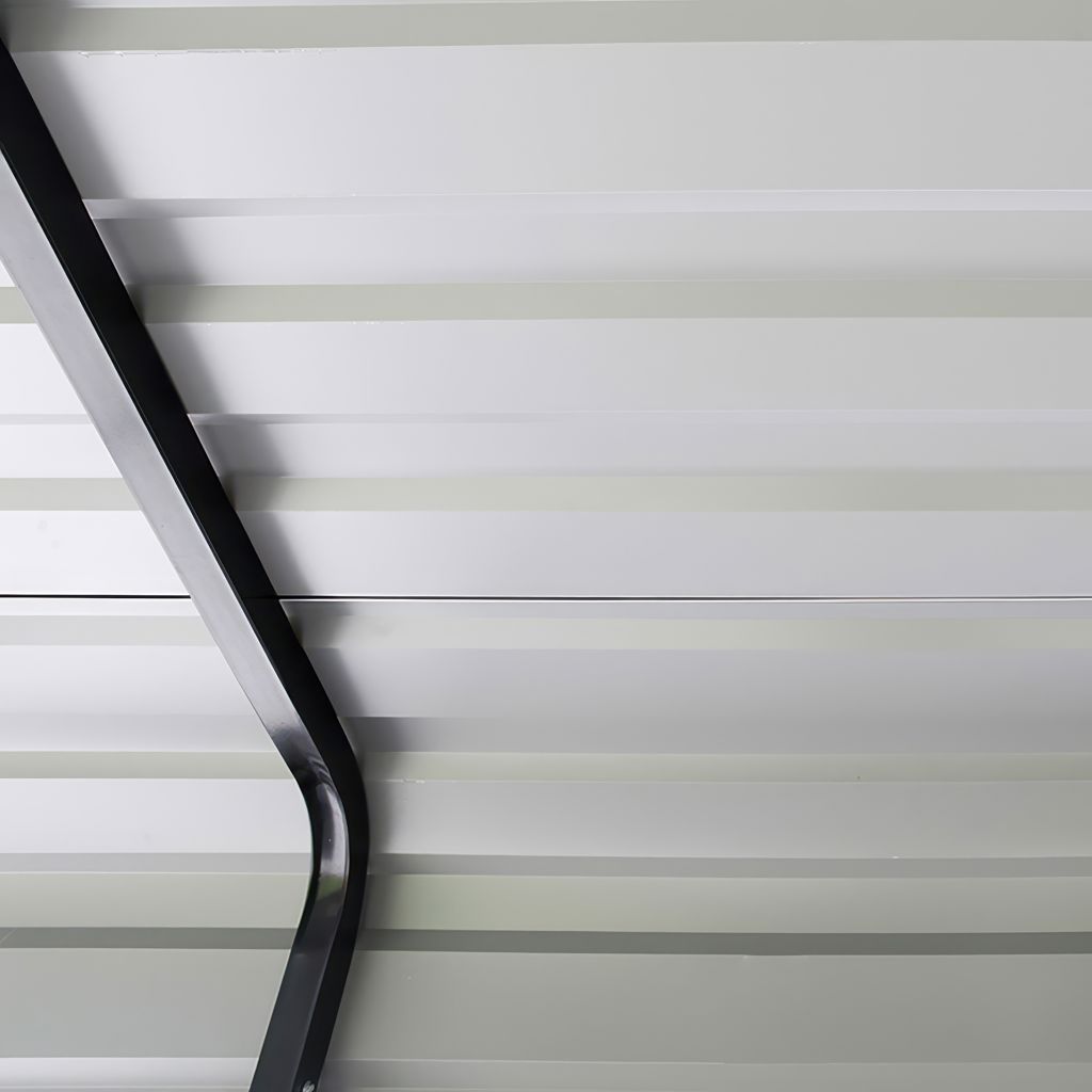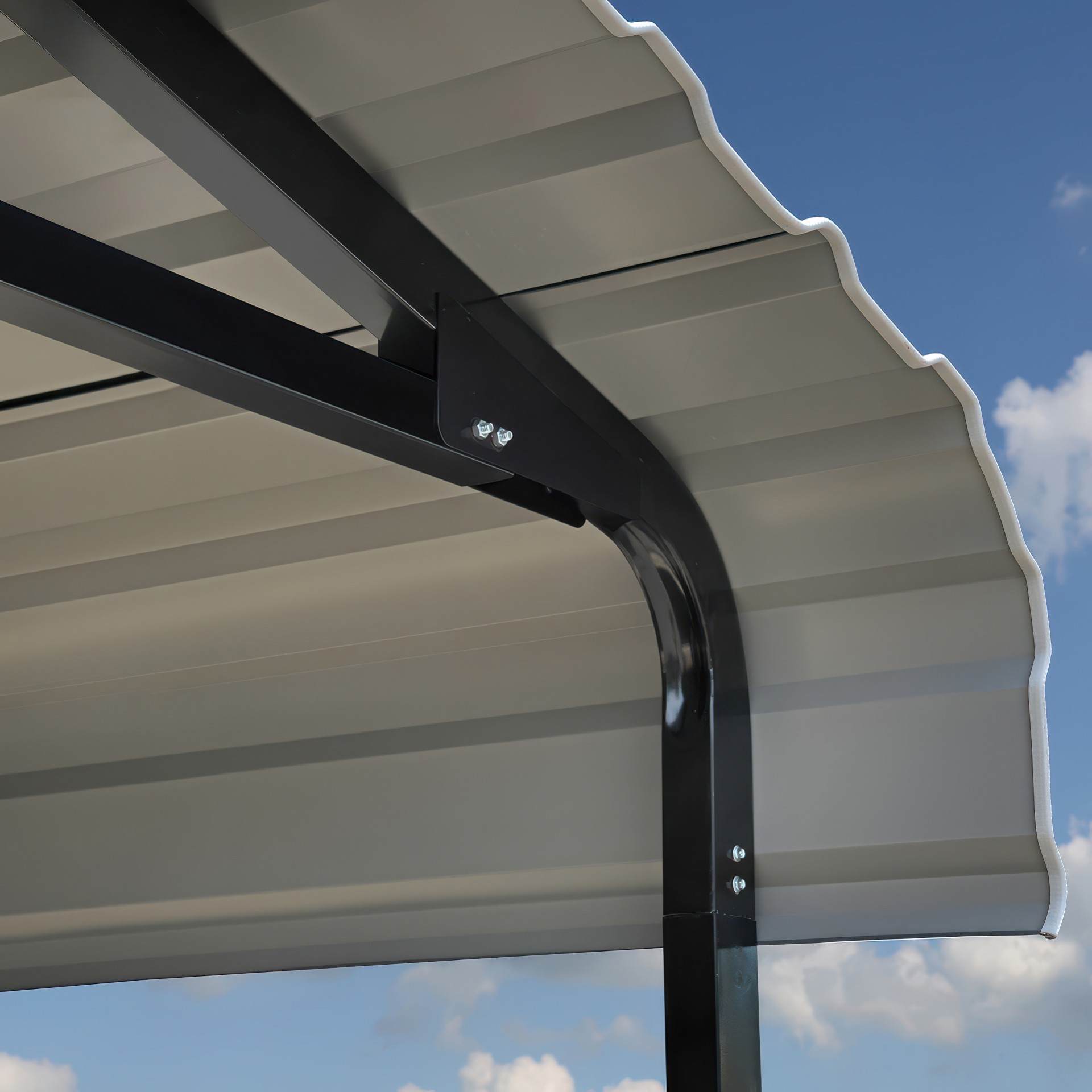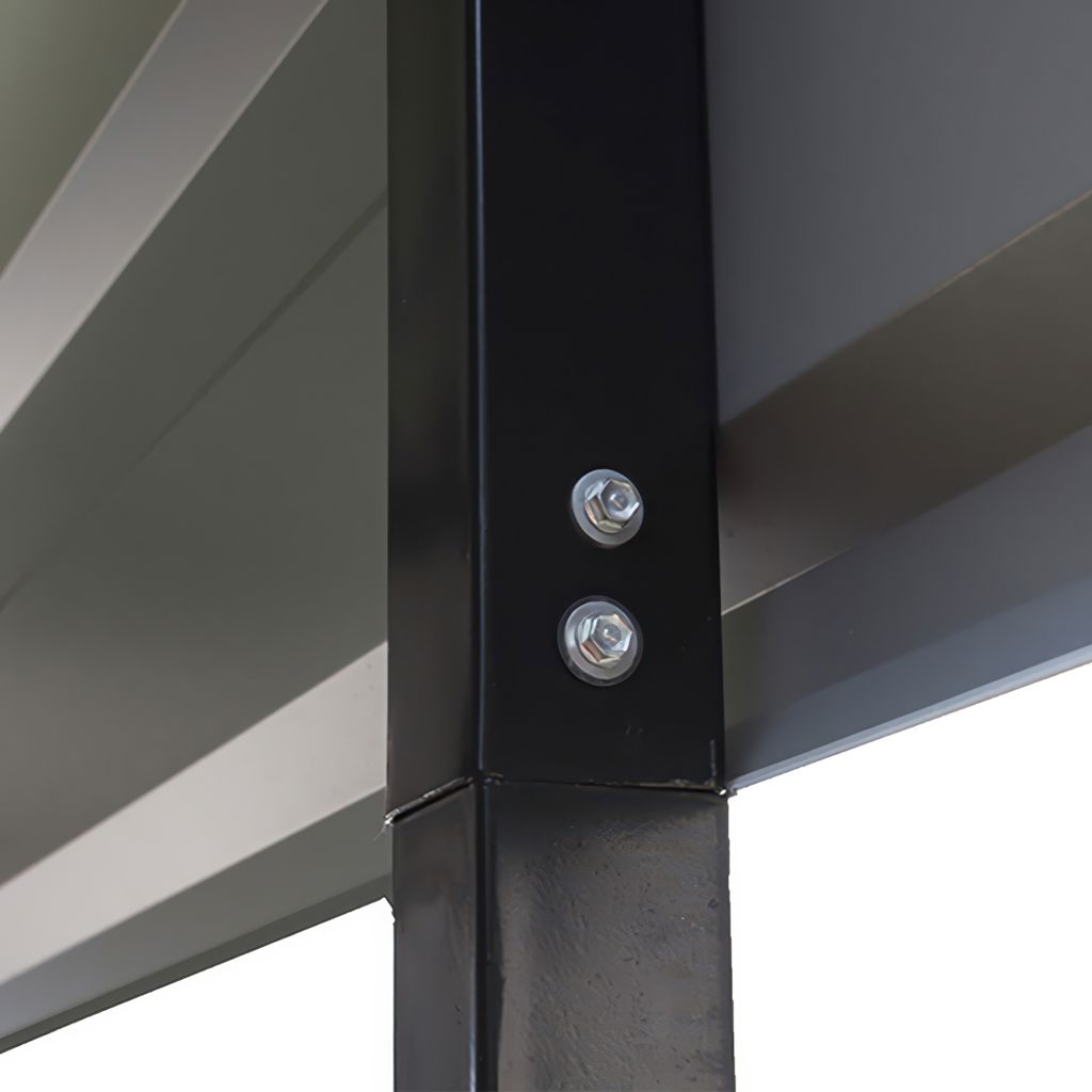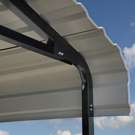 Our carport features a galvanized steel roof with horizontal panels and a powder coated industrial steel frame to resist corrosion and rust.
