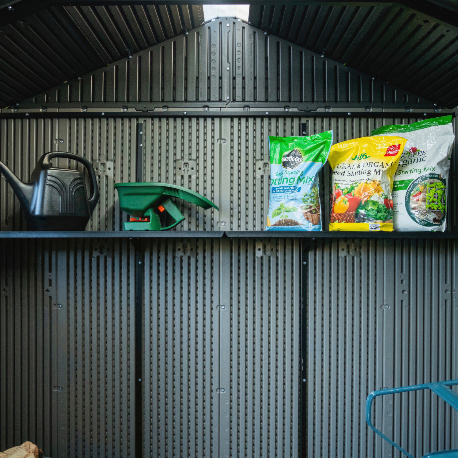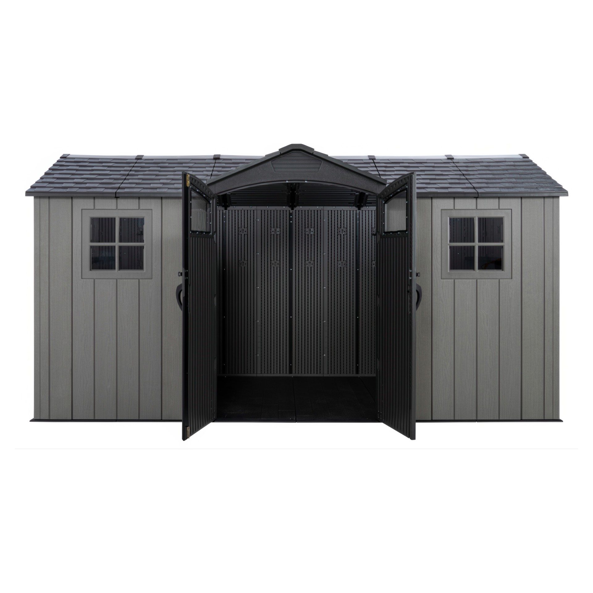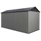 • The shed is made of steel-reinforced high-density polyethylene and a sturdy double wall system for maximum durability and longevity, and heavy-duty steel trusses provide exceptional roof strength.