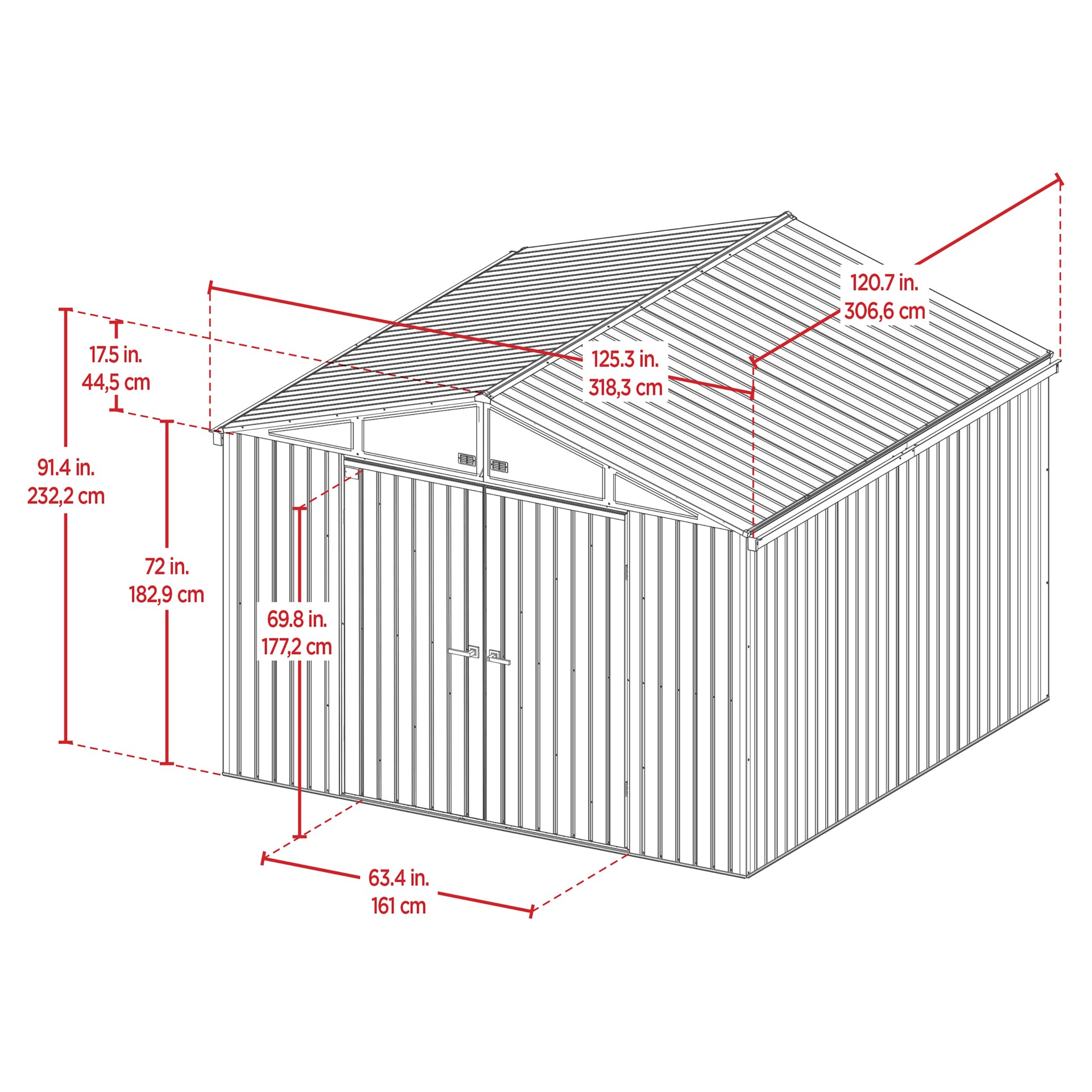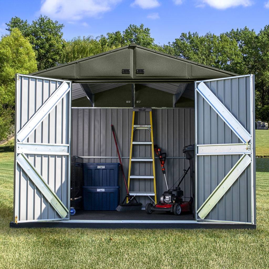 The shed also features a tall 72 in wall height and high peak roof for added vertical storage space, plus extra room to walk around.