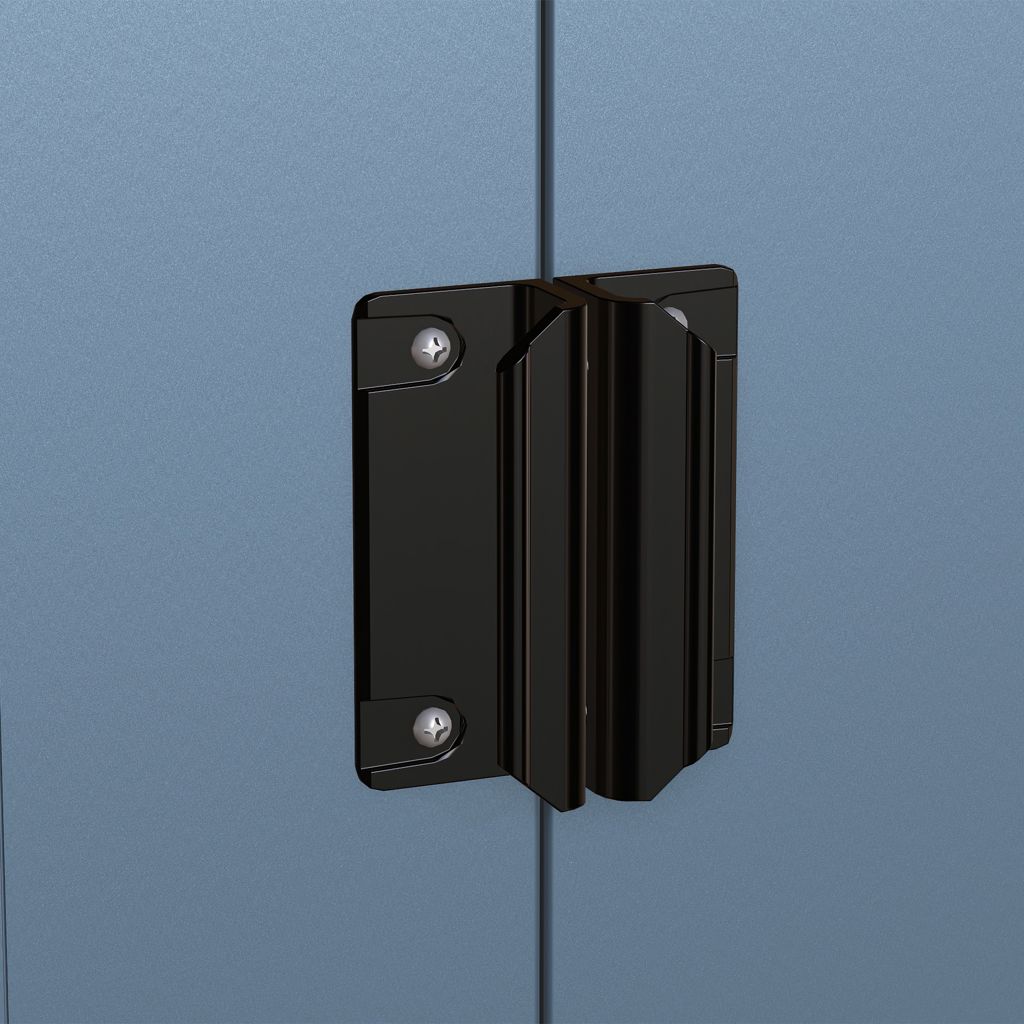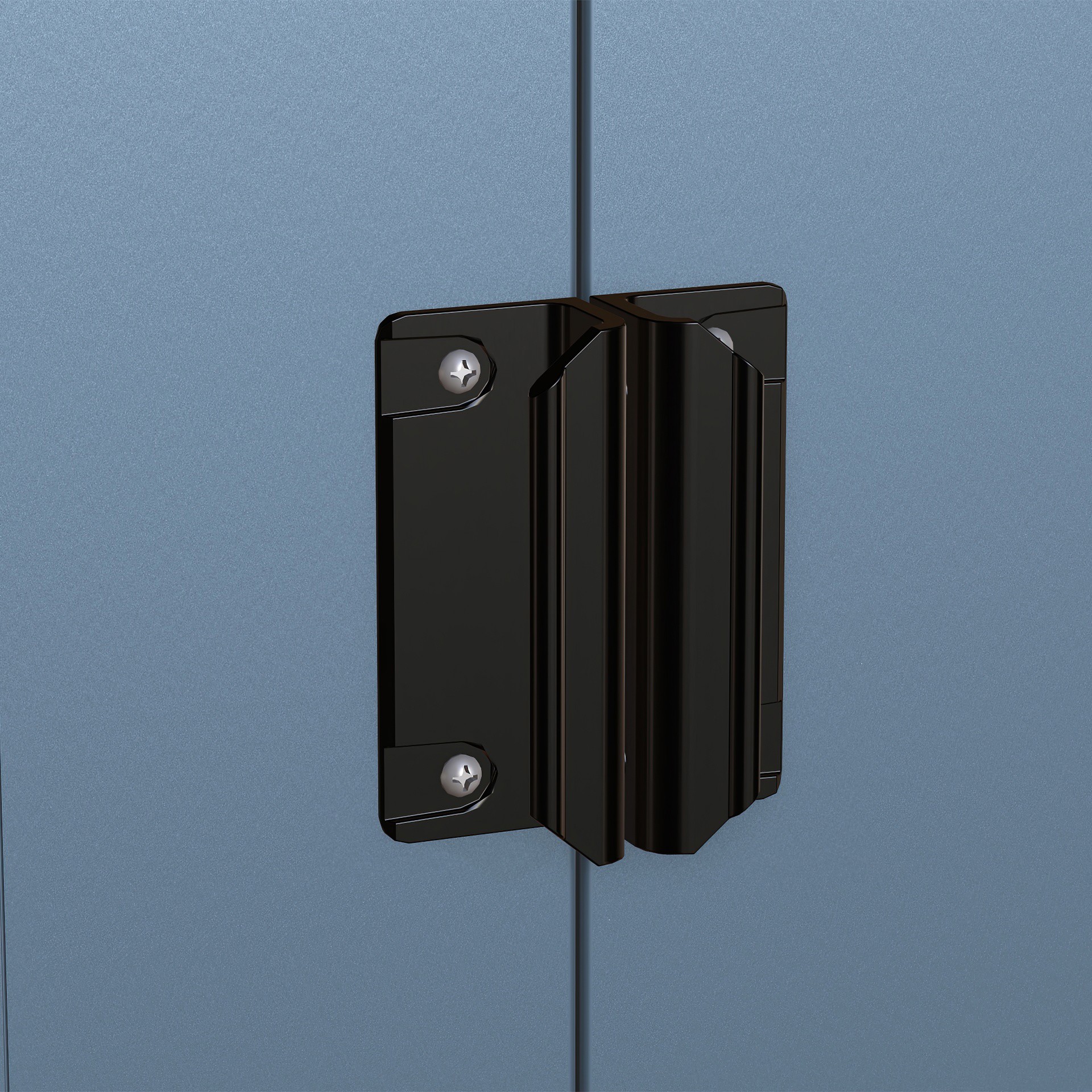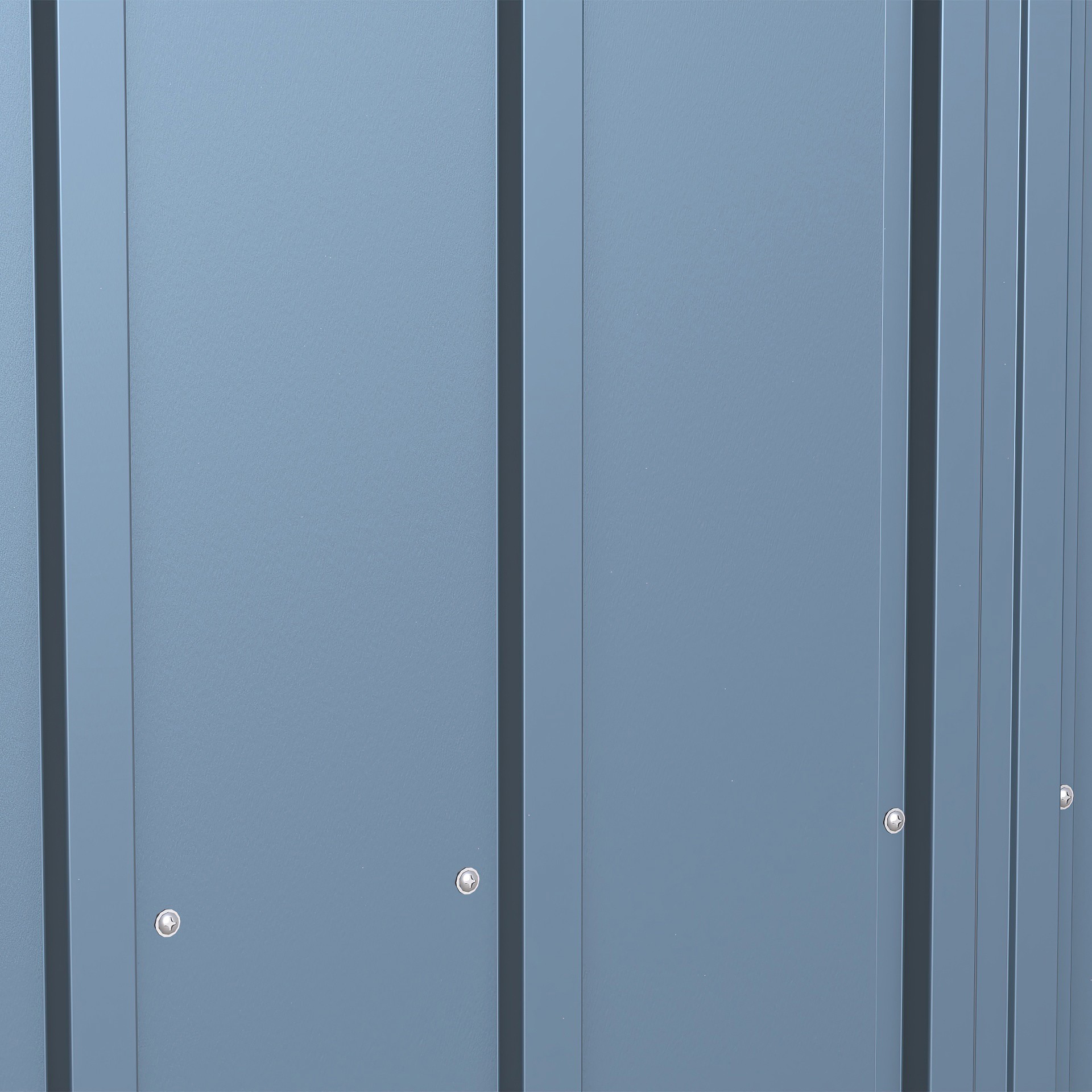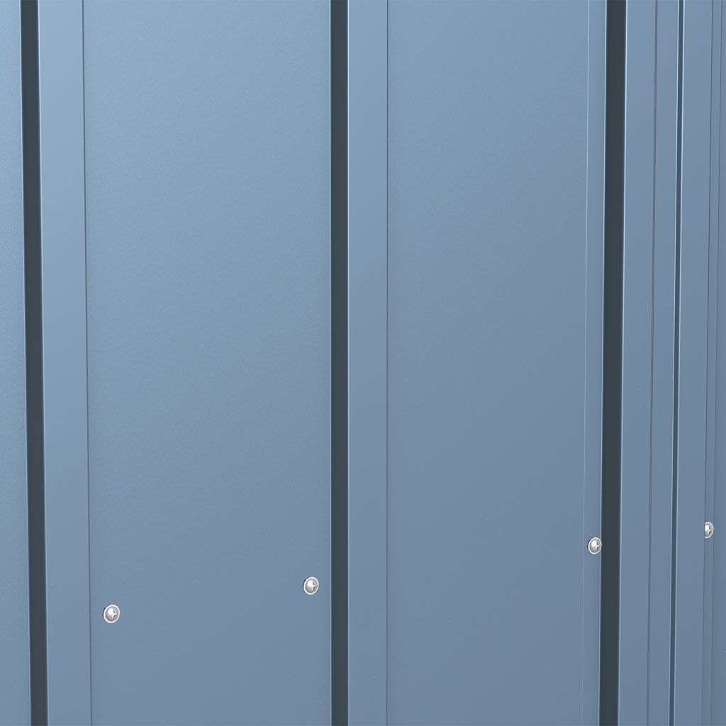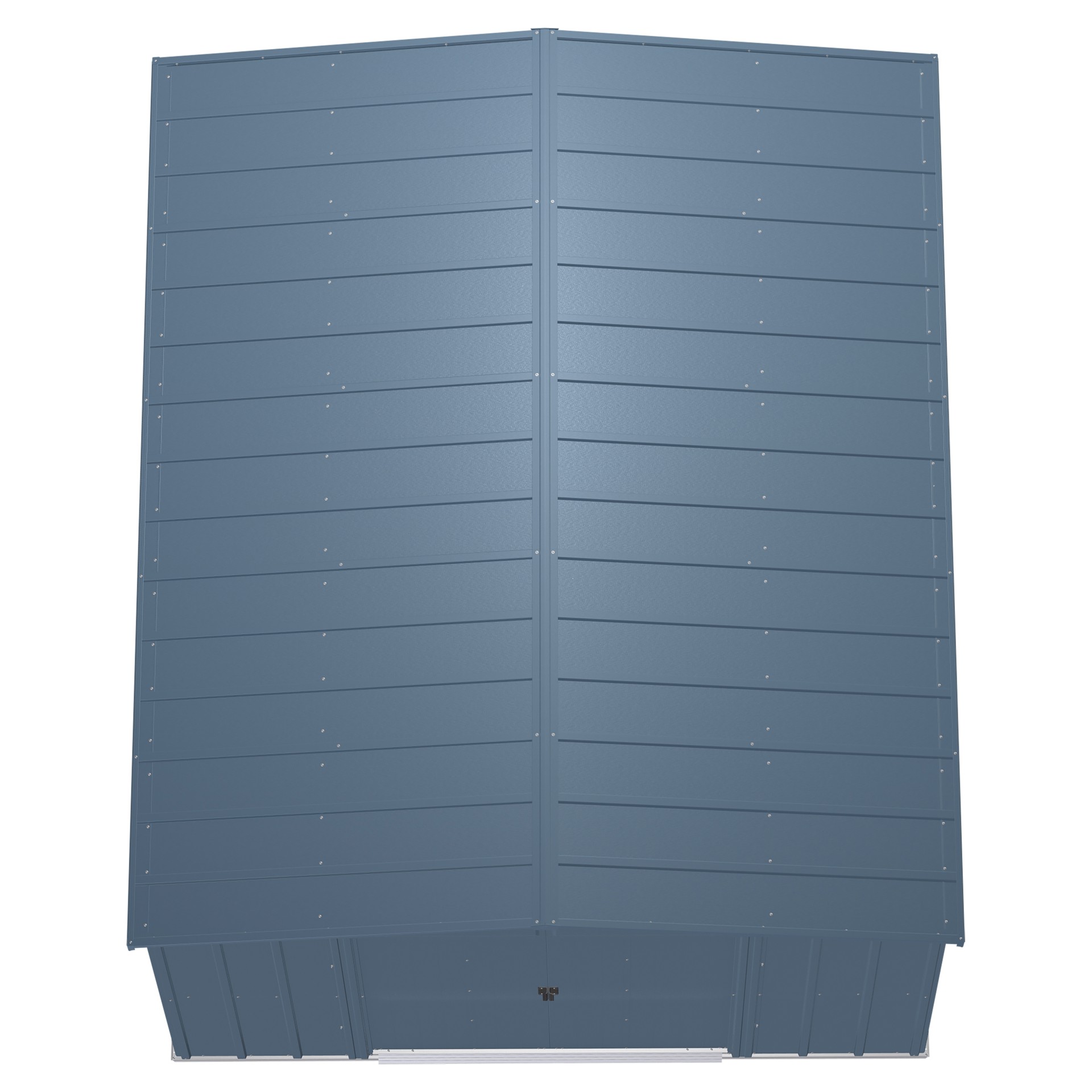 The shed is made of galvanized steel treated to prevent rust and corrosion. Its low gable roof is designed to prevent water from accumulating,